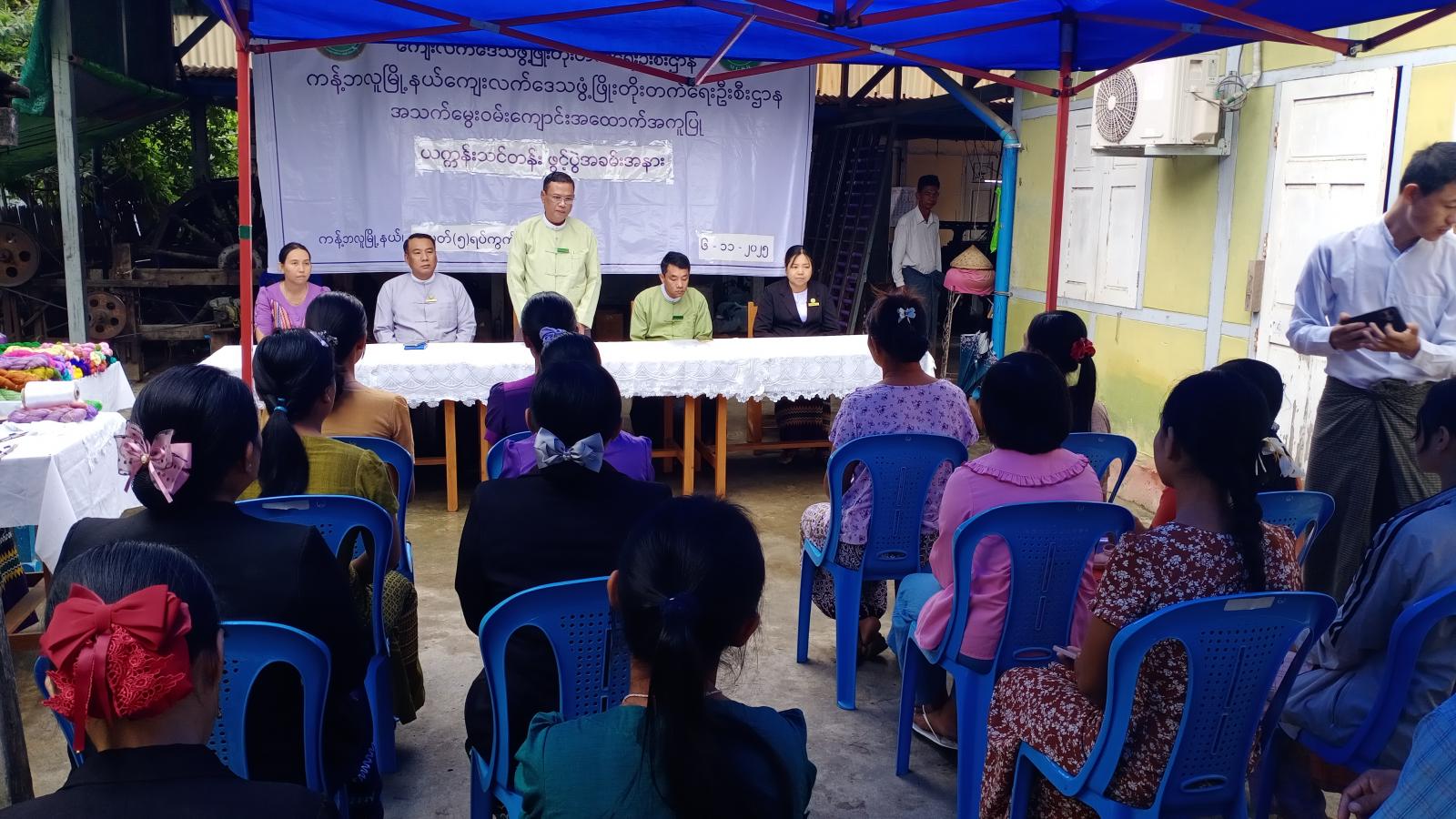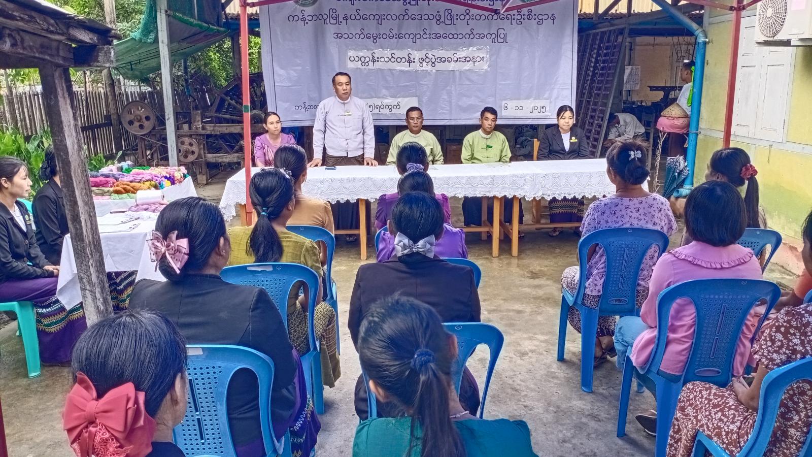 ရှေးဦးစွာ ခရိုင်အထွေထွေအုပ်ချုပ်ရေးဦးစီးဌာန ဒုတိယခရိုင်အုပ်ချုပ်ရေးမှူး ဦးကျော်မင်းထွန်းက သင်တန်းဖွင့်အမှာစကားပြောကြားပြီး ကျေးလက်ဒေသဖွံ့ဖြိုးတိုးတက်ရေးဦးစီး ဌာန ခရိုင်ဦးစီးမှူး ဦးစိုးခိုင်က သင်တန်းဖွင့်လှစ်ရခြင်းနှင့်ပတ်သက်၍ ရှင်းလင်းပြောကြားသည်။ထို့ နောက် ကျေးလက်ဒေသဖွံ့ဖြိုးတိုးတက်ရေးဦးစီးဌာန မြို့နယ်ဦးစီးမှူး ဒေါ်တင်တင်ခိုင်က သင်ထောက်ကူပစ္စည်းများပေးအပ်ပြီး သင်တန်းနည်းပြဆရာမ ဒေါ်နှင်းယုကျော်က သင်တန်းတွင် သင်ကြားပေးမည့် ဘာသာရပ်များနှင့်ပတ်သက်၍ ရှင်းလင်းပြောကြားသည်။