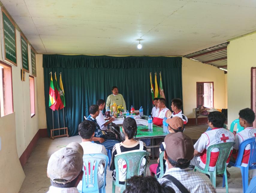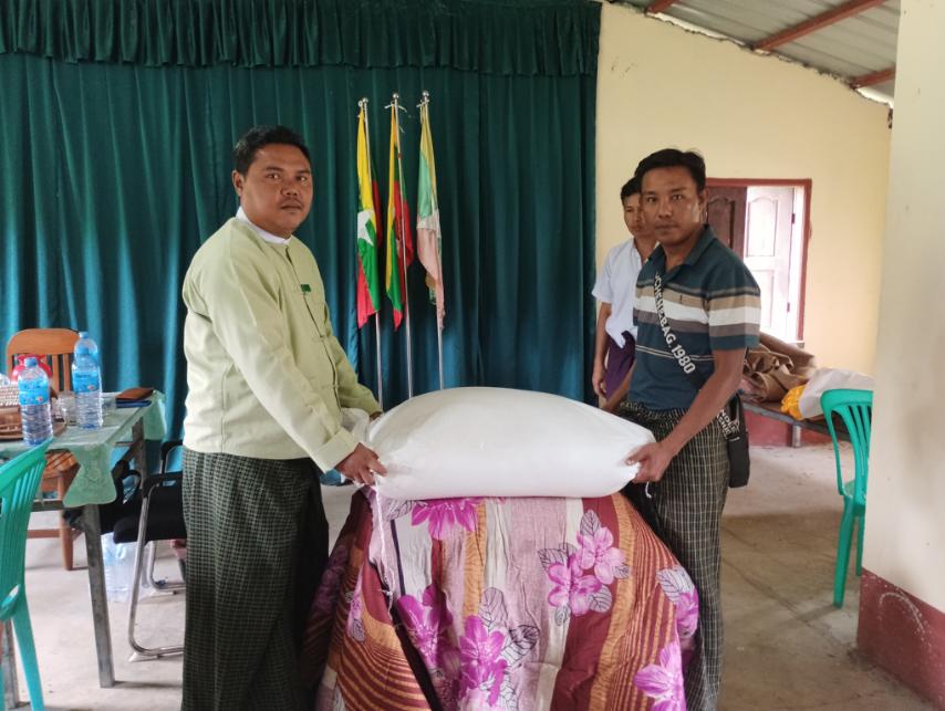 အခမ်းအနားတွင် မြို့အုပ်ချုပ်ရေးမှူး ဦးမြတ်ဟိန်းထွန်းကယာယီနေရပ်စွန့်ခွာပြည်သူများအား မိမိတို့နေထိုင်နေသည့်အချိန်အခါတွင် အခက်အခဲများရှိပါကဆွေးနွေးတင်ပြကြရန် ပြောကြားပြီး ဆန်အိတ်များ ပေးအပ်ခြင်းနှင့်ပတ်သက်၍ ရှင်းလင်းပြောကြားခဲ့သည်။ ဆက်လက်၍ မြို့အုပ်ချုပ်ရေးမှူး ဦးမြတ်ဟိန်းထွန်းနှင့် မြန်မာနိုင်ငံကြက်ခြေနီအသင်းမှ တာဝန်ရှိသူများက ယာယီနေရပ်စွန့်ခွာ အိမ်ထောင်စု (၇၂) စုအား အိမ်ထောင်စုတစ်စုလျှင် ဆန်တစ်အိတ်နှုန်းဖြင့် စုစုပေါင်းဆန်အိတ်(၇၅)အိတ်အား လက်ဝယ်အရောက် ပေးအပ်ခဲ့ကြောင်း သိရသည်။