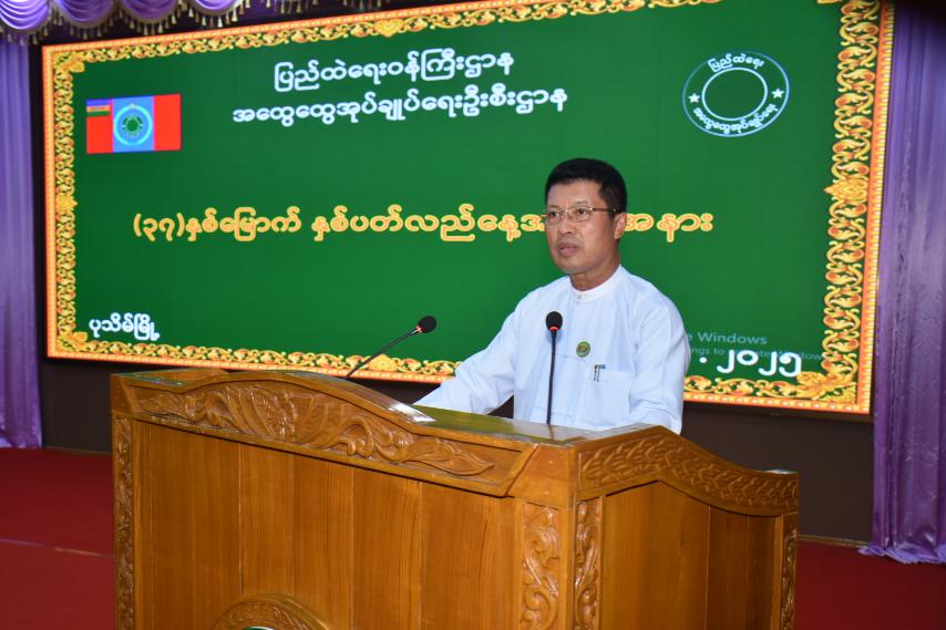 ဦးစွာ တိုင်းဒေသကြီးဝန်ကြီးချုပ်က “အထွေထွေအုပ်ချုပ်ရေးဦးစီးဌာနသည် ရှည်လျားသည့်သမိုင်းတလျှောက် နိုင်ငံတော်နှင့်အစိုးရအပေါ် တာဝန်ကျေပွန်စွာ တာဝန်ထမ်းဆောင်လျက်ရှိသည့် ဌာနတစ်ခုဖြစ်ပြီး နိုင်ငံတော်၏ အုပ်ချုပ်ရေးယန္တရား အဆင်ပြေချောမွေ့စွာ လည်ပတ်နိုင်စေရန်အတွက် အစိုးရ၏မူဝါဒများ၊ လမ်းညွှန်ချက်များနှင့်အညီ အုပ်ချုပ်ရေးလုပ်ငန်းတာဝန်များကို အကောင်အထည်ဖော်ဆောင်ရွက်နိုင်ရေးအတွက် ဒေသန္တရအုပ်ချုပ်ရေးယန္တရားတွင် စီမံခန့်ခွဲခြင်း၊ ကြီးကြပ်ခြင်း၊ ပေါင်းစပ်ညှိနှိုင်းခြင်းစသည့် လုပ်ငန်းတာဝန်များအား ဥပဒေ၊ နည်းဥပဒေ၊ အမိန့်၊ ညွှန်ကြားချက်နှင့်အညီ တာဝန်ယူမှု၊ တာဝန်ခံမှုရှိစွာဖြင့် ကြိုးပမ်းဆောင်ရွက်ရမည်ဖြစ်သကဲ့သို့ လိုက်နာစောင့်ထိန်းရမည့် ကျင့်ဝတ်စည်းကမ်းများကိုလည်း လေးစားလိုက်နာသွားကြရမည်ဖြစ်ပါကြောင်း၊ လက်ရှိကာလတွင်လည်း အမျိုးသားကာကွယ်ရေးနှင့်လုံခြုံရေး ကောင်စီ၏ ဦးတည်ချက်များကို အောင်မြင်စွာ အကောင်အထည်ဖော်ဆောင်ရွက်နိုင်ရေး အထွေထွေအုပ်ချုပ်ရေးဦးစီးဌာနရုံးအဆင့်ဆင့်မှ ဝန်ထမ်းများအနေဖြင့် အုပ်ချုပ်ရေးကဏ္ဍမှာ ပါဝင်ထမ်းဆောင်နေသည့် ဝန်ထမ်းများဖြစ်သည်နှင့်အညီ ပေးအပ်သည့်လုပ်ငန်းတာဝန်များကိုကျေပွန်စွာဖြင့် ထမ်းဆောင်သွားရမည်ဖြစ်သကဲ့သို့ လာမည့်ဒီဇင်ဘာ(၂၈)ရက်နေ့တွင်ကျင်းပမည့် ပါတီစုံဒီမိုကရေစီအထွေထွေရွေးကောက်ပွဲ အောင်မြင်စွာကျင်းပနိုင်ရေးအတွက်လည်း ဝန်ထမ်းများအနေဖြင့် ပါတီနိုင်ငံရေးကင်းရှင်းစွာဖြင့် ကျရာအခန်းကဏ္ဍမှ ပါဝင်ကြိုးပမ်းဆောင်ရွက်ကြရမည် ဖြစ်ပါကြောင်း၊ အထွေထွေအုပ်ချုပ်ရေးဦးစီးဌာနသည် နိုင်ငံတော်အုပ်ချုပ်ရေးယန္တရားတွင် အခြေခံကျသည့် ဌာနတစ်ခုဖြစ်သည့်အတွက် နိုင်ငံတော်၏သစ္စာကို စောင့်သိလျက်အစိုးရ၏မူဝါဒများကို သက်ဆိုင်ရာဌာန၊ အဖွဲ့အစည်းများ ပြည်သူများနှင့်အတူ ပူးပေါင်းဆောင်ရွက်အကောင်အထည်ဖော်ကြရမည်ဖြစ်ကြောင်း၊ နိုင်ငံတော်၏အကျိုး၊ ဒေသ၏အကျိုး၊ ပြည်သူလူထုအကျိုးကို အစဉ်သယ်ပိုးနိုင်သည့် အရည်အသွေးပြည့်ဝသော အုပ်ချုပ်ရေးဝန်ထမ်းကောင်းများဖြစ်အောင် ကြိုးပမ်းဆောင်ရွက်သွားကြမည်ဖြစ်ကြောင်း၊ နိုင်ငံ့ဝန်ထမ်းဖြစ်သည့်အတွက် မြန်မာနိုင်ငံတော်အစိုးရလျှို့ဝှက်ချက်အက်ဥပဒေကို အလေးထားလိုက်နာဆောင်ရွက်ကြရန်နှင့် မိမိဌာနနှင့်သက်ဆိုင်သော စာရွက်စာတမ်းများအား လုံခြုံမှုရှိစေရေးဂရုပြုဆောင်ရွက်ကြရမည်ဖြစ်ကြောင်း၊ ဝန်ထမ်းအချင်းချင်းစည်းလုံးညီညွတ်စွာဖြင့် နိုင်ငံတော်အကျိုးကို အောင်မြင်အောင်ဖော်ဆောင်၍ ပြည်သူများက လေးစားအားထားရသည့် အုပ်ချုပ်ရေးဝန်ထမ်းကောင်းများဖြစ် အောင်ကြိုးပမ်းဆောင်ရွက်သွားကြရ