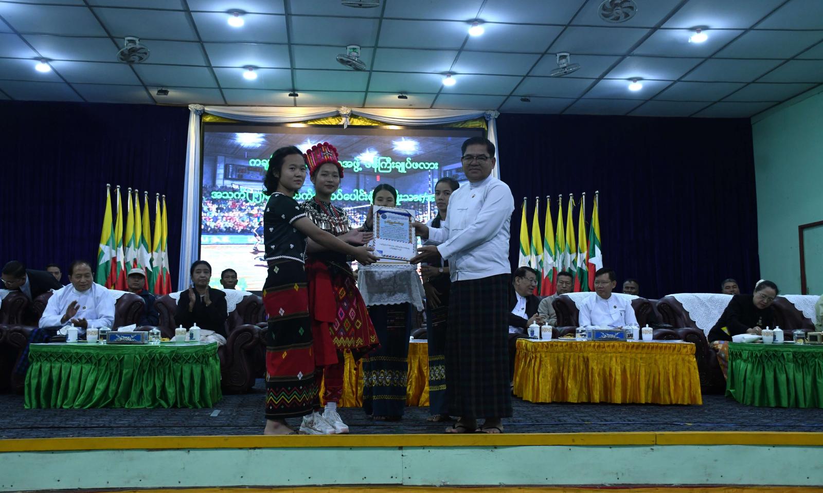 ဆက်လက်၍ ပြည်နယ်ဝန်ကြီးချုပ်က ပြိုင်ပွဲဖြစ်မြောက်ရေးအတွက် ပါဝင်ကူညီခဲ့ကြသည့် ဘင်ခရာအဖွဲ့၊ အလံကိုင်/ ဆိုင်းဘုတ်ကိုင်အဖွဲ့များနှင့် ဖျော်ဖြေရေးအကအဖွဲ့များအတွက် ဂုဏ်ပြုမှတ်တမ်းလွှာနှင့် ဂုဏ်ပြုချီးမြှင့်ငွေများကို ပေးအပ်ချီးမြှင့်ခဲ့ပြီး အဖွင့်ပွဲစဉ်အဖြစ် အမျိုးသမီးဘော်လီဘောပြိုင်ပွဲဝင်အသင်းများဖြစ်သည့် ရွှေစက်ရပ်ကွက်ကိုယ်စားပြု Correction ကလပ်အသင်းနှင့် မိုင်းနားကလပ်အသင်းတို့၏ ယှဉ်ပြိုင်ကစားမှုများကို ကြည့်ရှုအားပေးခဲ့ကြသည်။