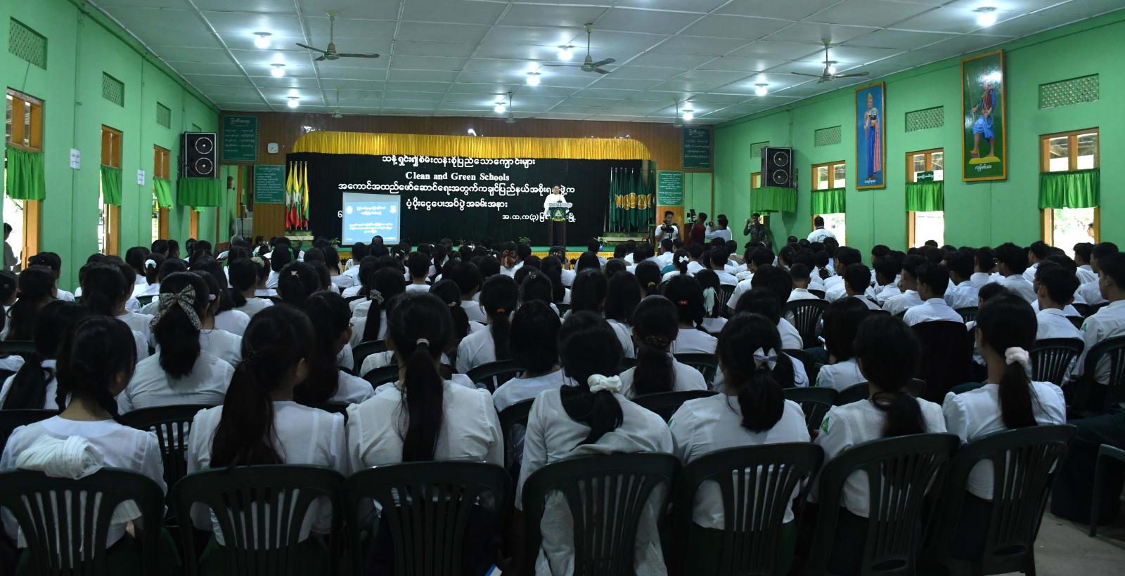 ရှေးဦးစွာ ပြည်နယ်ဝန်ကြီးချုပ်က နိုင်ငံတော်အနေဖြင့် အခြေခံပညာကစပြီး တက္ကသိုလ်အဆင့်ထိ ပတ်ဝန်းကျင်ဆိုင်ရာပညာပေးရေးကို ဖော်ဆောင်လျက်ရှိသကဲ့သို့ အမျိုးသားအဆင့်နှင့် တိုင်းဒေသကြီး/ ပြည်နယ်အဆင့် သန့်ရှင်း၍ စိမ်းလန်းစိုပြည်သည့် ကျောင်းများပေါ်ထွန်းလာအောင် ဖော်ဆောင်လျက်ရှိပါကြောင်း၊ ထိုသို့ဆောင်ရွက်ခြင်းဖြင့် ငယ်ရွယ်သည့် အချိန်ကစ၍ ပတ်ဝန်းကျင်ကို ချစ်ခင်မြတ်နိုး၍ စဉ်ဆက်မပြတ် ထိန်းသိမ်းကာကွယ်စောင့်ရှောက်လိုစိတ် ရှင်သန်စေပြီး ပတ်ဝန်းကျင်နှင့်သဟဇာတဖြစ်သည့်အမူအကျင့်ကောင်းများ ဖြစ်ထွန်းလာမည်ဖြစ်ကြောင်း ပြောကြားသည်။