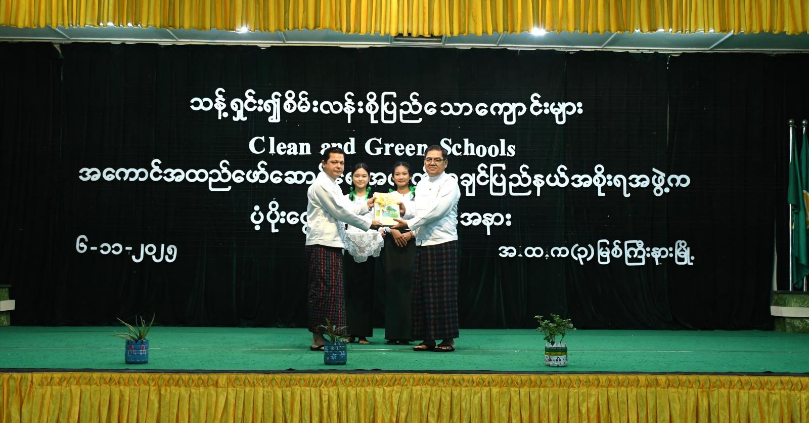 ထို့နောက် ကျောင်းသား/ ကျောင်းသူလေးများ၏ ပတ်ဝန်းကျင်ထိန်းသိမ်းရေးဆိုင်ရာ ကိုယ်တိုင်ရေး ကဗျာရွတ်ဆိုခြင်း၊ သန့်ရှင်း၍ စိမ်းလန်းစိုပြည်သောကျောင်းနှင့် ပတ်သက်သည့် ပုံပြင်တို ပြောခြင်းနှင့် “ပတ်ဝန်းကျင်လှပဖို့ ဒို့လူငယ်များ နိုးကြားစို့” တေးသီချင်းဖြင့် ကပြဖျော်ဖြေခြင်းတို့ကို ကြည့်ရှုအားပေးခဲ့ကြပြီး ဆုရကျောင်းသား/ ကျောင်းသူများနှင့်အတူ အမှတ်တရ စုပေါင်းမှတ်တမ်း တင်ဓာတ်ပုံရိုက်ကူးခဲ့ကြကာ ခန်းမအတွင်း ခင်းကျင်ပြသထားသော ကျောင်းပတ်ဝန်းကျင် သန့်ရှင်း၍ စိမ်းလန်းစိုပြည်ရေးလှုပ်ရှားဆောင်ရွက်မှုများနှင့် ပတ်ဝန်းကျင်ဆိုင်ရာ အသိပညာပေး ပြခန်း/ပြကွက်များကို စိတ်ဝင်တစား လှည့်လည်ကြည့်ရှုအားပေးခဲ့ကြသည်။