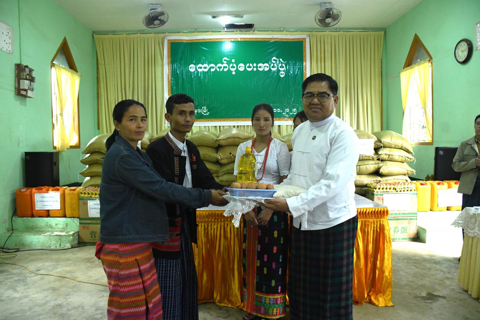 ထိုသို့ တွေ့ဆုံရာတွင် ပြည်နယ်ဝန်ကြီးချုပ်နှင့် ပြည်နယ်ဝန်ကြီးများက စခန်းအတွင်းရှိ အိမ်ထောင်စု (၈၄) စုတို့အတွက် ဆန် (၂၄) ပြည်ပါ ၈၄ အိတ်၊ ဆီ (၈၄) ပိဿာ၊ ကြက်ဥ (၁၆၈၀) လုံး တို့ကို ထောက်ပံ့ပေးအပ်ရာ စခန်းတာဝန်ခံက ကျေးဇူးတင်စကားနှင့် စခန်းနေမိသားစုများ၏ လိုအပ်ချက်များကို တင်ပြရာ ပြည်နယ်ဝန်ကြီးချုပ်က ဌာနဆိုင်ရာတာဝန်ရှိသူများနှင့် ပေါင်းစပ်ညှိနှိုင်း၍ ဖြည့်ဆည်းဆောင်ရွက်ပေးခဲ့ပြီး နိဂုံးချုပ်အားပေးစကားပြောကြားကြောင်း သိရသည်။