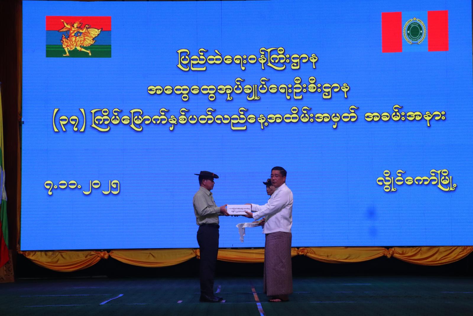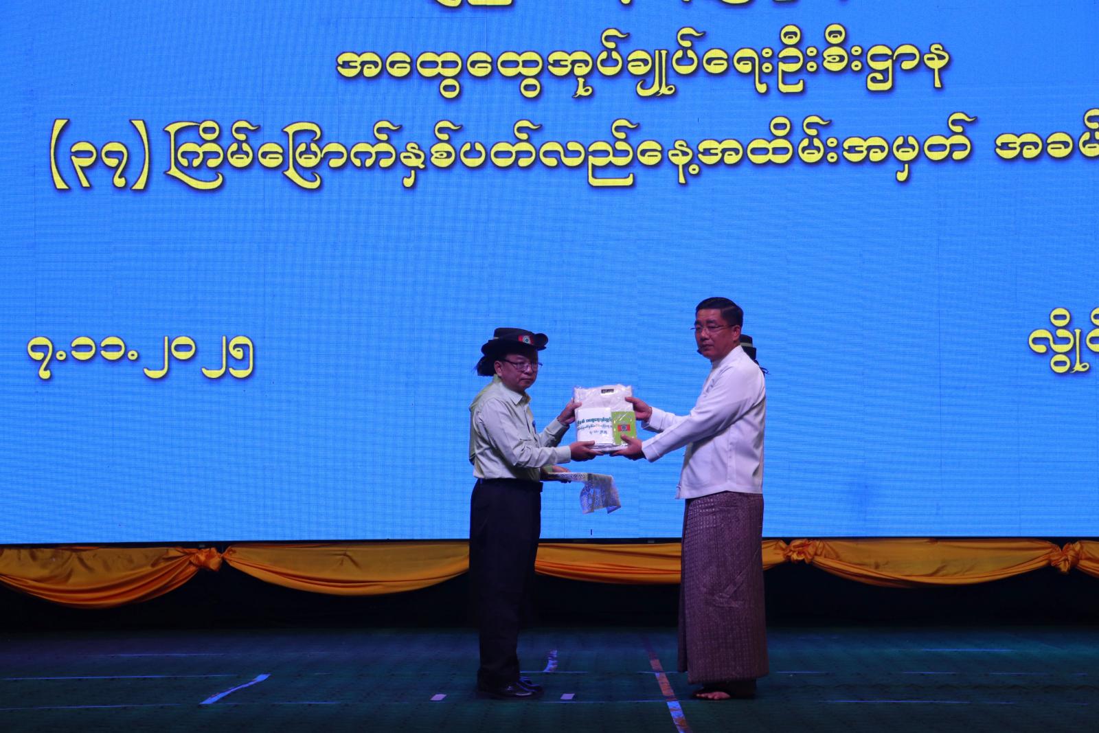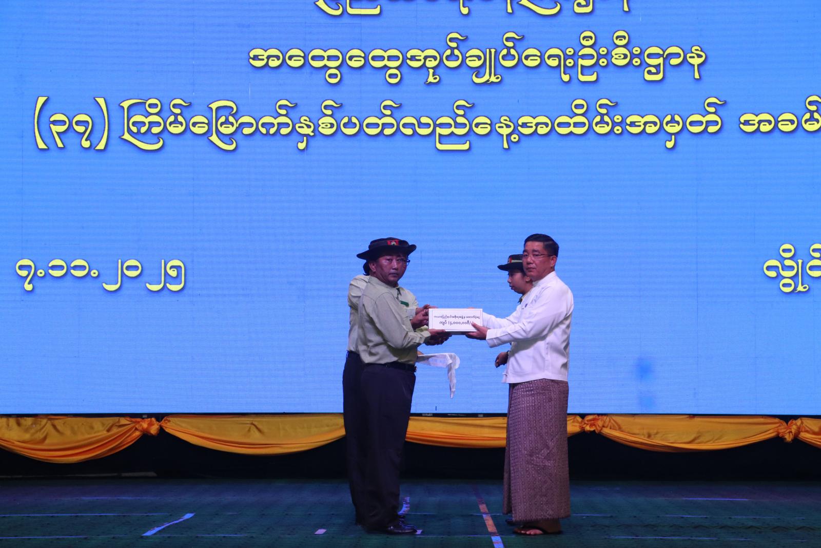 ထို့နောက် ပြည်နယ်ဝန်ကြီးချုပ်က ပြည်နယ်၊ ခရိုင်၊ မြို့နယ်အထွေထွေအုပ်ချုပ်ရေးဦးစီးဌာနရုံးများအတွက် နှစ်ပတ်လည်နေ့အခမ်းအနားကျင်းပနိုင်ရေး ချီးမြှင့်ငွေများပေးအပ်ရာ ပြည်နယ်အထွေထွေအုပ်ချုပ်ရေးဦးစီးဌာန၊ ညွှန်ကြားရေးမှူးနှင့် ခရိုင်အုပ်ချုပ်ရေးမှူးများက လက်ခံရယူကြသည်။ ၎င်းနောက် ဝန်ထမ်းများအတွက် အမှတ်တရလက်ဆောင်ပစ္စည်းများအား လည်းကောင်း၊ အုပ်ချုပ်မှု စွမ်းရည်မြင့်မားရေးသင်တန်းတွင် စစ်ရေးပြထူးချွန်ဆုရရှိသည့် ဝန်ထမ်းတစ်ဦးအား ဂုဏ်ပြုလက်မှတ်နှင့် ချီးမြှင့်ငွေများအားလည်းကောင်း ပေးအပ်ရာ ကိုယ်စားလှယ် အသီးသီးက လက်ခံရယူ ကြသည်။