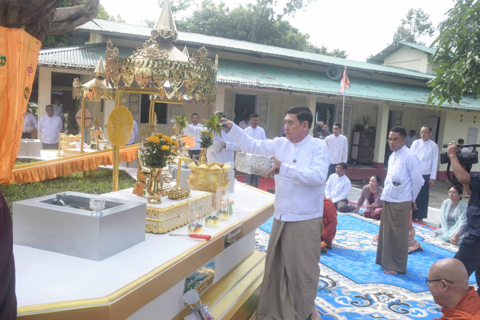 ဆက်လက်၍ အဘိဓဇမဟာရဋ္ဌဂုရု ဘဒ္ဒန္တနန္ဒသိရီ မဟာထေရ်မြတ်နှင့် သံဃာတော်အရှင်သူမြတ်များက မဟာဗောဓိပင်ဂြိုဟ်ရှစ်ခွင်အား ဗုဒ္ဓါဘိသေကအနေကဇာတင် ဗုဒ္ဓါဘိသိက်သွန်းလောင်းပူဇော်ကြပြီး အဘိဓဇမဟာရဋ္ဌဂုရု ဘဒ္ဒန္တနန္ဒသိရီ မဟာထေရ်မြတ်က ဦးဆောင်ကာ ပြည်နယ်ဝန်ကြီးချုပ်၊ တိုင်းမှူးနှင့် ပြည်နယ်အစိုးရအဖွဲ့ဝင်များ၊ တပ်မတော် အဆင့်မြင့်အရာရှိကြီးများက စေတီတော်အား အမွှေးနံ့သာရည်များ ပက်ဖျန်းပူဇော်ကြသည်။