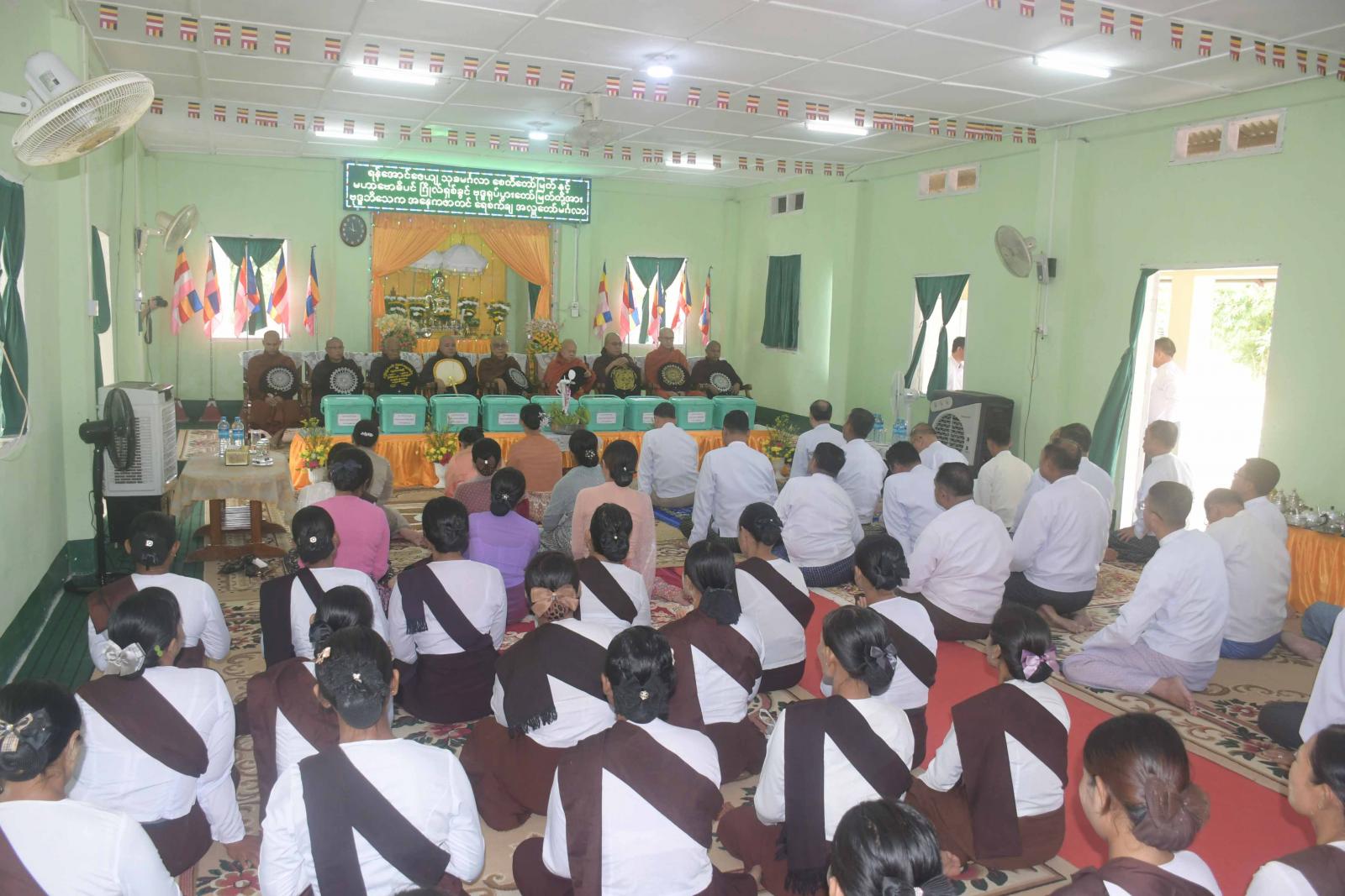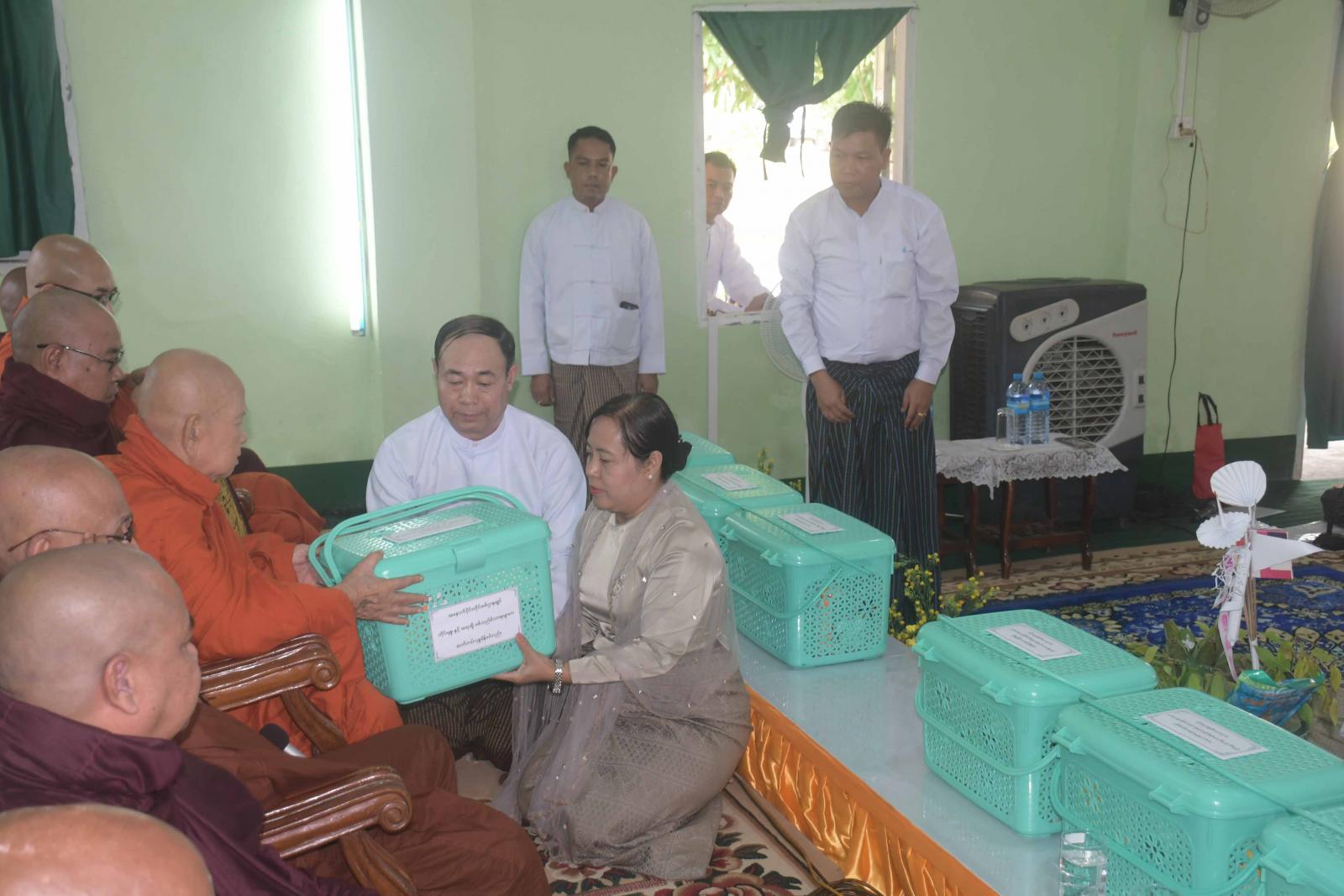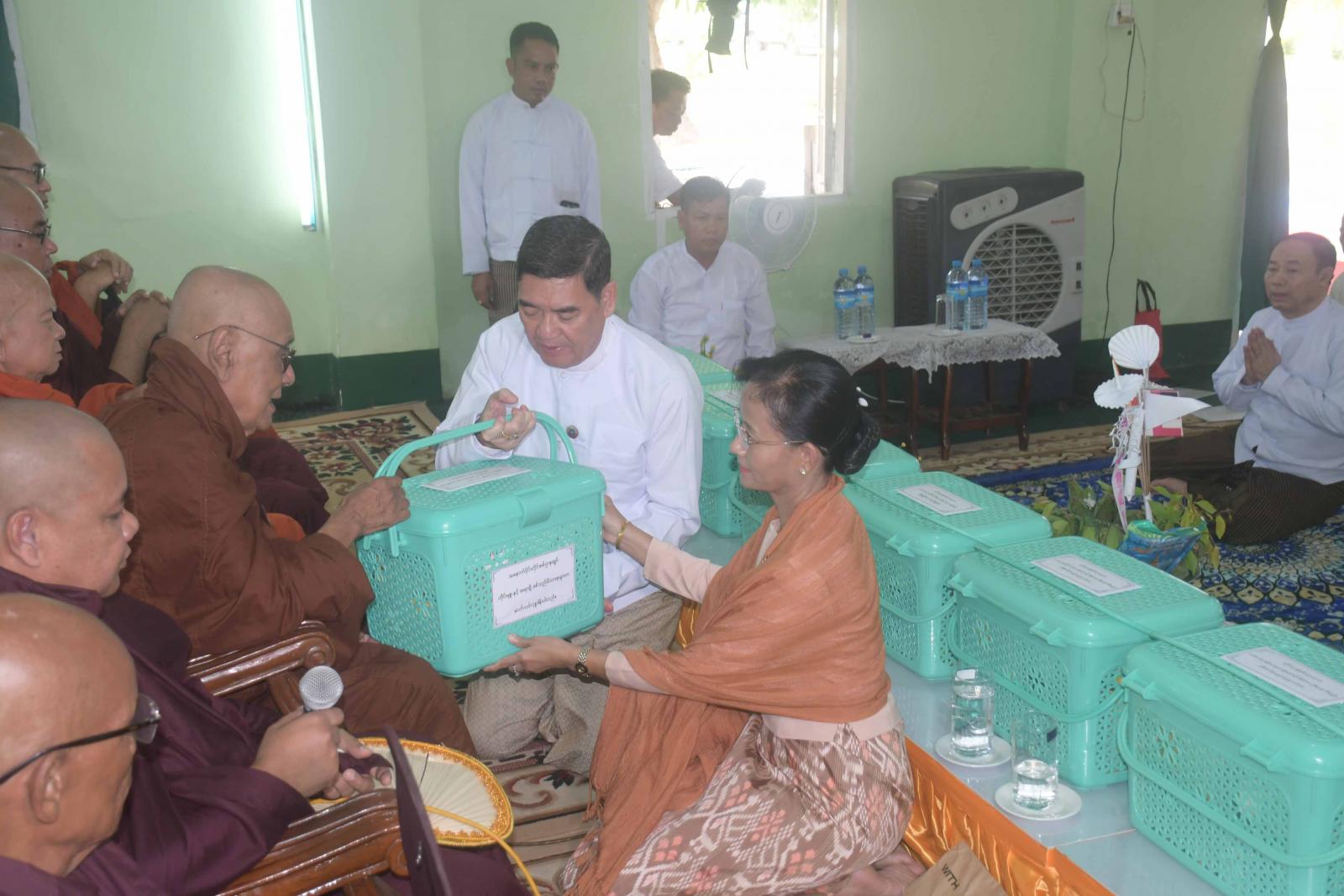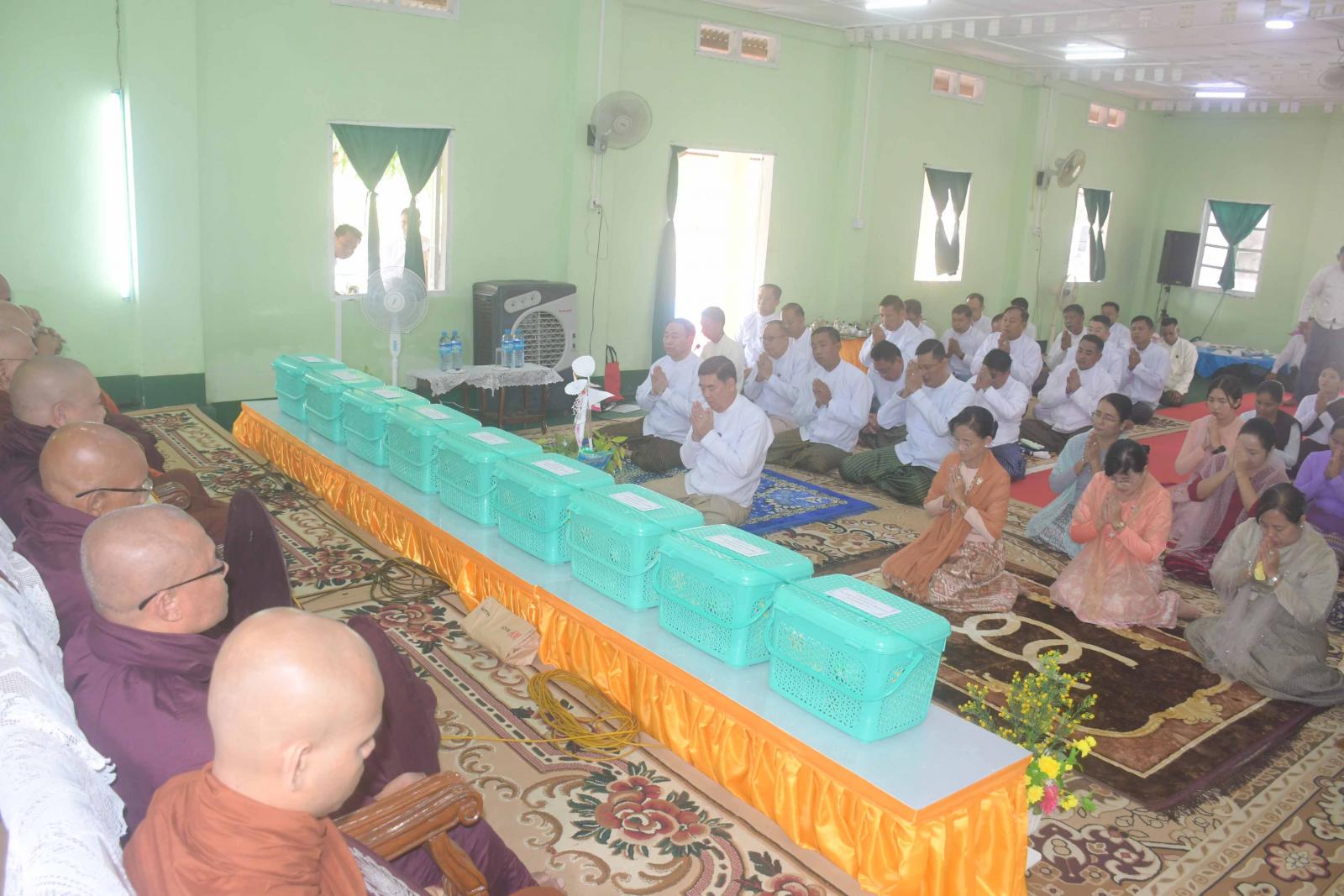 ဆက်လက်၍ ပြည်နယ်ဩဝါဒါစရိယ၊ အဂ္ဂမဟာပဏ္ဍိတ၊ အဘိဓဇမဟာရဋ္ဌဂုရု ဘဒ္ဒန္တနန္ဒသိရီ မဟာထေရ်မြတ်ထံမှ ပြည်နယ်ဝန်ကြီးချုပ်အမှူးပြုသော ဧည့်ပရိသတ် များကငါးပါးသီလခံယူကြပြီး သံဃာတော်အရှင်သူမြတ်များကမေတ္တသုတ်ပရိတ်တရားတော်များ ရွတ်ပွားချီးမြှင့်တော်မူကြသည်။ ယင်းနောက် ပြည်နယ်ဝန်ကြီးချုပ်နှင့်ဇနီး၊ တိုင်းမှူးနှင့် ဇနီး၊ ပြည်နယ်တရားလွှတ်တော်တရားသူကြီးချုပ်နှင့် တာဝန်ရှိသူများက ဆရာတော်ကြီးများအား လှူဖွယ်ပစ္စည်းများဆက်ကပ်လှူဒါန်းကြသည်။
