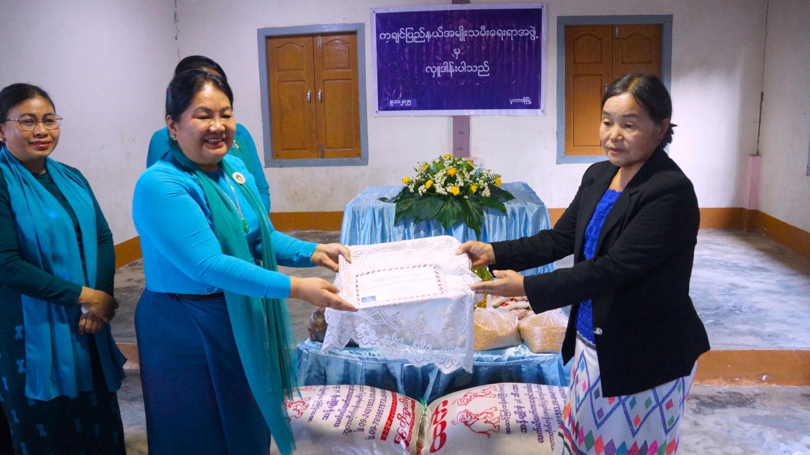 ထို့မှတဆင့် ပြည်နယ် အမျိုးသမီးရေးရာအဖွဲ့နာယကနှင့် အဖွဲ့ဝင်များသည် ပူတာအိုမြို့ ကောင်ကထောင်ရပ်ကွက် နယ်မြေ(၃)ရှိ အေးမြရိပ်သာ မိဘမဲ့ကလေးများနှင့်ဝေးလံဒေသကလေးများ ပညာမြှင့်တင်ရေးဂေဟာသို့ သွားရောက်ပြီး မိဘမဲ့ကလေးများနှင့် ပညာသင်ကြားရန် အခက်အခဲရှိသော ဝေးလံခက်ခဲသော ခေါင်လန်ဖူးမြို့နယ်နှင့်နောင်မွန်မြို့နယ်များမှ ကျောင်းသားကျောင်းသူများစားဝတ်နေရေးအတွက် အထောက်အကူဖြစ်စေရန် အခြေခံစားသောက်ကုန်များဖြစ်သည့် ဆန်၊ ဆီ၊ ဆား၊ ကြာဇံ၊ ကြက်သွန်နီ/ဖြူ၊ ကုလားပဲနှင့်ချီးမြှင့်ငွေများကိုပေးအပ်လှူဒါန်းရာ အေးမြရိပ်သာ မိဘမဲ့ကလေးများနှင့်ဝေးလံဒေသကလေး များ ပညာမြှင့်တင်ရေးဂေဟာ တာဝန်ခံ ဆရာမ မဘုနင်ဆားရ်က လက်ခံရယူခဲ့ကြောင်းသိရသည်။