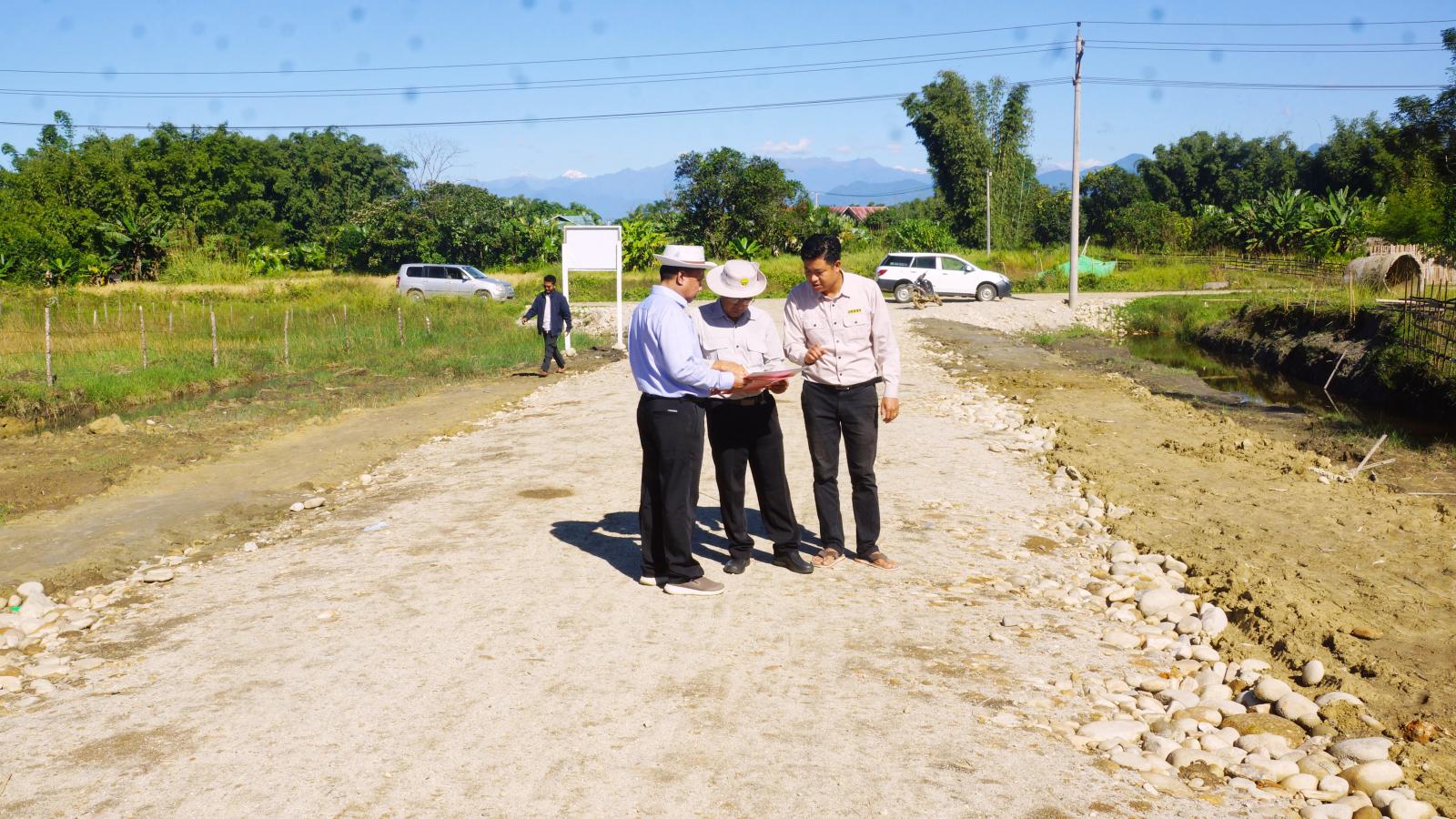 ကချင်ပြည်နယ် ကျေးလက်လမ်းဖွံ့ဖြိုးရေးဦးစီးဌာန ပြည်နယ်ဦးစီးမှူး ဦးမင်းဆွေသည် ခရိုင်ဦးစီးမှူး ဦးဗိုလ်ဗိုလ်ကျော်၊ တာဝန်ခံအင်ဂျင်နီယာ ဦးသော်ဇင်ဦးနှင့်အတူ ၂၀၂၅-၂၀၂၆ ဘဏ္ဍာရေးနှစ် ပြည်နယ်ငွေ လုံးငွေရင်းရန်ပုံငွေကျပ်သန်းပေါင်း (၈၂၁ ဒသမ ၀၃၆) သန်းဖြင့် ဆောင်ရွက်သည့် ပူတာအိုမြို့နယ်၊ ပမ္မတီးကျေးရွာနှင့်ဂျေဂျီဒီကျေးရွာချင်းဆက်သွယ်ထားသော လမ်းအရှည်(၂)မိုင် အား လမ်းအကျယ်(၁၈)ပေ၊ ထုခြောက်လက်မဖြင့် သဲကျောက်ခင်းခြင်းလုပ်ငန်းအား မြို့နယ် ကျေးလက်လမ်းဖွံ့ဖြိုးရေးဦးစီးဌာနက လမ်းခင်းခြင်းလုပ်ငန်း(၈၀)ရာခိုင်နှုန်း ဆောင်ရွက်ပြီးစီးမှု အခြေအနေနှင့် ၂၀၂၅-၂၀၂၆ဘဏ္ဍာရေးနှစ် ပြည်နယ်ငွေလုံးငွေရင်းရန်ပုံငွေ ကျပ်သန်းပေါင်း(၄၆၀ ဒသမ ၄၃၈) သန်းဖြင့် ပူတာအိုမြို့နယ်၊ နမ်ရှယ်ရှီးဒီကျေးရွာနှင့် နမ်ရှယ်ဇွပ်ကျေးရွာချင်း ဆက်သွယ်လမ်းအရှည်(၁)မိုင်( ၁)ဖာလုံအား သဲကျောက်လမ်းခင်းခြင်းလုပ်ငန်းကို JSJ ကုမ္ဗဏီက လမ်းခင်းခြင်းလုပ်ငန်း(၃၅)ရာခိုင်နှုန်းပြီးစီးမှု အခြေအနေများကို ကွင်းဆင်းစစ်ဆေးသည်။