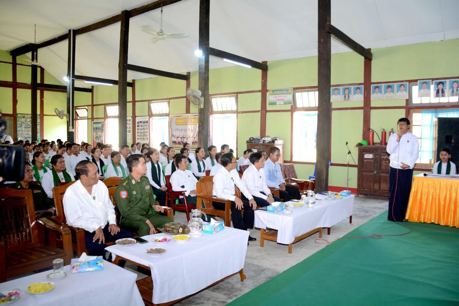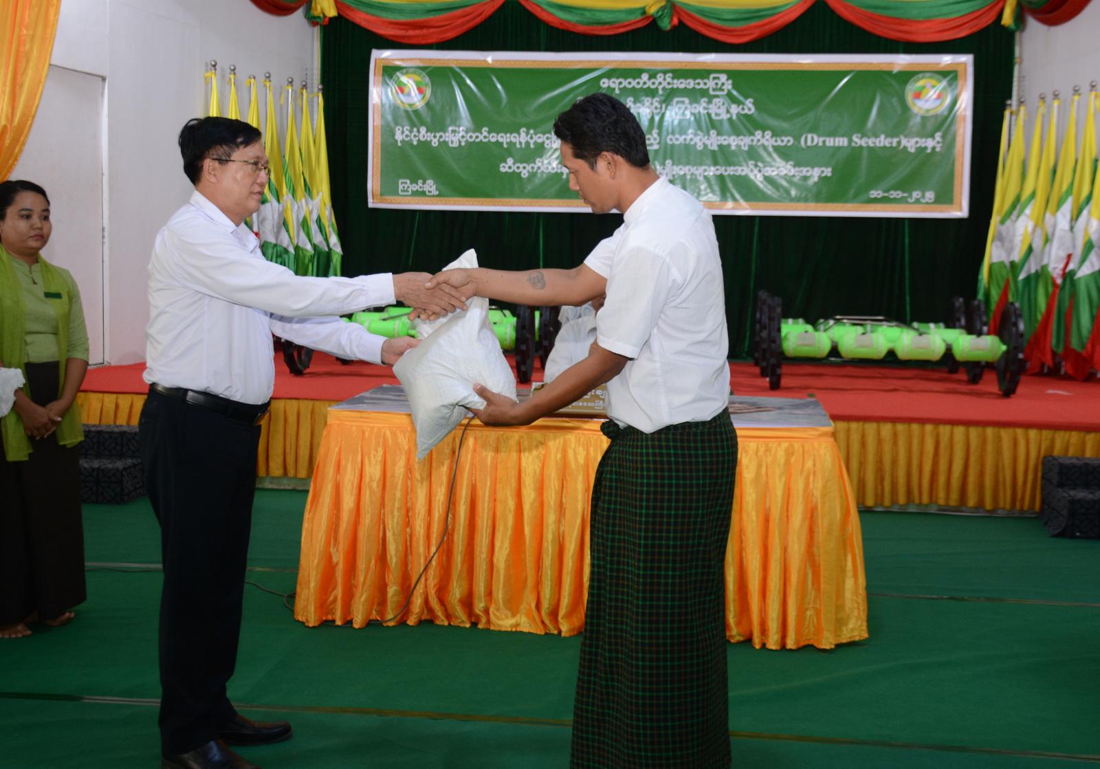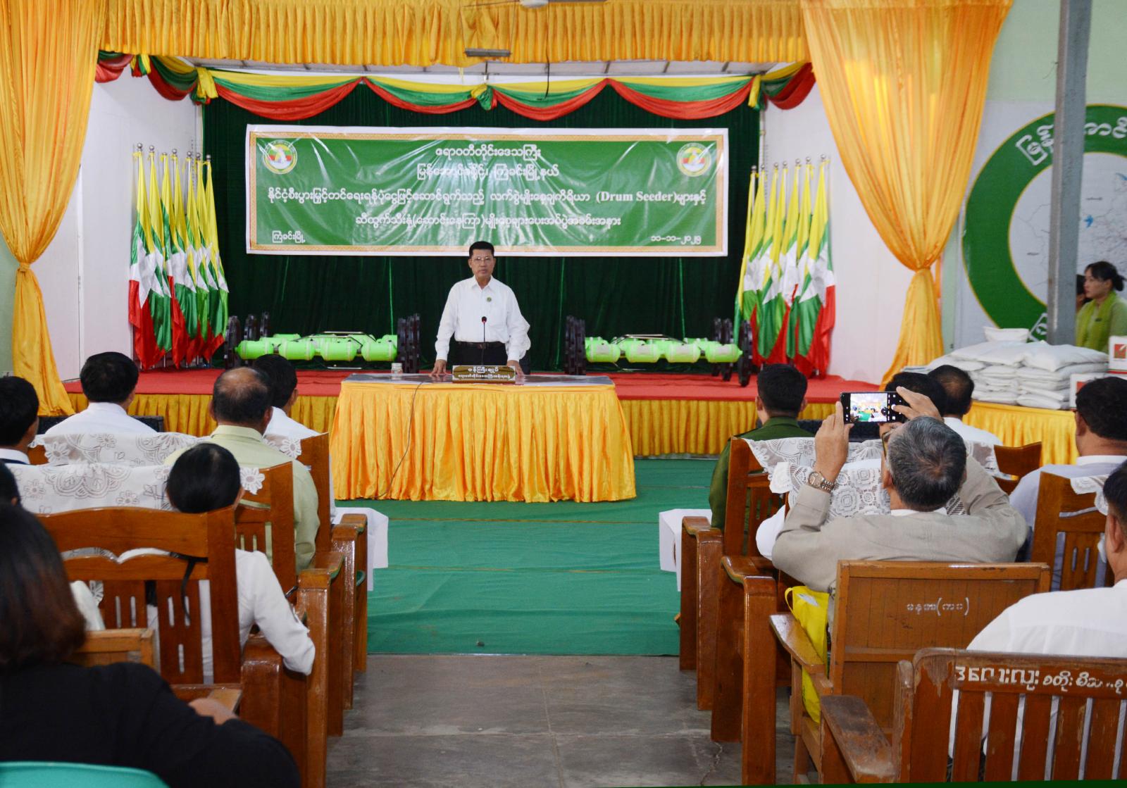 ရှေးဦးစွာ ဧရာဝတီတိုင်းဒေသကြီးအစိုးရအဖွဲ့ ဝန်ကြီးချုပ် ဦးတင်မောင်ဝင်းက နိုင်ငံတော်၏ အကြီးအကဲများက နိုင်ငံစီးပွားရန်ပုံငွေဖြင့် ဆောင်ရွက်သည့် လက်ဆွဲမျိုးစေ့ချကိရိယာ (Drum Seeder) များအား တောင်သူများ စပါးအထွက်တိုးစေရေးအပြင်၊ ကြဲခင်းစနစ်ပပျောက်ရေးအတွက် ဆောင်ရွက်ပေးခြင်းဖြစ်ကြောင်း၊ ကြဲခင်းစနစ်များသည် မျိုးစပါးလေလွှင့်မှုဆုံးရှုံးများစွာရှိသောကြောင့် (Drum Seeder) ဖြင့် စနစ်တကျစိုက်ပျိုးနိုင်ရေး တစ်ဖက်တစ်လမ်းမှ ကူညီဆောင်ရွက်ပေးခြင်းဖြစ်ကြောင်း နှင့် ဆီထွက်သီးနှံများ စိုက်ပျိုးရာတွင် မြေပဲ တစ်မျိုးတည်းစိုက်ပျိုးခြင်းထက် ပဲပုတ်၊ နေကြာများကို လည်းထည့်သွင်းစိုက်ပျိုးသင့်ကြောင်း ဒါမှသာ ပြည်တွင်းဆီဖူလုံရေးကို ရရှိလာမည့်အပြင် တောင်သူများ ဝင်ငွေတိုးလာမည်ဖြစ်ကြောင်း ပြောကြားသည်။ ထို့နောက် ဧရာဝတီတိုင်းဒေသကြီးအစိုးရအဖွဲ့ ဝန်ကြီးချုပ်နှင့် တိုင်းဒေသကြီးအစိုးရအဖွဲ့ဝန်ကြီးများက လက်ဆွဲမျိုးစေ့ချကိရိယာ (Drum Seeder) များနှင့် ဆီထွက်သီးနှံ (ဆောင်းနေကြာ) မျိုးစေ့များ တောင်သူများအား အသီးသီးပေးအပ်ကြပြီး တိုင်းဒေသကြီးအစိုးရအဖွဲ့ ဝန်ကြီးချုပ်က တောင်သူများနှင့် ရင်းရင်းနှီးနှီးတွေ့ဆုံအားပေးစကား ပြောကြားခဲ့သည်။