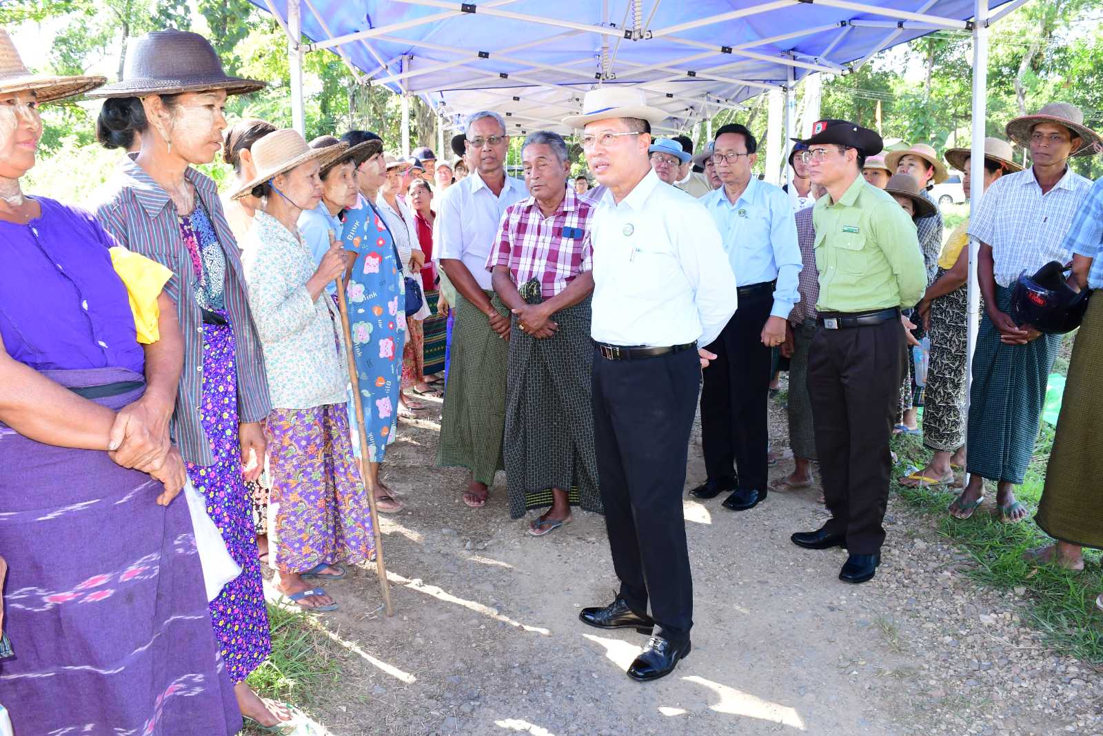 ထို့နောက် တိုင်းဒေသကြီးဝန်ကြီးချုပ်နှင့်အဖွဲ့သည် ရေကြည်မြို့နယ်၊ ဇရပ်ဝိုင်းကျေးရွာ၊ တောင်သူဦးခင်မောင်ထွန်း၏ စိုက်ဧက(၁၀)ဧကတွင်ပြုလုပ်သည့် မှော်ဘီ-၃ စပါးမျိုး မိုးစပါးစံကွက်ရိတ်သိမ်းပွဲသို့ တက်ရောက်ကြည့်ရှုအားပေးခဲ့ပြီး တောင်သူများနှင့်တွေ့ဆုံ၍ မိုးစပါးရိတ်သိမ်းရာတွင် တစ်ဧကထွက်ရှိသည့် အထွက်နှုန်းများ၊ စပါးကုန်သည်များလာရောက်ဝယ်ယူမှု၊ ဈေးရရှိမှုအခြေအနေများအား မေးမြန်းဆွေးနွေးခဲ့ပြီး စပါးစိုက်ပျိုးမှုလုပ်ငန်းများ ယခုထက်ပိုမိုတိုးတက်အောင် ကြိုးပမ်းဆောင်ရွက်ကြရန်လိုပါကြောင်း၊ စပါးစိုက်ပျိုးမှုများကို ပင်ကြား၊ တန်းကြားမှန်မှန်ကန်ကန်နှင့် ကောက်ကွက်ပြည့်မီအောင် ဆောင်ရွက်သွားကြရန်လည်း လိုအပ်မည်ဖြစ်ပါကြောင်း၊ ဆီဖူလုံရေးအတွက် နေကြာ၊ ပဲပုပ်များအား ဖြစ်ထွန်းအောင်မြင်အောင် ဆောင်ရွက်သွားရန်လိုပါကြောင်း၊ ရိတ်သိမ်းပြီးစပါးများ အရည်အသွေးမကျစေရေး၊ ဈေးကွက်တွင်ဈေးကောင်းရရှိရေး၊ လေလွင့်မှုမရှိစေရေးအတွက် စပါးအခြောက်ခံစက်များဖြင့် အသုံးပြုနိုင်စေရေးအတွက် တောင်သူများ စုပေါင်းဆောင်ရွက်ကြရန်လိုကြောင်း၊ သီးနှံစိုက်စွမ်းအား သီးထပ်စွမ်းအားနှင့် စိုက်ပျိုးရေးလုပ်ငန်းများကို ပန်းတိုင်ရည်မှန်းချက်ပြည့်မီအောင် ဆောင်ရွက်သွားရန်နှင့် တောင်သူများကလည်း အားလုံးပူးပေါင်းပါဝင် ဆောင်ရွက်ကြရန် မှာကြားခဲ့သည်။