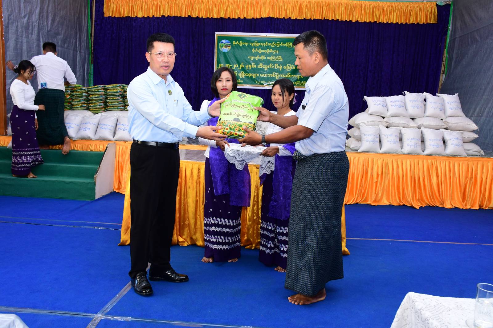 ဧရာဝတီတိုင်းဒေသကြီး၊ ကျုံပျော်ခရိုင်၊ ရေကြည်မြို့နယ်အထွေထွေအုပ်ချုပ်ရေးဦးစီးဌာန၊ စိမ်းလဲ့ရေကြည်ခန်းမတွင် ပြုလုပ်သည့် ၂၀၂၅-၂၀၂၆ ခုနှစ်၊ ဆီထွက်သီးနှံ မြေပဲ၊ နေကြာ၊ ပဲပုပ်မျိုးစေ့များ ပေးအပ်ပွဲအခမ်းအနားကို ယမန်နေ့နံနက်ပိုင်းက ပြုလုပ်ခဲ့ရာ ဧရာဝတီတိုင်းဒေသကြီးဝန်ကြီးချုပ် ဦးတင်မောင်ဝင်းသည် တာဝန်ရှိသူများနှင့်အတူ တက်ရောက်၍ တောင်သူများအား ဆီထွက်သီးနှံ မြေပဲ၊ နေကြာ၊ ပဲပုပ် မျိုးစေ့များ ပေးအပ်ခဲ့သည်။