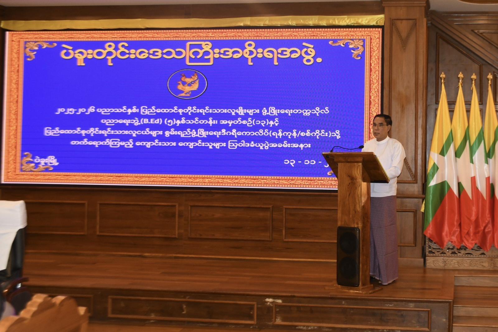 ထို့နောက် ပဲခူးတိုင်းဒေသကြီးဝန်ကြီးချုပ် ဦးမျိုးဆွေဝင်းက မောင်တို့မယ်တို့ သွားရောက်ပညာသင်ကြားရမည့် တက္ကသိုလ်နှင့်ဒီဂရီကောလိပ်အား တိုင်းရင်းသားစည်းလုံးညီညွတ်ရေးကို ရှေးရှုလျက်တိုင်းရင်းသားများ စုပေါင်းပြိး တစ်နေရာတည်းပညာသင်ယူနိုင်ရေး ဖွင့်လှစ်ပေးခဲ့ခြင်းဖြစ်၍ မိမိတို့လူမျိုးများ၏ ယဉ်ကျေးမှု၊ ဓလေ့အစဉ်အလာကောင်းများကို နှီးနှောဖလှယ်ပြီး စည်းရုံးမှုကို ယူရသွားရမှာဖြစ်ကြောင်းနှင့် ပို့ချတဲ့ပညာရပ်များကို ထူးချွန်တတ် မြောက်အောင် လေ့လာဆည်းပူးသင်ယူကြရမှာဖြစ်ကြောင်း၊ သင်တန်း များပြီးဆုံး၍ မိမိတို့လုပ်ငန်း ခွင်ဝင်သည့်အခါ သင်ယူခဲ့ရသည့် ပညာရပ်များကို အကျိုးရှိရှိ အသုံးချပြီးတိုင်းပြည်၏အနာဂတ်၊ တိုင်းရင်းသားတို့၏အနာဂတ်ကို ကောင်းမွန်အောင် ဆောင်ရွက်ပေးသွားရန်နှင့် နိုင်ငံတော်စဉ်ဆက်မပြတ် ဖွံ့ဖြိုးတိုးတက်ခိုင်မာရေးအတွက် အမျိုးသားပညာရေး ကဏ္ဍကို အစဉ်အလေးထား မြှင့်တင်ပေးကြရမှာဖြစ်ကြောင်း၊ အခြားသော တိုင်းဒေသကြီး/ ပြည်နယ်အသီးသီးမှ သင်တန်းသား/သူများကို လည်း ညီအစ်ကို မောင်နှမလို သဘောထားပြီး တစ်ယောက်၏ အခက်အခဲကို တစ်ယောက်က ကူညီ ဖြေရှင်းကာ ပြည်ထောင်စုစိတ်ဓါတ်ဖြင့် နေထိုင်သွားကြစေလိုကြောင်း၊ နောင်အနာဂတ်တွင်တိုင်းပြည်၏ တာဝန်တွေကို ပုခုံးပြောင်းတာဝန် ယူကြရမည့် ကလေးတွေရဲ့ဘဝကို ထုဆစ်ပုံဖော်ပေးကြရမယ့် ဆရာ/ဆရာမ များဖြစ်လာကြမှာဖြစ်သည့်အတွက် နိုင်ငံတော်၏ ကျေးဇူးသစ္စာကို စောင့်သိပြီး ဆရာ့ဂုဏ်အင်၊ ဆရာ့သိက္ခာ နှင့်အညီ နေထိုင်ပြီး တိုင်းရင်းသားများ၏ ဘဝဖွံ့ဖြိုးတိုးတက်ရေးကို ရှေးရှု၍ ကျရာတာဝန်များကို ကျေပွန်စွာ ထမ်းဆောင်သွားကြစေလိုကြောင်း ပြောကြားခဲ့သည်။
