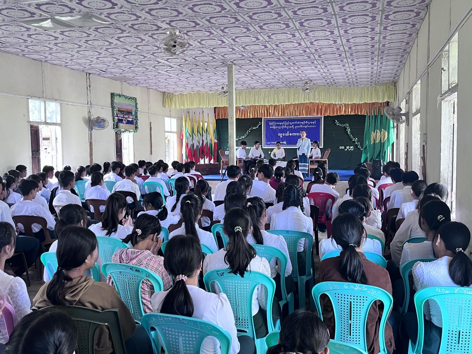 ဆက်လက်၍ အထက်တန်းအဆင့် ကျောင်းသား/သူများဖြစ်သည့် မောင်ဘုန်းဝေဖြိုးက လှုပ်ရှားတက်ကြွလူငယ်ဘဝ၊ မအိမ့်မှူးခင်က စည်းကမ်းရှိမှ ပြည်ရွာလှ၊ စိုင်းဇေယျာလင်းက သစ်ပင်စိုက်ပါ တို့ကမ္ဘာ၊ နန်းယွန်းရွှေစင်ဖြိုးက ရိုင်းပင်းကူညီလိုစိတ်နှင့် နန်းဆုရတီလှိုင်က ငယ်စဉ်အခါပညာရှာစသည့်ခေါင်းစဉ်များဖြင့် အသီးသီးဆွေးနွေးပြောကြားခဲ့ပြီး ဆွေးနွေးပွဲတက်ရောက်လာကြသော ကျောင်းသား/သူများက သိလိုသည်များကိုမေးမြန်းခဲ့ရာ ဦးဆောင်ဆွေးနွေးသူများက ပြန်လည်ဆွေးနွေးပေးခဲ့သည်။ ထို့နောက်မြို့နယ်အားကစားမှူး ဦးစိုင်းအောင်ကျော်ကျော်က အားကစားပစ္စည်းများနှင့် မြို့နယ်ပြန်/ဆက် ဦးစီးအရာရှိ ဒေါ်နန်းမိုခမ်း အ.ထ.က(မောက်မယ်) ကျောင်းအုပ်ဆရာမကြီးတို့က ဦးဆောင်ဆွေးနွေးသူများအား ဆုငွေနှင့်ဂုဏ်ပြုမှတ်တမ်းလွှာများ ပေးအပ်ခဲ့ကြကြောင်း သိရသည်။