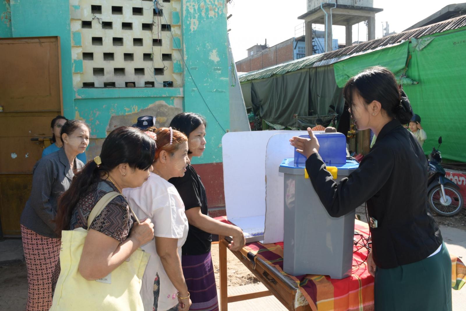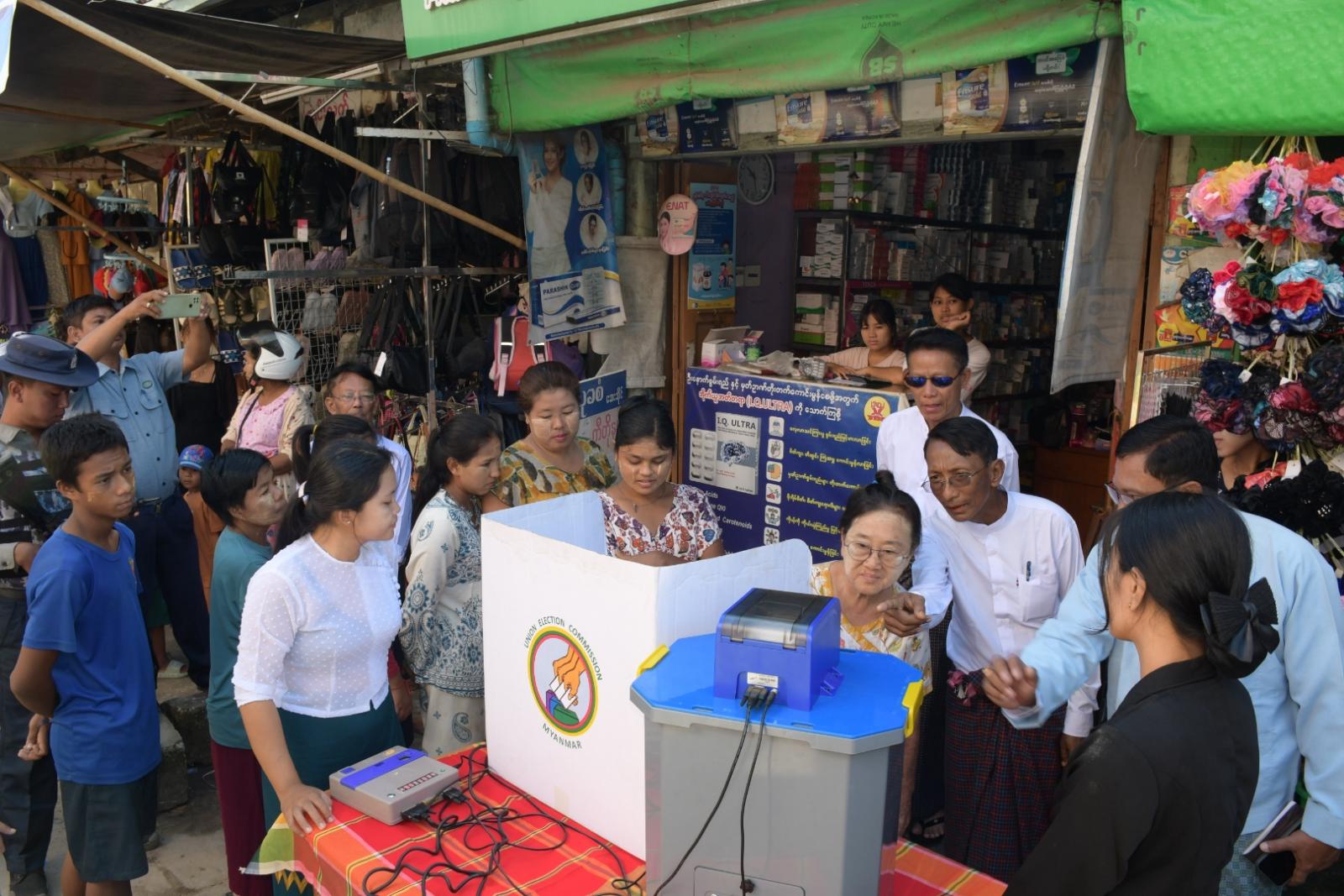 ထိုသို့ဆောင်ရွက်ရာသို့ တောင်ငူမြို့နယ်စီမံခန့်ခွဲရေးနှင့် အုပ်ချုပ်ရေးကော်မတီဥက္ကဋ္ဌ ဦးဉာဏ်လင်းအောင်နှင့်အဖွဲ့ဝင်များ၊ မြို့နယ်အဆင့်ဌာနဆိုင်ရာများမှ တာဝန်ရှိသူများ၊ မြို့နယ် ရွေးကောက်ပွဲကော်မရှင်အဖွဲ့ခွဲရုံးမှဝန်ထမ်းများ၊ မြို့နယ်ကော်မရှင်အဖွဲ့ခွဲ ဥက္ကဋ္ဌနှင့်အဖွဲ့ဝင်များ ၊ ရပ်ကွက်အုပ်ချုပ်ရေးမှူးများ တက်ရောက်ခဲ့ပြီး တာဝန်ရှိသူများက မြို့မစျေးကြီးအတွင်းရှိ နေရာ(၃) နေရာ၌ ဈေးဆိုင်ခန်းပေါင်း(၁၀၃၂)ခန်းမှ စျေးရောင်းစျေးဝယ်ပြည်သူများ စုစုပေါင်းအင်အား (၃၁၅၀)ဦးခန့်အား မြန်မာအီလက်ထရောနစ်မဲပေးစက်အသုံးပြုနည်းကို ရှင်းလင်းပြောကြားပြီး စျေးရောင်းစျေးဝယ်ပြည်သူများက မြန်မာအီလက်ထရောနစ် မဲပေးစက်အသုံးပြု၍ လက်တွေ့မဲပေးခဲ့ကြကြောင်းသိရသည်။