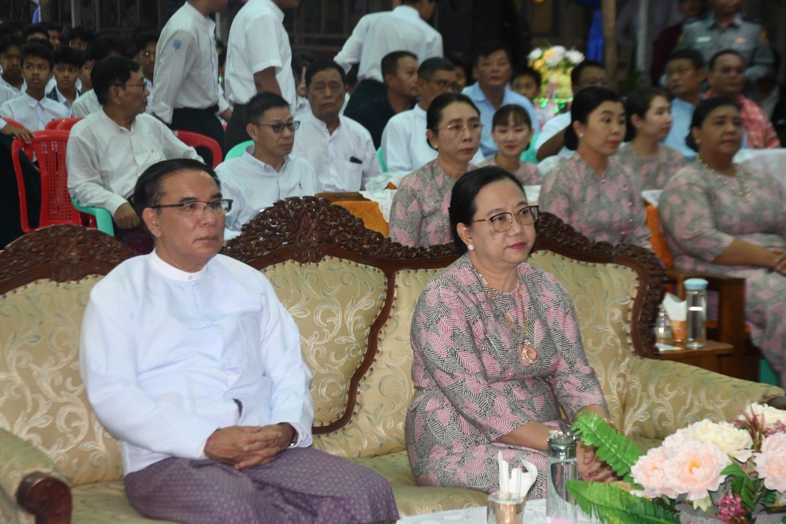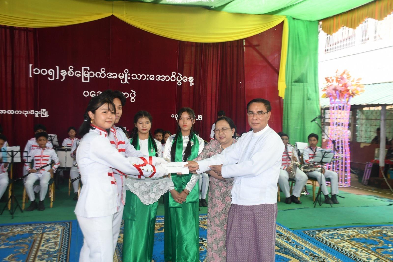 ရှေးဦးစွာ အမှတ်(၃)အခြေခံပညာအထက်တန်းကျောင်းမှ ဘင်ခရာသံစုံတီးဝိုင်းဖြင့် Grade 12 ကျောင်းသား/သူများက “ကျောင်းသီချင်း”ဖြင့်လည်းကောင်း၊ Grade 10 ကျောင်းသား/သူများက “အမျိုးသား နေ့ကြွေးကြော်သံ”သီချင်းဖြင့်လည်းကောင်း၊ Grade 8 ကျောင်းသူ မအိမြတ်ချယ်က “စကားဝါမြေ”သီချင်း ဖြင့်လည်းကောင်း၊ အဆို၊ အက၊ အရေး၊ အတီးပြိုင်ပွဲ ရွှေတံဆိပ်သုံးဆုရှင် တေးသံရှင်မဧကရီအောင်က “တောသူအချစ်” သီချင်းဖြင့်လည်းကောင်း၊ Grade 9 ကျောင်းသူ မမေဘုန်းမြတ်က “ပန်းရည်ဘဏ်တိုက်” သီချင်းဖြင့်လည်းကောင်း သီဆိုကပြဖျော်ဖြေတင် ဆက်ခဲ့ကြသည်။ ၎င်းနောက် တိုင်းဒေသကြီး ဝန်ကြီးချုပ်နှင့် ဇနီးတို့ကတီးခတ်သီဆိုကပြ ဖျော်ဖြေတင်ဆက်ခဲ့ကြသည့် ကျောင်းသား/သူများအား ဂုဏ်ပြုဆုများနှင့် ဆရာ/ ဆရာမများအတွက် အဝတ်အထည်များ ချီးမြှင့်ပေးအပ်ခဲ့ကြောင်း သတင်းရရှိသည်။