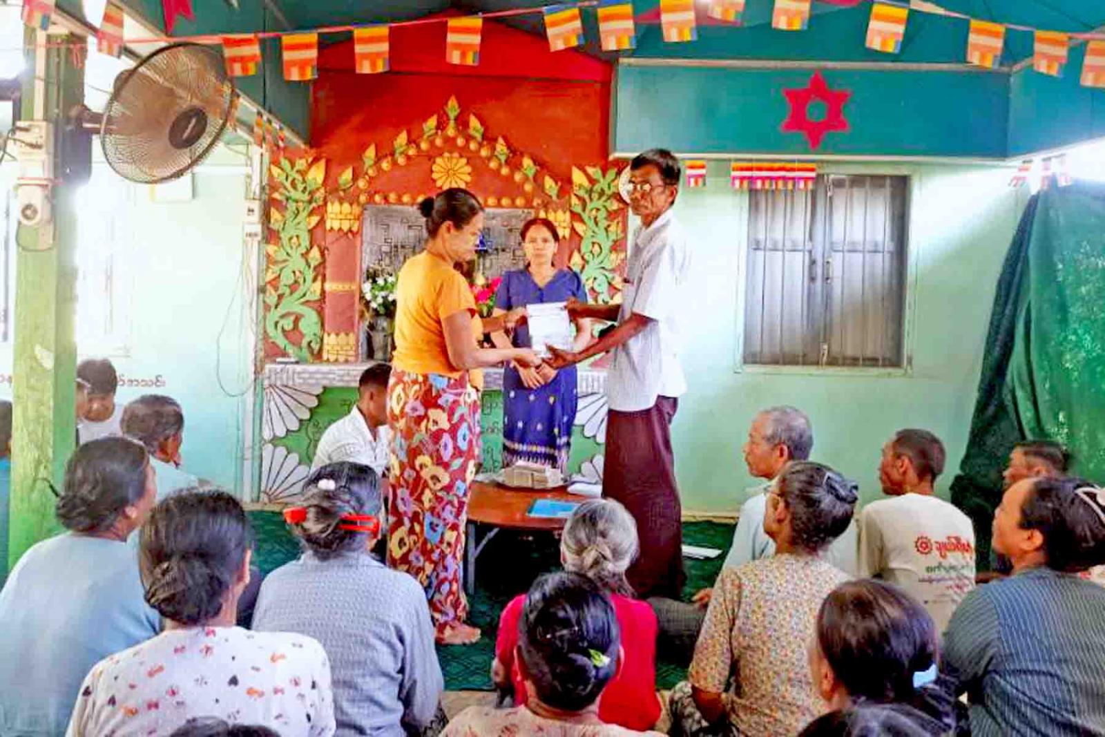 ဆက်လက်၍ စီမံကိန်းတာဝန်ခံ ဝန်ထမ်းများက ချေးငွေအတိုးနှုန်းနှင့် ကာလသတ်မှတ်ချက်များ၊ ချေးငွေထုတ်ချေးရာတွင် လိုက်နာရမည့် စည်းမျဉ်း၊ စည်းကမ်းများကို ရှင်းလင်းပြောကြားပြီး ဒုတိယဦးစီးမှူး ဒေါ်လှကြူနွဲ့က မြစိမ်းရောင်ကျေးရွာစီမံကိန်းလုပ်ငန်းအဖွဲ့ဝင်များထံ ရန်ပုံငွေများကို လွှဲပြောင်းပေးအပ် သည်။