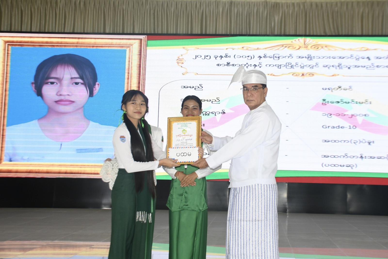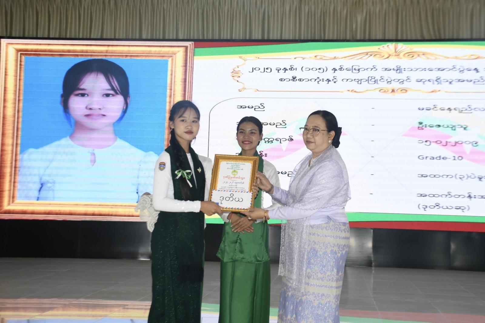 ထို့နောက် အခြေခံပညာအထက်တန်း-မြို့အနောက်(ခ)မှ ကျောင်းသား/သူများက “မြန်မာ့ကျောင်း” သီချင်းဖြင့် သီဆိုဖျော်ဖြေတင်ဆက်ခဲ့ရာ တိုင်းဒေသကြီး ဝန်ကြီးချုပ်နှင့် ဇနီးတို့က ဖျော်ဖြေတင်ဆက်ခဲ့ကြသည့် ကျောင်းသား/သူများအား ဂုဏ်ပြုဆုများ ချီးမြှင့်ပေးအပ်ခဲ့ကြောင်း သိရသည်။