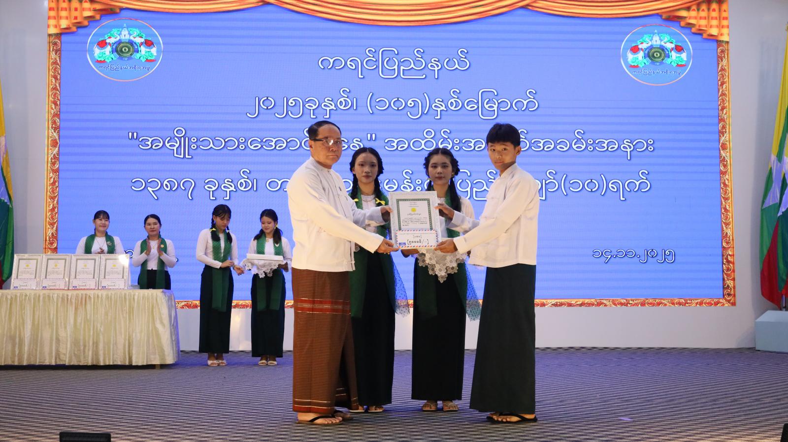 ထို့နောက် ကရင်ပြည်နယ်အတွင်းရှိ အခြေခံပညာအထက်တန်း၊ အလယ်တန်း၊ မူလတန်းအဆင့် အမျိုးသားအောင်ပွဲနေ့အထိမ်းအမှတ် စာစီစာကုံး၊ ကဗျာနှင့် ပန်းချီပြိုင်ပွဲများမှ ဆုရရှိသည့် ကျောင်းသား၊ ကျောင်းသူများအား ပြည်နယ်ဝန်ကြီးချုပ် ဦးစောမြင့်ဦး၊ ပြည်နယ်တရားလွှတ်တော် တရားသူကြီးချုပ်နှင့် ပြည်နယ်အစိုးရအဖွဲ့ဝင်ဝန်ကြီးများက ဆုများအသီးသီးပေးအပ်ချီးမြှင့်ခဲ့ပြီး အမှတ်(၁) အခြေခံပညာအထက်တန်းကျောင်းမှ ကျောင်းသား၊ ကျောင်းသူများက မြန်မာ့ကျောင်းသီချင်းဖြင့် သီဆိုရုပ်သိမ်းခဲ့ကြောင်း သိရသည်။
