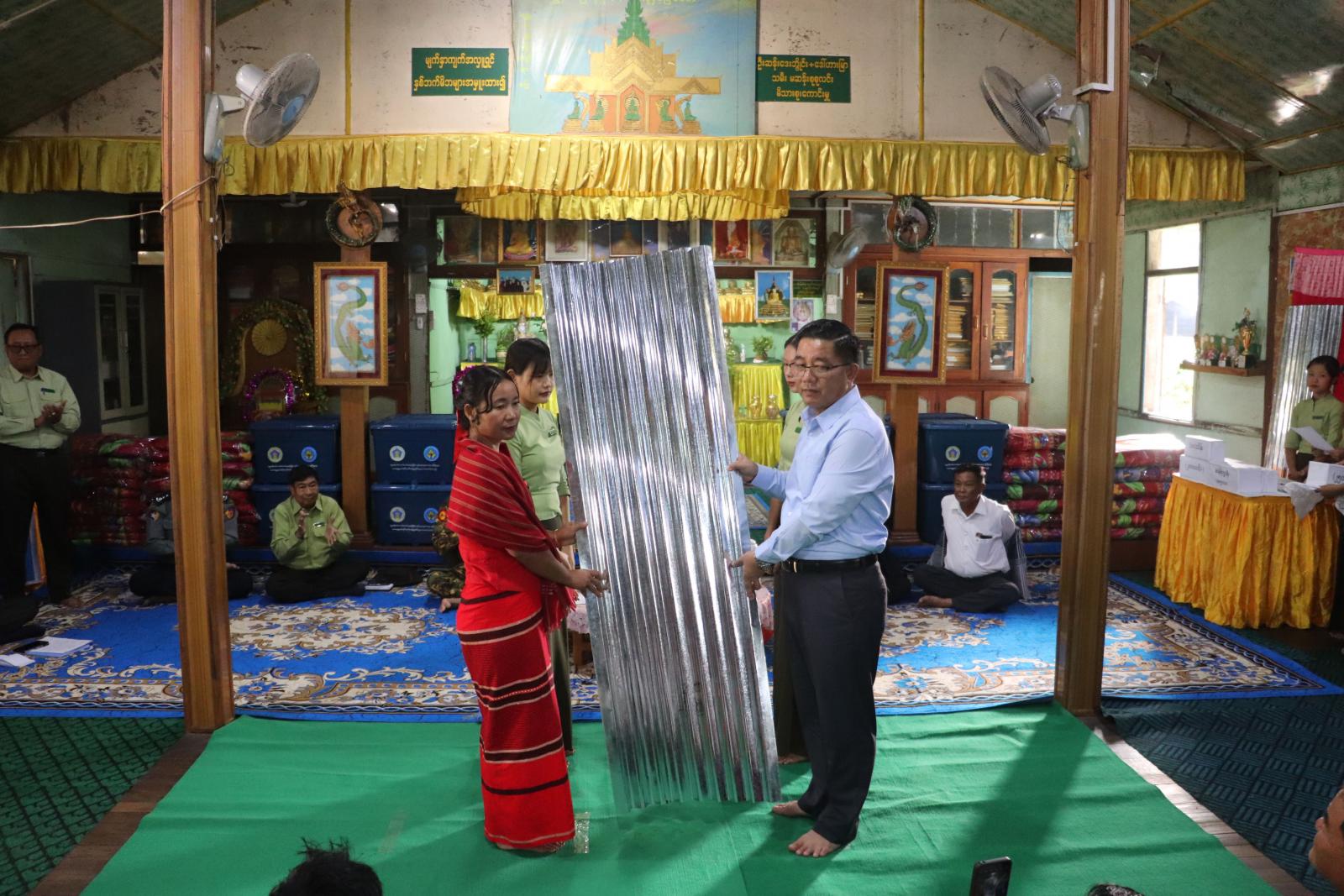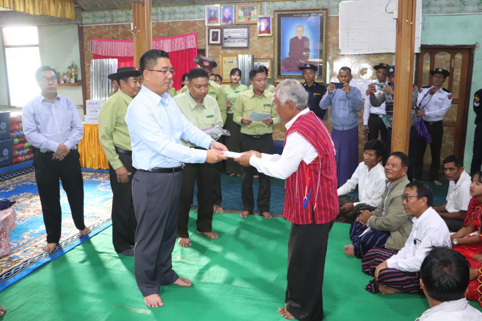ထို့နောက် ပြည်နယ်ဝန်ကြီးချုပ်က ဒေါပိုးစီကျေးရွာမှ နေအိမ်ထိခိုက်ပျက်စီးခဲ့သည့် ပြည်သူများ နေအိမ်ပြန်လည်ဆောက်လုပ်နိုင်ရန်အတွက် ထောက်ပံ့ငွေနှင့် သွပ်များပေးအပ်ရာ ကျေးရွာ ကိုယ်စားလှယ်များက လက်ခံရယူကြသည်။ ဆက်လက်၍ ဒေသကွပ်ကဲရေးမှူးနှင့် ပြည်နယ်အစိုးရအဖွဲ့ဝင်များ၊ တာဝန်ရှိသူများက သွပ်၊ စောင်၊ ဘေးအန္တရာယ်ဆိုင်ရာစီမံခန့်ခွဲရေးဦးစီးဌာနမှ ထောက်ပံ့သည့် ထောက်ပံ့ငွေ၊ ဆန်ရိက္ခာဖိုးငွေနှင့် ကယ်ဆယ်ရေးပစ္စည်း(၁၆)မျိုးတို့ကို အသီးသီးပေးအပ်ရာ ကျေးရွာကိုယ်စားလှယ်များက လက်ခံရယူကြပြီး ကျေးရွာနေပြည်သူတစ်ဦးက ကျေးဇူးတင်စကား ပြန်လည်ပြောကြားခဲ့ကာ ပြည်နယ်ဝန်ကြီးချုပ်က ကျေးရွာပြည်သူများအား ရင်းရင်းနှီးနှီး နှုတ်ဆက်အားပေးစကားများ ပြောကြားခဲ့ကြောင်း သိရသည်။