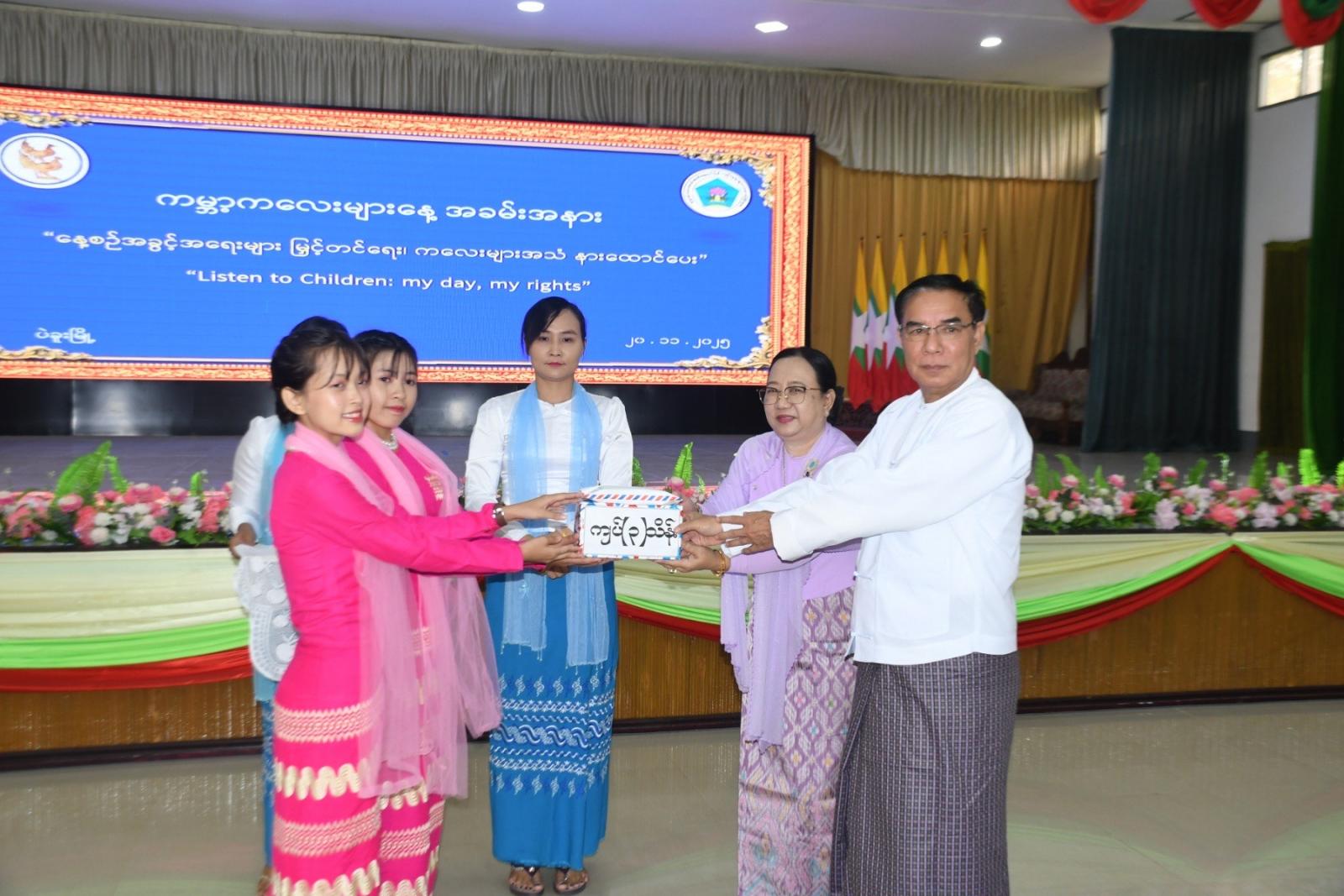 ထို့နောက် ပဲခူးတိုင်းဒေသကြီးဝန်ကြီးချုပ် ဦးမျိုးဆွေဝင်းက ကလေးသူငယ်များဟာ အနာဂတ်ကို ပုံဖော်ထုဆစ်မည့်သူများဖြစ်၍ နည်းမှန်လမ်းမှန်ဖြင့် ငယ်စဉ်ကတည်းက စနစ်တကျ ပြုစုစောင့်ရှောက်သွားဖို့ လိုအပ်မှာဖြစ်ကြောင်း၊ ကလေးသူငယ်များကို နိုင်ငံတော်က အားထားရတဲ့ လူ့စွမ်းအားအရင်းအမြစ်များအဖြစ် ကြီးပြင်းလာစေရန်အတွက် အသက်ရှင်သန်ခွင့်၊ ဖွံ့ဖြိုးတိုးတက်ခွင့်၊ ကာကွယ်စောင့်ရှောက်ခံပိုင်ခွင့်နှင့် ပါဝင်ဆောင်ရွက်ခွင့်တို့ကို အပြည့်အဝရရှိအောင် ဖြည့်ဆည်းဆောင်ရွက်ပေးသွားရမှာဖြစ်ကြောင်း၊ ကလေးသူငယ်များအတွက် ကျန်းမာရေးဆိုင်ရာအခွင့်အရေး၊ ပညာရေးဆိုင်ရာအခွင့်အရေး၊ ကလေးလူငယ်များ အလုပ်လုပ်ကိုင်ခြင်းနှင့် အဆိုးဝါးဆုံးပုံစံဖြင့် အလုပ်ခိုင်းစေခြင်း၊ မသန်စွမ်းကလေးသူငယ်များ/ ကလေးသူငယ်များအပေါ် အကြမ်းဖက်မှုမှ ကာကွယ်စောင့်ရှောက်ခြင်း စသည့်အခွင့်အရေးများကို ဌာနဆိုင်ရာများ၊ အစိုးရမဟုတ်သော ပြည်တွင်း/ပြည်ပ အသင်းအဖွဲ့များမှ ပူးပေါင်းဖော်ဆောင်ပေးသွားရမှာဖြစ်ကြောင်း၊ ၂၀၂၅ ခုနှစ်၊ ကမ္ဘာ့ကလေးများနေ့ ဆောင်ပုဒ်အတိုင်း ကလေးသူငယ်များ၏ စကားသံများကို များများနားထောင်ပြီး ကလေးသူငယ်တစ်ဦးချင်းစီတိုင်း၏ လိုအပ်ချက်များဖော်ဆောင်ပေးခြင်း၊ အခွင့်အရေးမြှင့်တင်ပေးခြင်းနှင့် အကျိုးစီးပွားရရှိခံစားနိုင်စေရေး ဝိုင်းဝန်းဖော်ဆောင်ပေးကြစေလိုကြောင်း ပြောကြားခဲ့သည်။