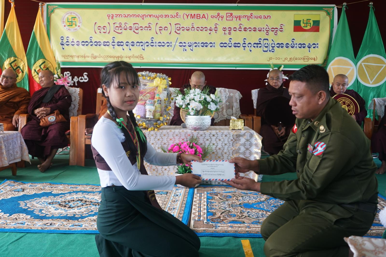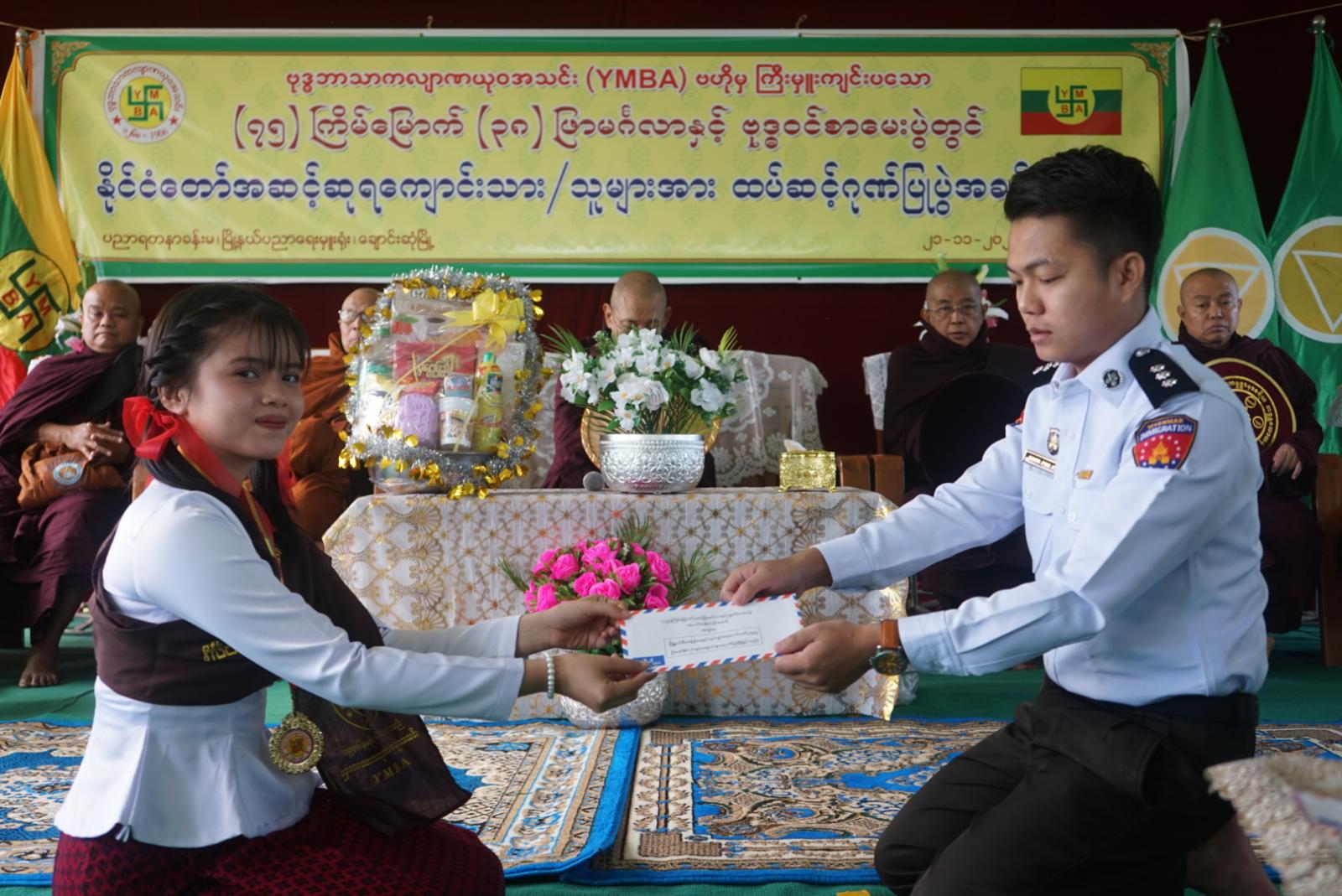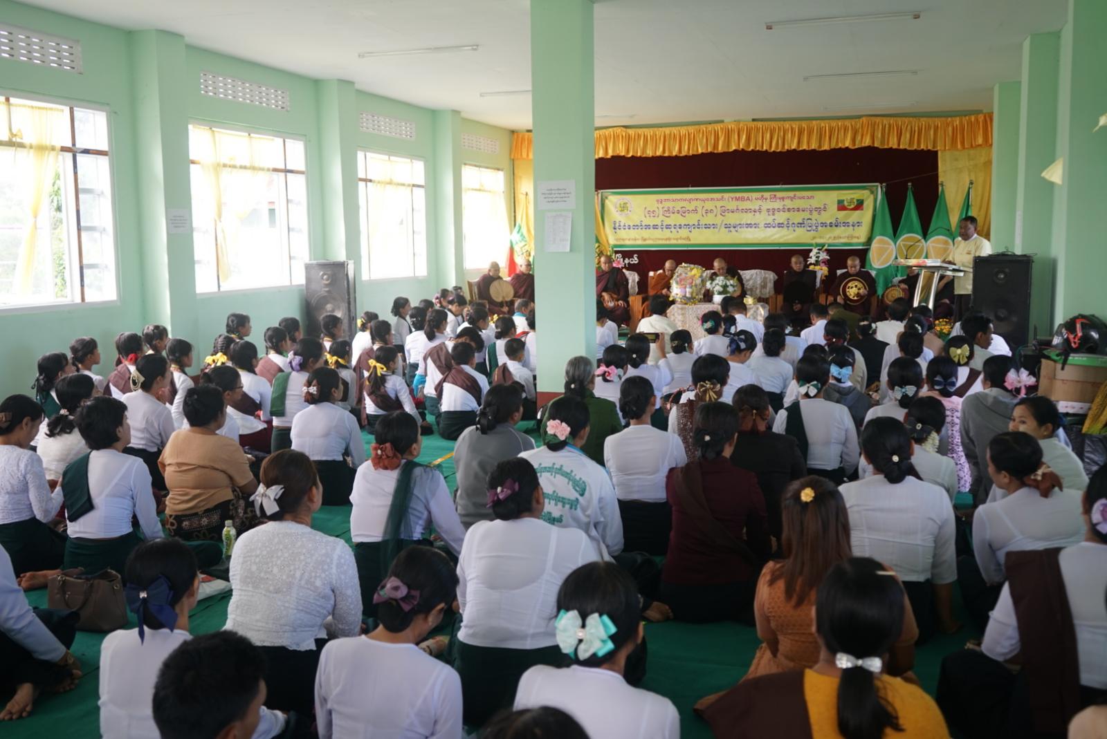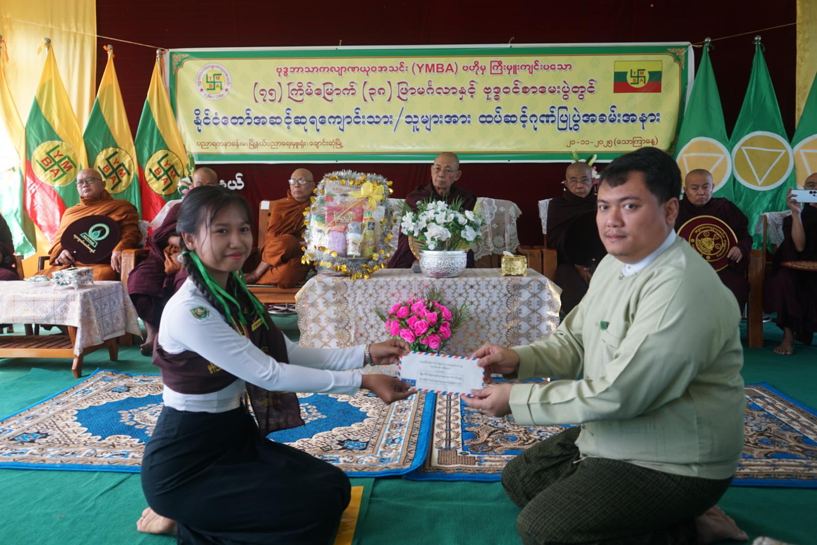 ဦးစွာ အခမ်းအနားကို နမောတဿ(၃)ကြိမ် ရွတ်ဆိုဖွင့်လှစ်ကာ အဘိဓဇမဟာရဋ္ဌဂုရု မြစေတီရဲကျောင်း ဆရာတော် ဘဒ္ဒန္တဝိမလဗုဒ္ဓိထံမှ ငါးပါးသီလခံယူဆောက်တည်ခြင်းနှင့် ဩဝါဒခံယူခဲ့ကြသည်။ ဆက်လက်၍ မွန်ပြည်နယ် ဗုဒ္ဓဘာသာကလျာဏ ယုဝအသင်း (YMBA) ဥက္ကဋ္ဌက အမှာစကားပြောကြားကာ တာဝန်ရှိသူများမှ နိုင်ငံတော်အဆင့် ထူးချွန်စွာ အောင်မြင်ခဲ့ကြသော ကျောင်းသား၊ ကျောင်းသူများအား ဆုများအသီးသီးချီးမြှင့်ပေးခဲ့ကြပြီး အဘိဓဇမဟာ ရဋ္ဌဂုရု မြစေတီရဲကျောင်း ဆရာတော် ဘဒ္ဒန္တဝိမလဗုဒ္ဓိထံမှ ရေစက်ချ တရားတော်နာယူပြီးနောက် တာဝန်ရှိသူများမှ ဆရာတော်ကြီးများအား နေ့ဆွမ်းဆက်ကပ် လှူဒါန်းခဲ့ကြသည်။