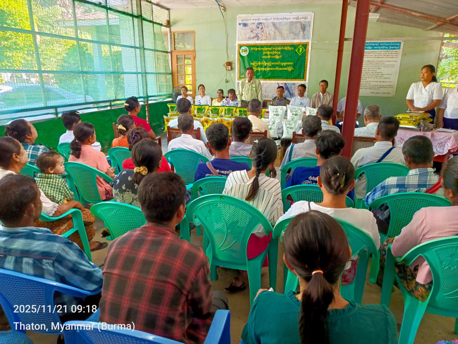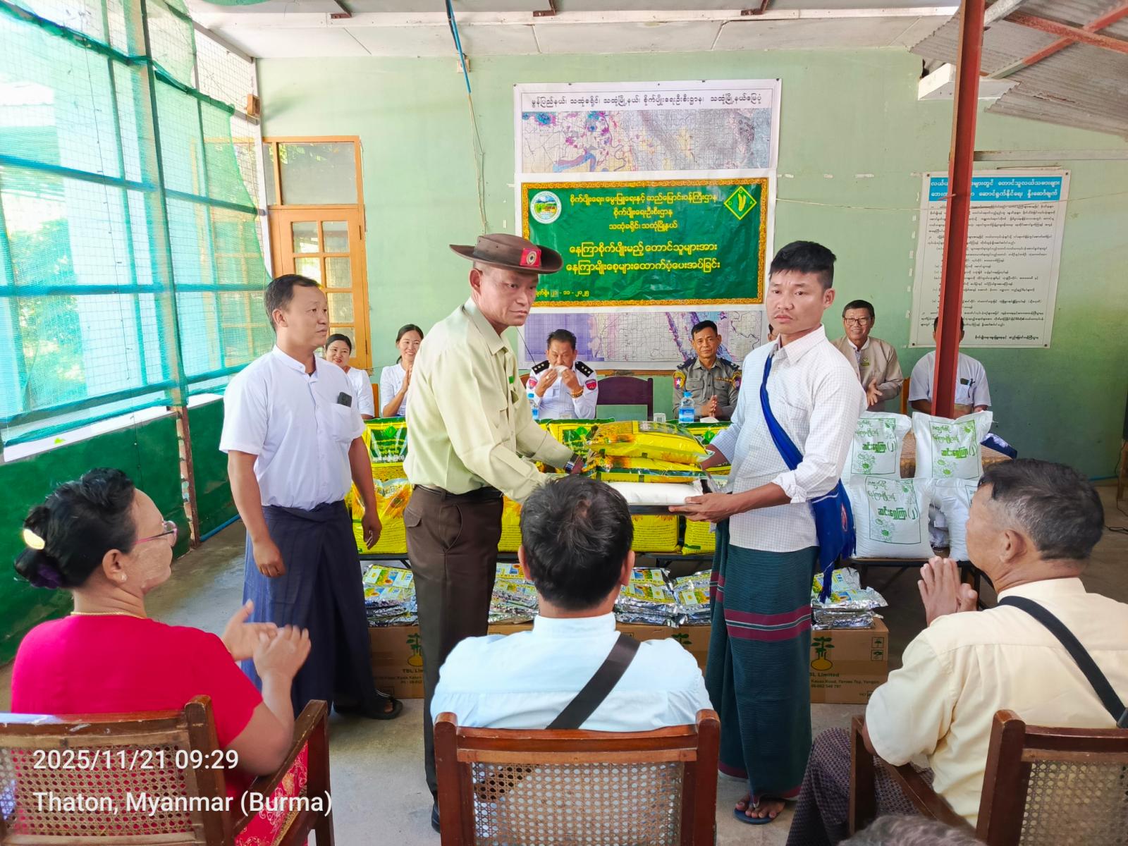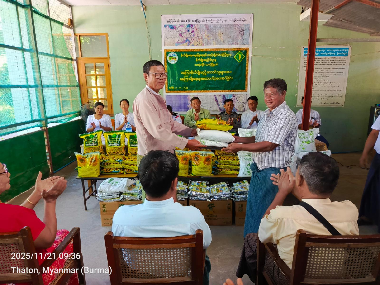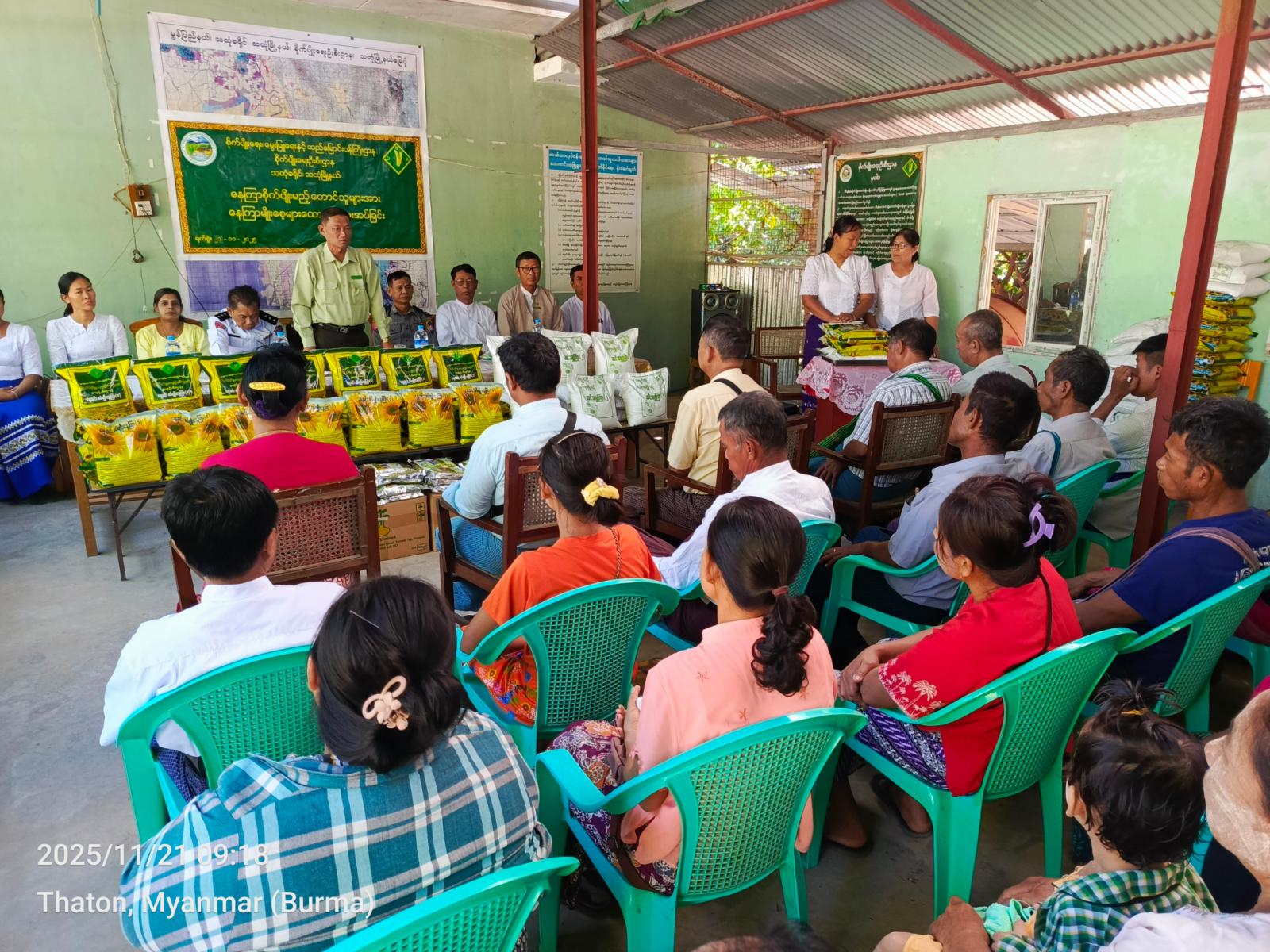 ယင်းနောက် မြို့နယ်စီမံခန့်ခွဲရေးနှင့်အုပ်ချုပ်ရေးကော်မတီဥက္ကဋ္ဌနှင့် အဖွဲ့ဝင်များ၊ မြို့နယ်စိုက်ပျိုးရေးဦးစီးဌာနမှူးနှင့် ဌာနဆိုင်ရာတာဝန်ရှိသူတို့က သထုံမြို့နယ်အတွင်း ဆီထွက်သီးနှံနေကြာ စိုက်ပျိုးကြမည့် တောင်သူများထံ နေကြာမျိုးစေ့များကို ထောက်ပံ့ပေးအပ်ကြရာ ကျေးရွာအလိုက် ကိုယ်စားလှယ်တို့က လက်ခံရယူခဲ့ကြသည်။