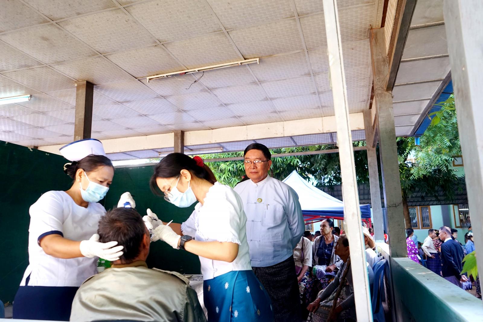 မကွေးမြို့ မြန်မာ့စီးပွားရေးဘဏ်တွင် နိုင်ငံ့ဝန်ထမ်း(အငြိမ်းစား)များအား ကျန်းမာရေးစောင့်ရှောက်မှုများကို လက်လှမ်းမီရရှိစေရေးနှင့်စိုက်ထုတ်ကုန်ကျရသော ဆေးကုသမှုစရိတ်လျော့နည်းကျဆင်းစေရေးအတွက် တိုင်းဒေသကြီးအစိုးရအဖွဲ့၏ စီစဉ်ဆောင်ရွက်မှုဖြင့် ကျန်းမာရေး စောင့်ရှောက်မှုအဖြစ် အခမဲ့ဆေးကုသပေးခြင်းကို ဖွင့်လှစ်ဆောင်ရွက်ထားရှိရာ နိုဝင်ဘာ ၂၁ ရက် ယနေ့နံနက် ၈ နာရီက တိုင်းဒေသကြီးဝန်ကြီးချုပ် ဦးတင့်လွင်နှင့် အဖွဲ့ဝင်ဝန်ကြီးများက နိုင်ငံ့ဝန်ထမ်း(အငြိမ်းစား)များအား အခမဲ့ဆေးကုသပေးခြင်းနှင့် တစ်ဦးလျှင် ဆန်တစ်ပြည်၊ ဆီ(၅၀)ကျပ်သားတို့အား ချီးမြှင့်ပေးနေမှုအား သွားရောက် ကြည့်ရှုအားပေးသည်။