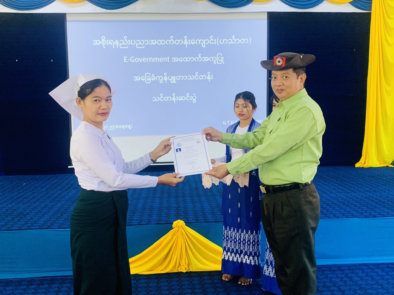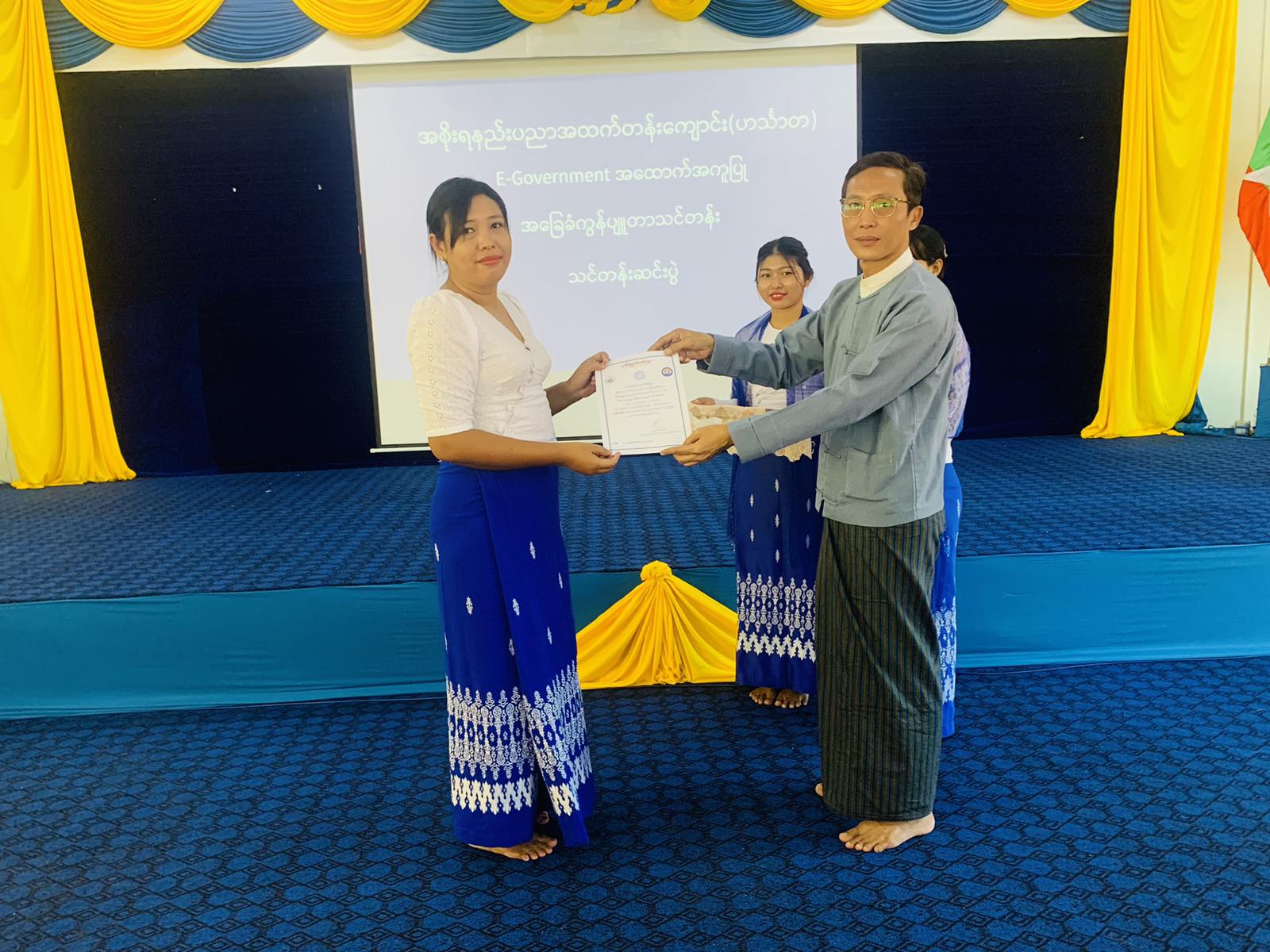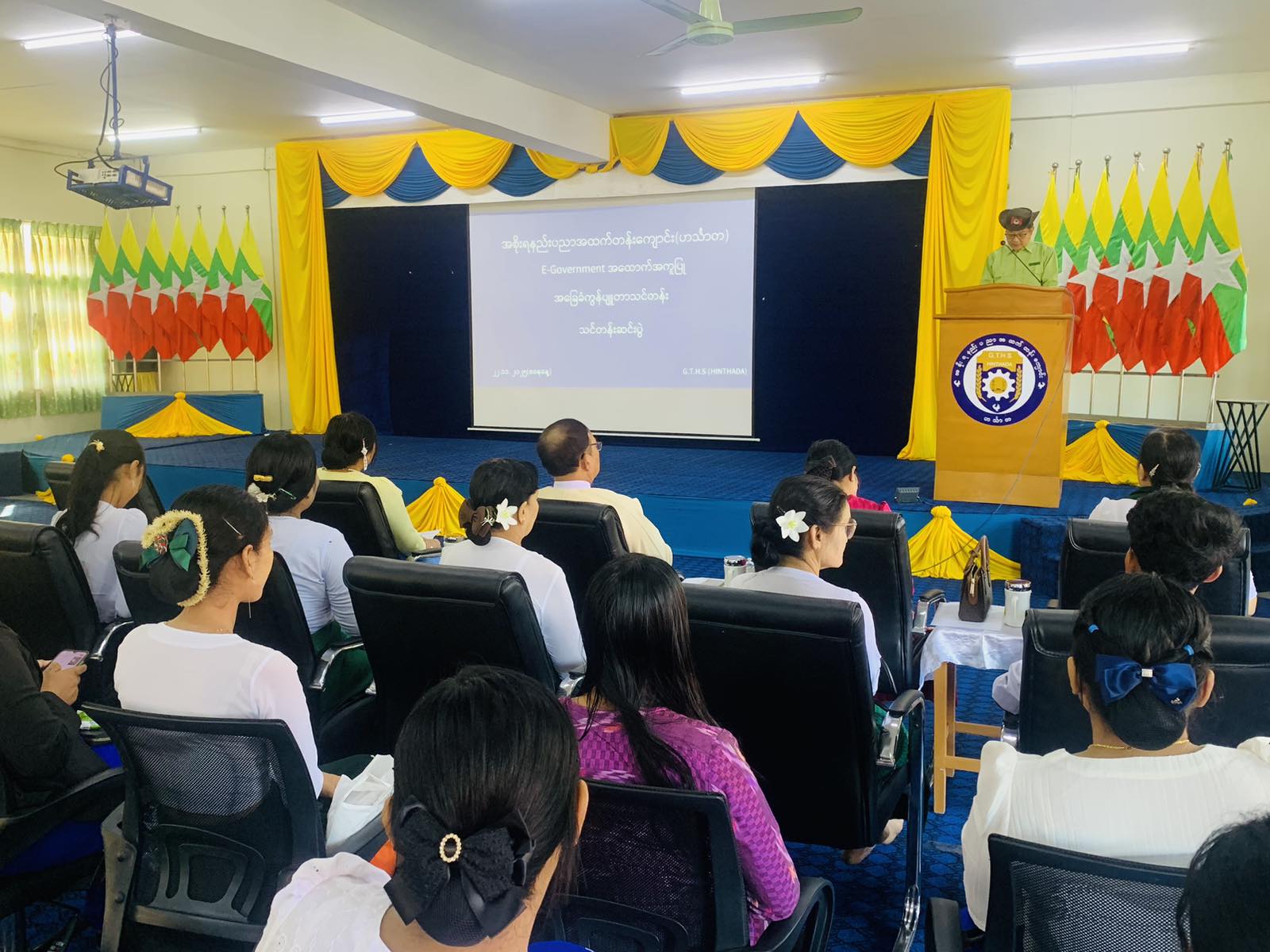 ဧရာဝတီတိုင်းဒေသကြီး၊ ဟင်္သာတခရိုင်၊ ဟင်္သာတမြို့နယ်ရှိ အစိုးရနည်းပညာ အထက်တန်းကျောင်း အစည်းဝေးခန်းမတွင် ယနေ့နံနက် ၉ နာရီက E-Government အထောက်အကူပြု အခြေခံကွန်ပျူတာသင်တန်းဆင်းပွဲ အခမ်းအနား ကျင်းပခဲ့သည်။