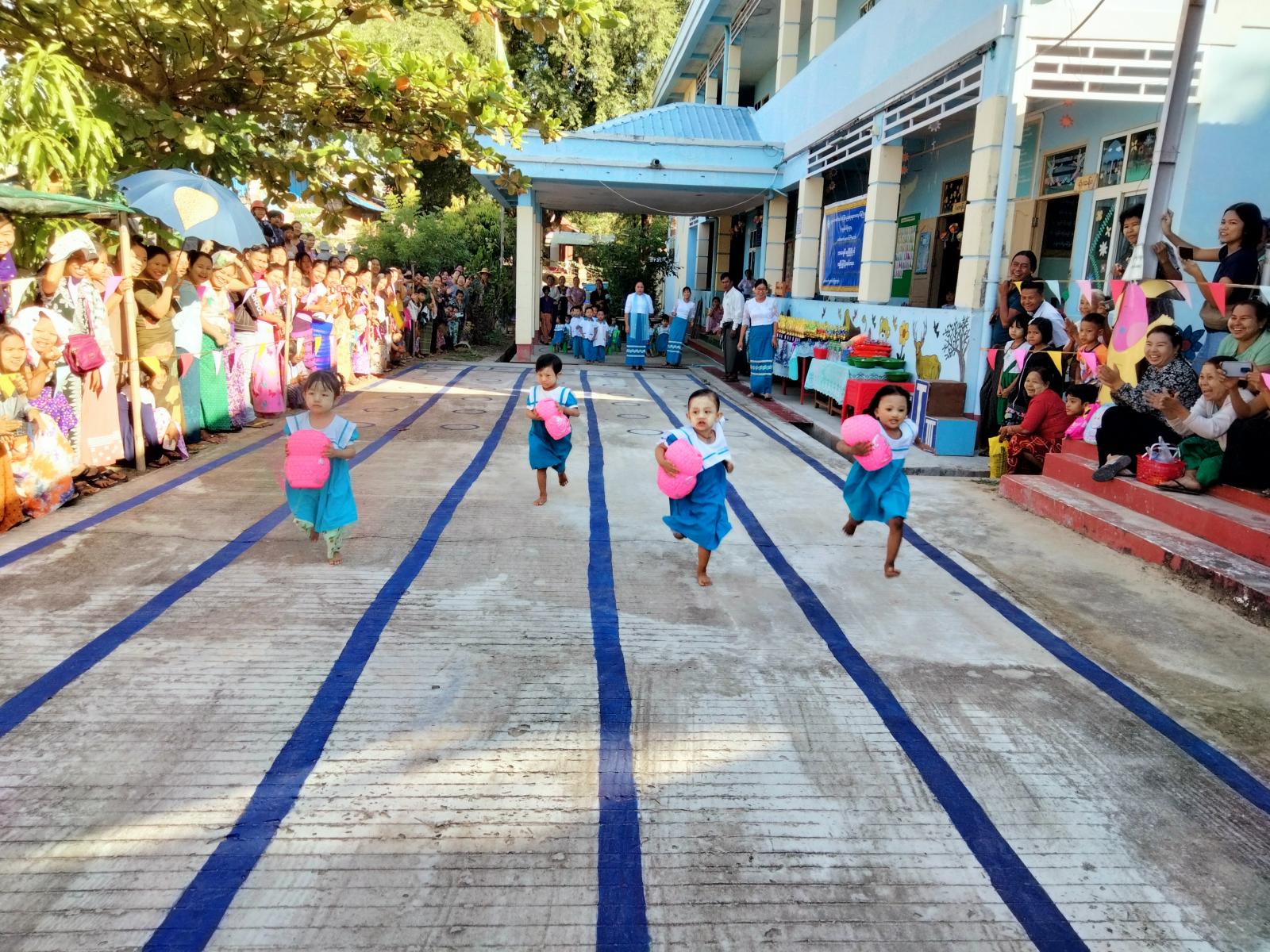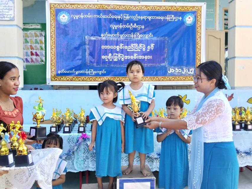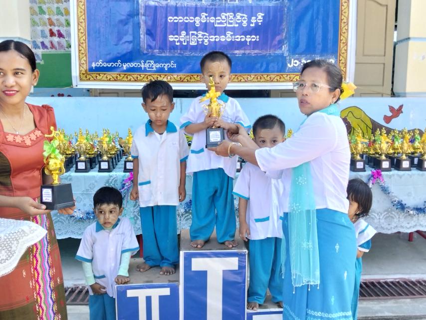 ထို့နောက် ကာယစွမ်းရည်ပြိုင်ပွဲတွင် ပထမ၊ ဒုတိယ၊ တတိယဆုနှင့် အထူးဆုရရှိကြသည့် သားငယ်၊ သမီးငယ်လေးများကို တာဝန်ရှိ ဆရာ/မများနှင့် အား/ကာမှူးတို့က ဆုများ ပေးအပ်ချီးမြှင့်ခဲ့ကြပြီး သားငယ်၊ သမီးငယ်လေးများ၏ မိဘများနှင့်အတူ ပျော်ရွှင်စွာပြိုင်ပွဲများ ကျင်းပပြုလုပ်ပေးခဲ့ကြကြောင်း သိရသည်။