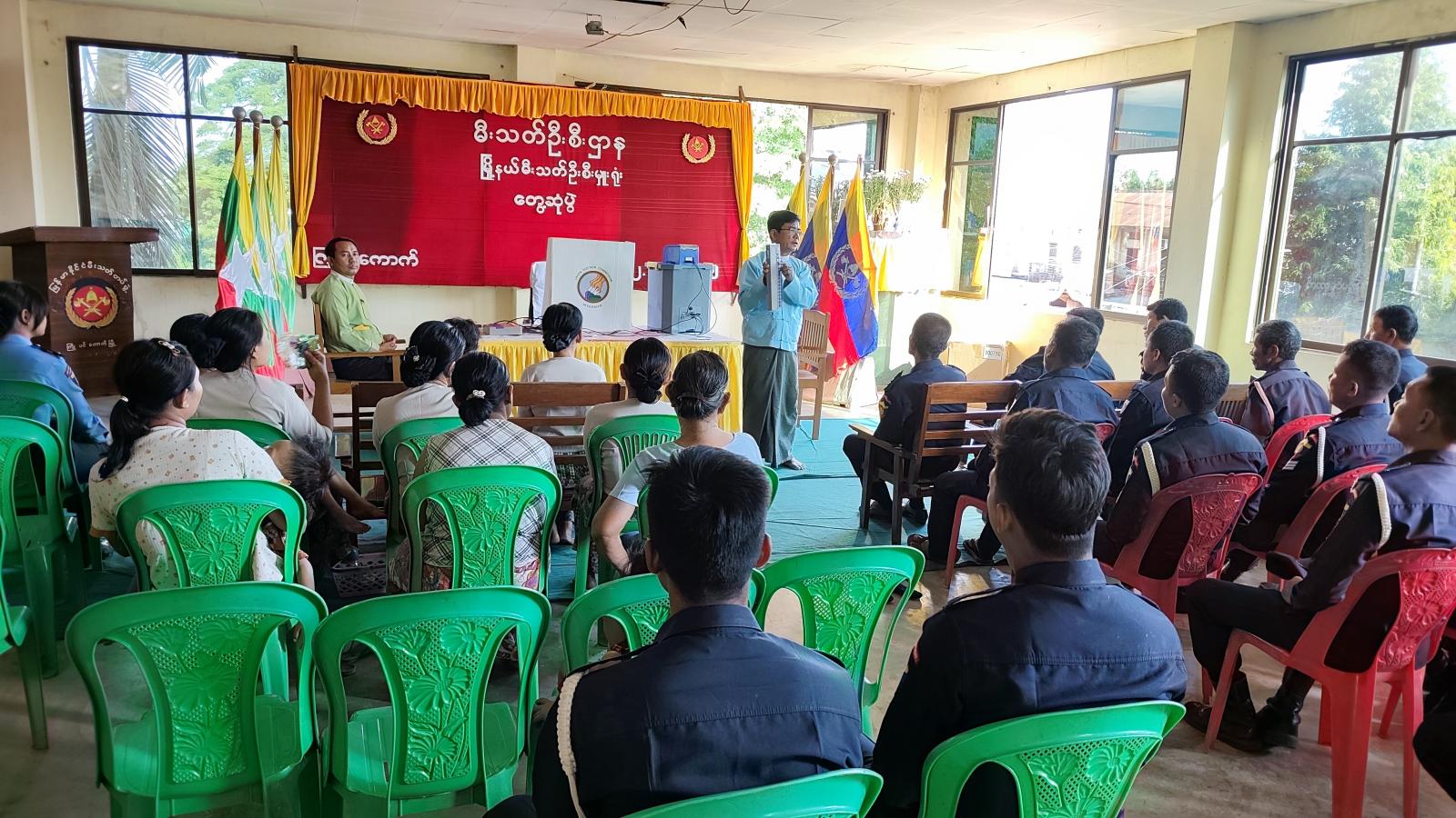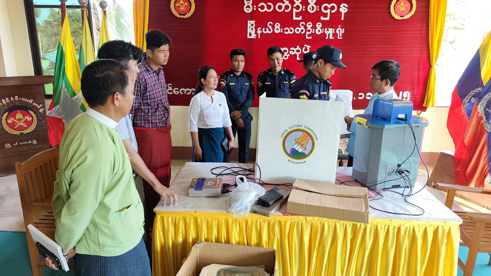 ပဲခူးတိုင်းဒေသကြီး သာယာဝတီခရိုင် ကြို့ပင်ကောက်မြို့နယ်တွင် မြန်မာအီလက်ထရောနစ်မဲပေးစက်အကြောင်း အသိပညာပေးရှင်းလင်းခြင်းနှင့် လက်တွေ့သရုပ်ပြ စမ်းသပ်မဲပေးခြင်းများကို ကွင်းဆင်းဆောင်ရွက်ပေးလျက်ရှိရာ နိုဝင်ဘာလ ၂၂ ရက်နေ့က မြို့နယ်မီးသတ်တပ်ဖွဲ့စခန်းရုံးတွင် ဆောင်ရွက်ခဲ့သည်။