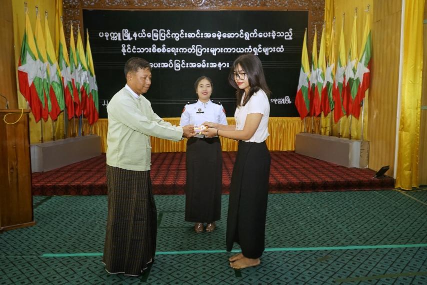 ထို့နောက် ခရိုင်စီမံခန့်ခွဲရေးနှင့်အုပ်ချုပ်ရေးကော်မတီဥက္ကဋ္ဌ ဦးမြင့်နိုင်၊ ဒုတိယဗိုလ်မှူးကြီး ကျော်ဇေလတ်၊ ခရိုင်ရဲတပ်ဖွဲ့မှူး ဒုတိယရဲမှူးကြီးသန်းဝင်း၊ ခရိုင်လဝကဦးစီးမှူး ဒေါ်ကြည်ကြည်ချို၊ မြို့နယ်စီမံခန့်ခွဲရေးနှင့်အုပ်ချုပ်ရေးကော်မတီဥက္ကဋ္ဌ ဦးအောင်စိုးမိုး၊ ဗိုလ်မှူးသက်ထွန်းနိုင်နှင့်ကော်မတီအဖွဲ့ဝင်များက မြို့ပေါ်ရပ်ကွက်များအတွင်း မြေပြင်ကွင်းဆင်းအခမဲ့ဆောင်ရွက်ပေးခဲ့သည့် ပြည်သူ ၂၄၅ ဦးထံ နိုင်ငံသားစိစစ်ရေးကတ်ပြားများ ပေးအပ်ကြသည်။