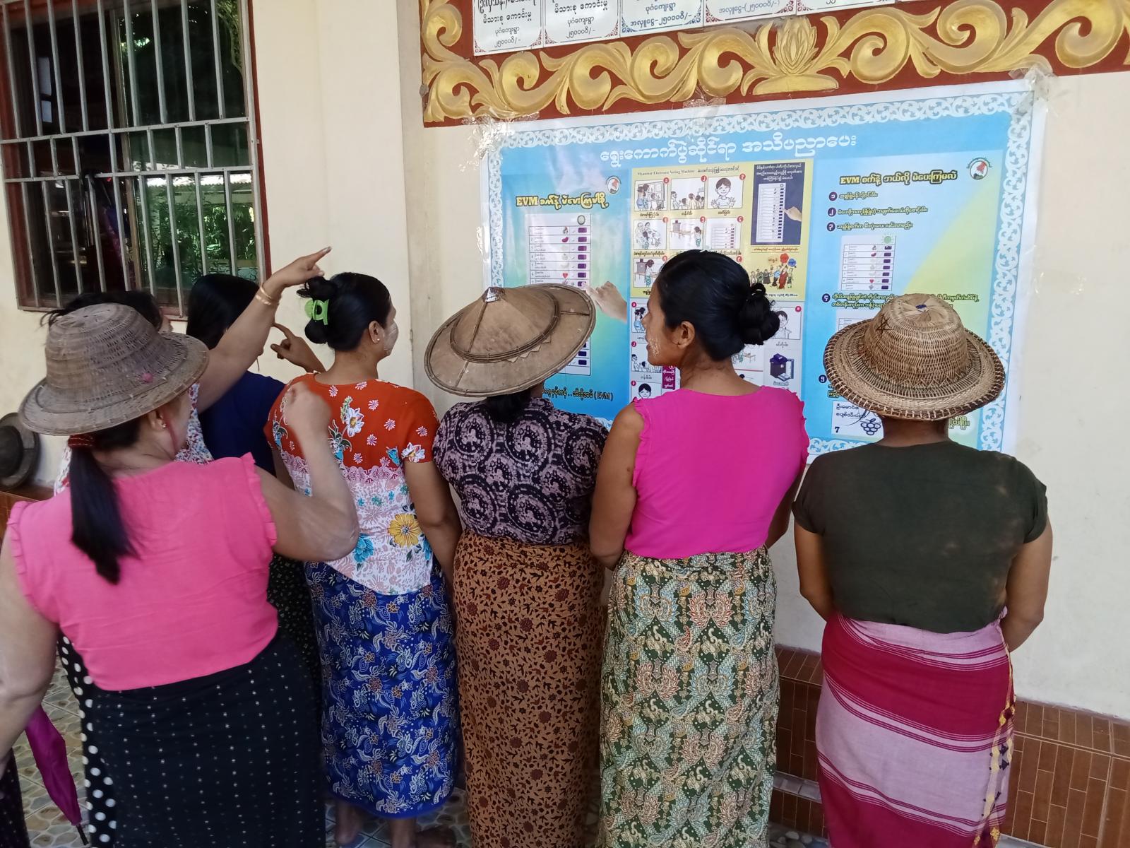 ဦးစွာ ပြန်ကြားရေးနှင့်ပြည့်သူဆက်ဆံရေးဦးစီးဌာနမှ မြို့နယ်ဦးစီးမှူး ဦးစိုးမိုးအောင်က အဖွင့်အမှာစကားပြောကြားပြီး၊ ရွေးကောက်ပွဲဆိုင်ရာ အသိပညာပေးနံရံကပ်စာစောင်တွင် EVM စက်ဖြင့် မဲပေးကြပါစို့၊ EVM နဲ့ ဘယ်လိုမဲပေးကြမလဲ၊ Myanmar Electronic Voting Machineစက်အသုံးပြု၍ မဲပေးပုံ အဆင့်ဆင့်၊ EVM စက်ဖြင့် မဲပေးနည်းအဆင့်ဆင့် ရုပ်ပုံများနှင့် ပယ်မဲမရှိ တိကျမှန်ကန် အီးဗွီအမ် (EVM) ဆောင်ပုဒ်တို့ပါရှိကြောင်း သိရသည်။