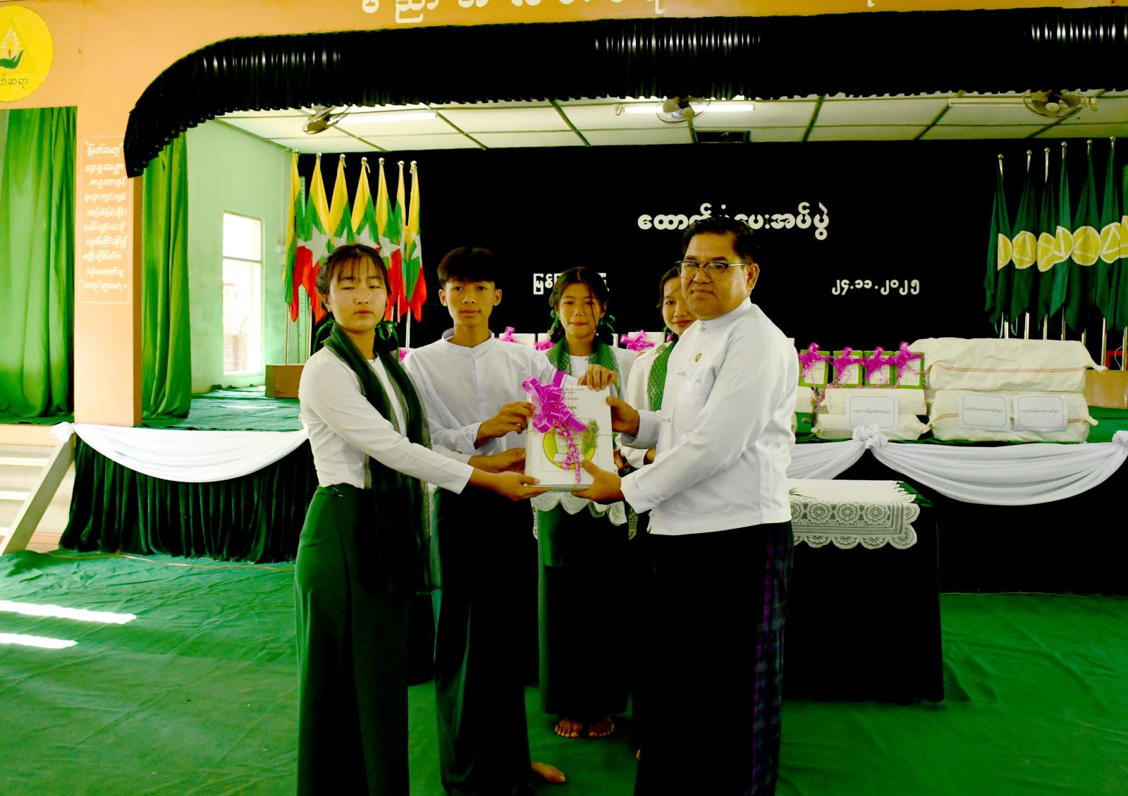 ဆက်လက်၍ ပြည်နယ်ဝန်ကြီးချုပ်၊ ပြည်နယ်တရားလွှတ်တော်တရားသူကြီးချုပ်နှင့် ပြည် နယ်လူမှုရေးရာဝန်ကြီးတို့က အခြေခံပညာ ထက်၊ လယ်၊ မူ အဆင့်အလိုက် ကျောင်းသား/ ကျောင်းသူ များထံ ပြဋ္ဌာန်းစာအုပ်များ၊ ကျောင်းဝတ်စုံများနှင့် ကျောင်းသုံးဗလာစာအုပ်များကို ထောက်ပံ့ပေးအပ် ခဲ့ကြရာ ကျောင်းကော်မတီအဖွဲ့ဝင် တစ်ဦးက ကျေးဇူးတင်စကားပြန်လည်ပြောကြားသည်။