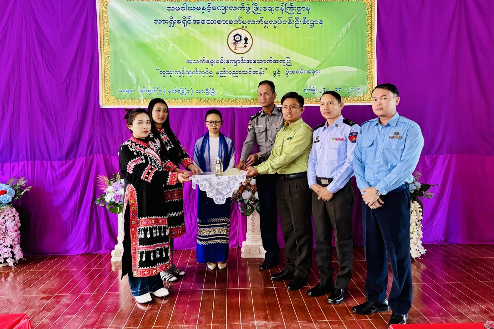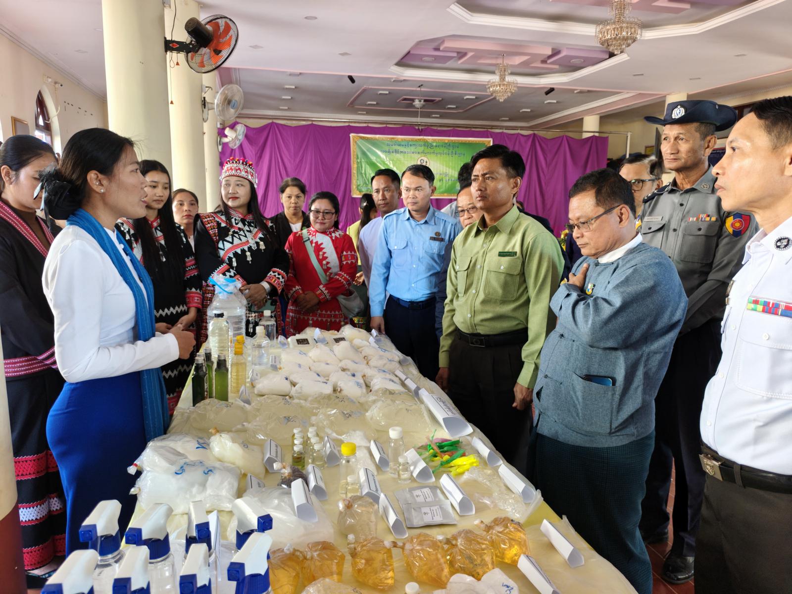 ထို့နောက် ခရိုင်စီမံခန့်ခွဲရေးနှင့်အုပ်ချုပ်ရေးကော်မတီဥက္ကဋ္ဌနှင့် ဌာနဆိုင်ရာ တာဝန်ရှိသူများက လူသုံးကုန်ထုတ်လုပ်မှုနည်းပညာသင်တန်းအတွက် သင်သန်းသား၊ သင်တန်းသူများလက်ဝယ်သို့ ကုန်ကြမ်းပစ္စည်းများ အသီးသီးပေးအပ်ခဲ့သည်။
