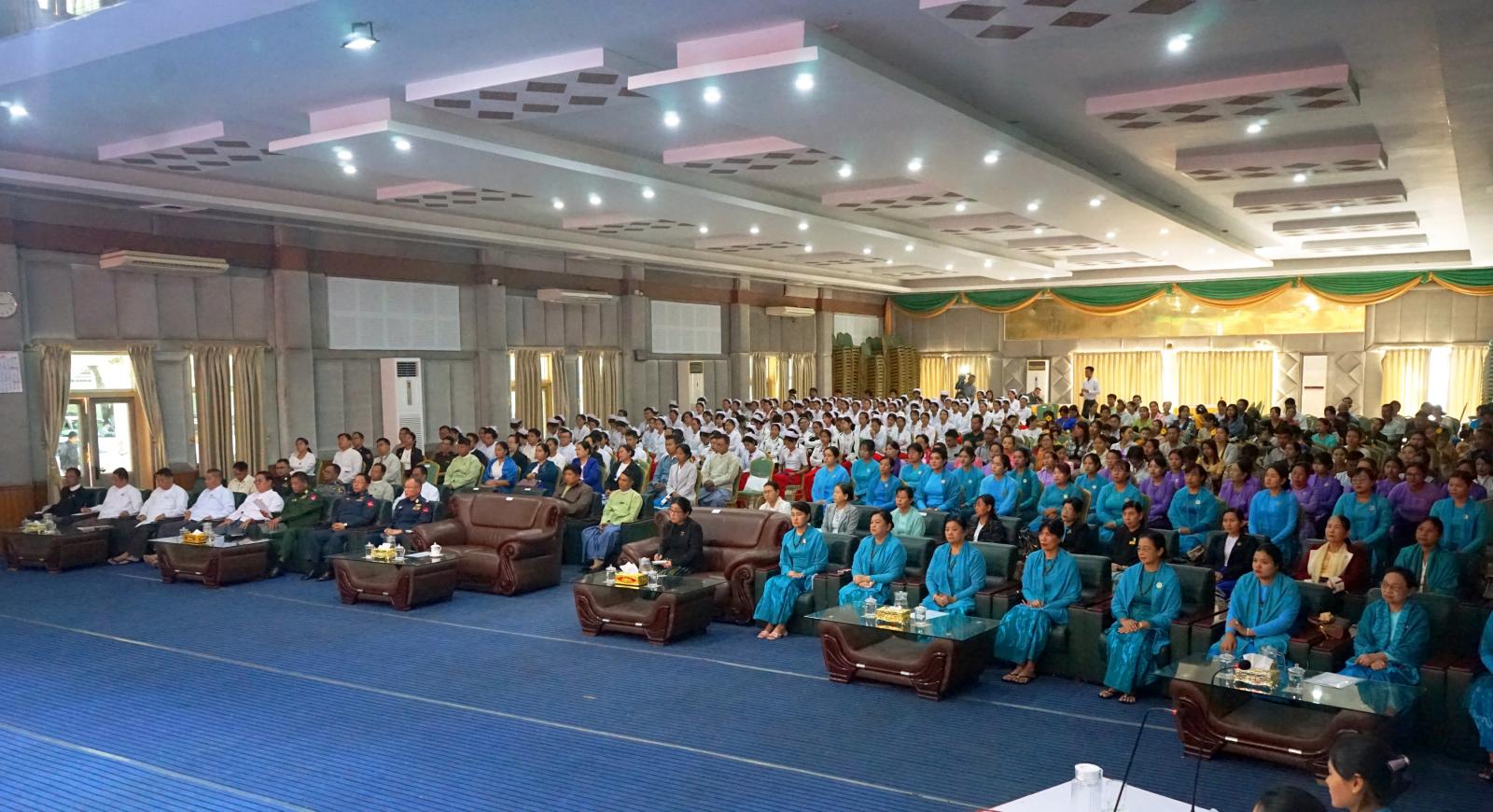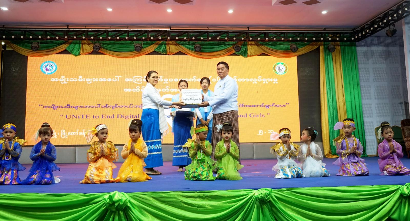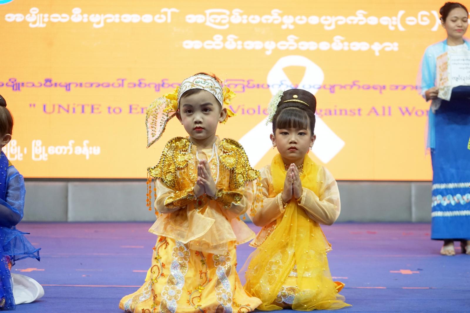 ထို့နောက် အမျိုးသမီးများအပေါ် အကြမ်းဖက်မှုပပျောက်ရေးဆိုင်ရာ အသိပညာပေးဗီဒီယိုကလစ်အား ပြသခဲ့ပြီး မိခင်မေတ္တာမူကြိုကျောင်းမှသမီးငယ်လေးများမှ “ဗမာမလေး” တေးသီချင်းဖြင့်လည်းကောင်း၊ မကွေးကလေးပြုစုရေးဌာန မှ သမီးငယ်လေးများမှ ’’သဘင်သည်မလေးမနှင်းဆီ” တေးသီချင်းဖြင့်လည်းကောင်း၊ မကွေးမူကြိုကျောင်းမှ ကလေးငယ်လေးများမှ ”အတူတွဲကာ” တေးသီးချင်းဖြင့်လည်းကောင်း ကပြဖျော်ဖြေတင်ဆက်မှုများကို ကြည့်ရှုအားပေးခဲ့ကြပြီး ကပြဖျော်ဖြေတင်ဆက်ခဲ့ကြသည့် သားငယ်သမီးငယ်လေးများ အားတိုင်းဒေသကြီးဝန်ကြီးချုပ်က ဂုဏ်ပြုဆုတော်ငွေနှင့် အမှတ်တရလက်ဆောင်ပစ္စည်းများ ပေးအပ်ခဲ့ကြောင်း သိရသည်။