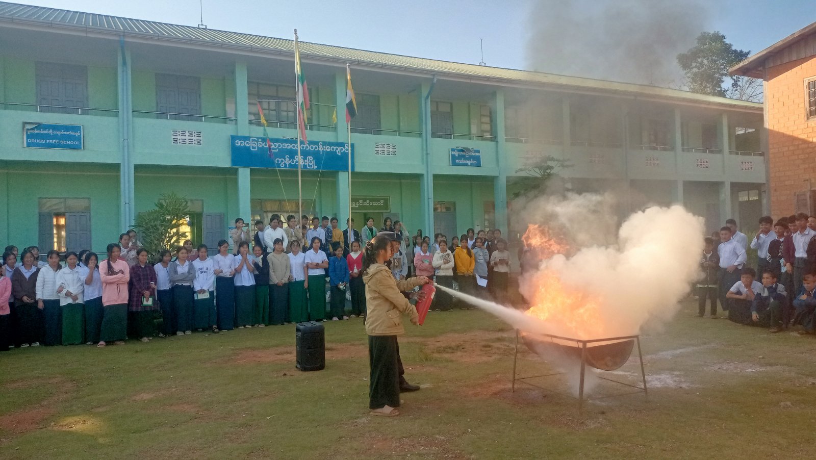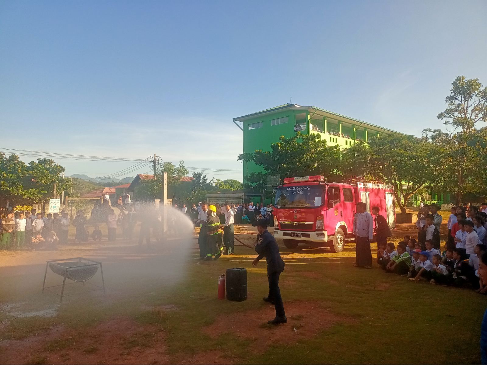 ထိုနောက် မီးဘေးလုံခြုံရေး အသိပညာပေးလက်ကမ်းစာစောင် ဖြန့်ဝေပြီး မီးသတ်ဆေးဗူး အသုံးပြုနည်း၊ မီးဘေးအန္တရာယ်ကြုံတွေ့ပါက ဆောင်ရွက်ရန်နည်းလမ်းများ လက်တွေ့သရုပ်ပြသခဲ့ကြောင်း သိရသည်။
