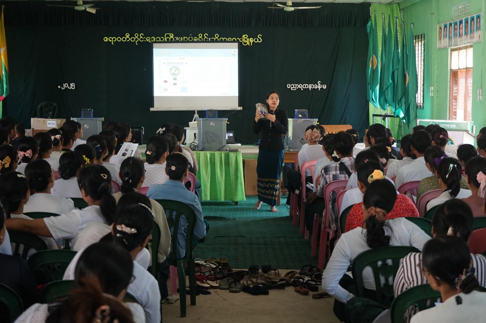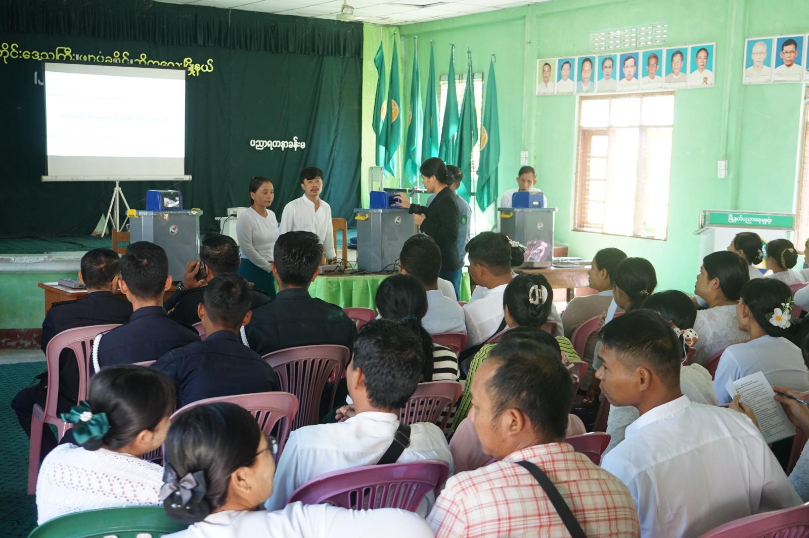 ဆက်လက်၍ မြို့နယ်ရွေးကော်ပွဲကော်မရှင်အဖွဲ့ခွဲဥက္ကဋ္ဌ၊ ဦးခင်မောင်ရင်က ရွေးကောက်ပွဲဆိုင်ရာ အချက်အလက်များ၊ သိရှိရန်လိုအပ်သည်များအား ရှင်းလင်းဆွေးနွေးပြီး မြို့နယ်ရွေးကောက်ပွဲ ကော်မရှင်အဖွဲ့ခွဲရုံး၊ ဦးစီးအရာရှိ ဒေါ်ပိုးဒါလီက မြန်မာအီလက်ထရောနစ်မဲပေးစက် (MEVM-INSTALLATION) တပ်ဆင်ကိုင်တွယ် အသုံးပြုခြင်းဆိုင်ရာများအား လက်တွေ့သရုပ်ပြ ရှင်းလင်းပို့ချသည်။