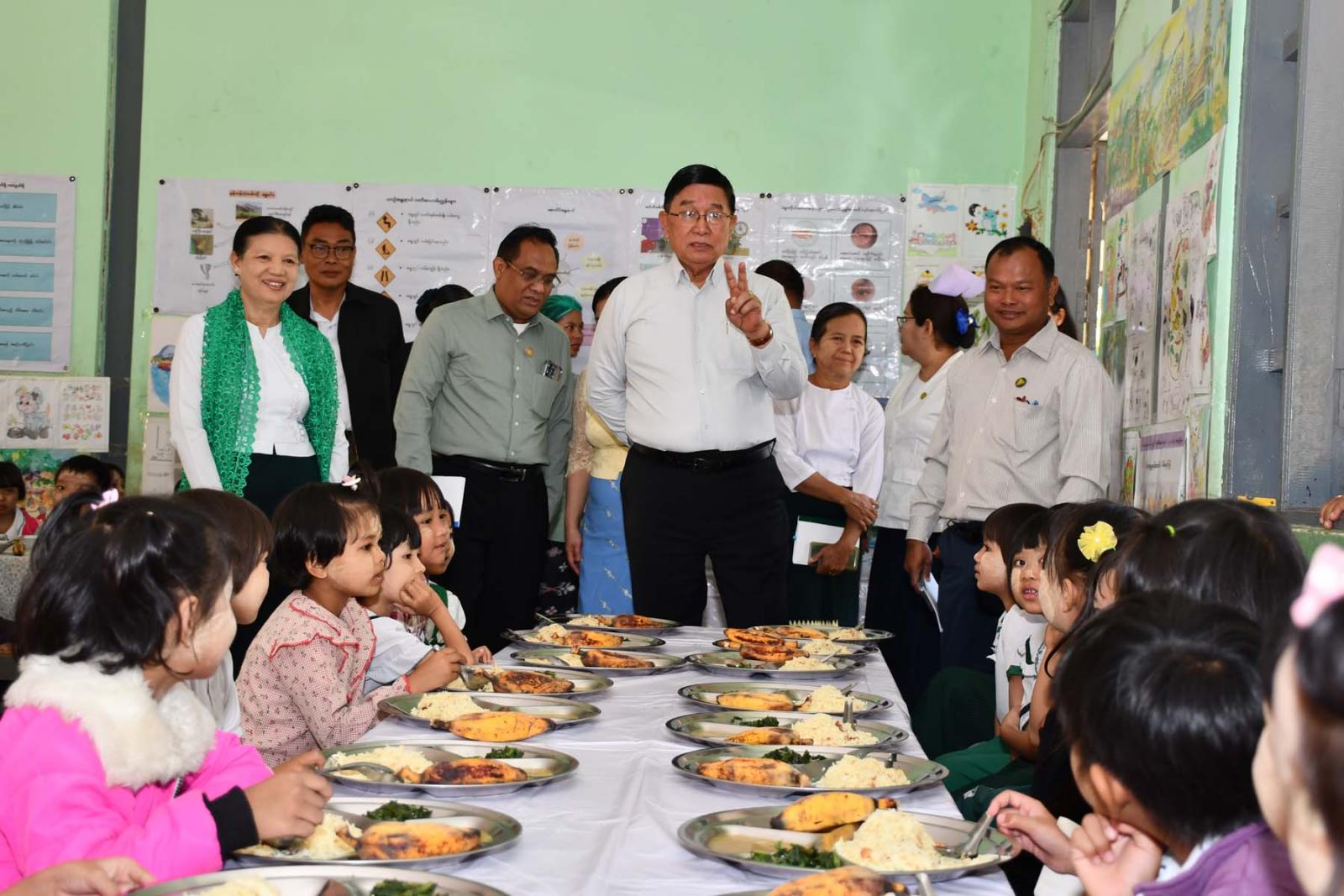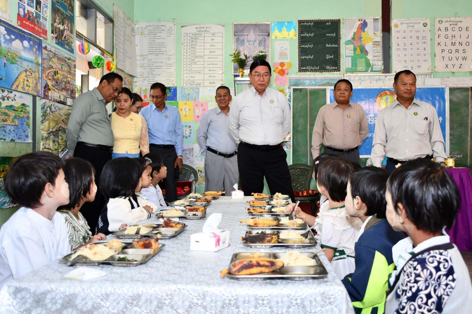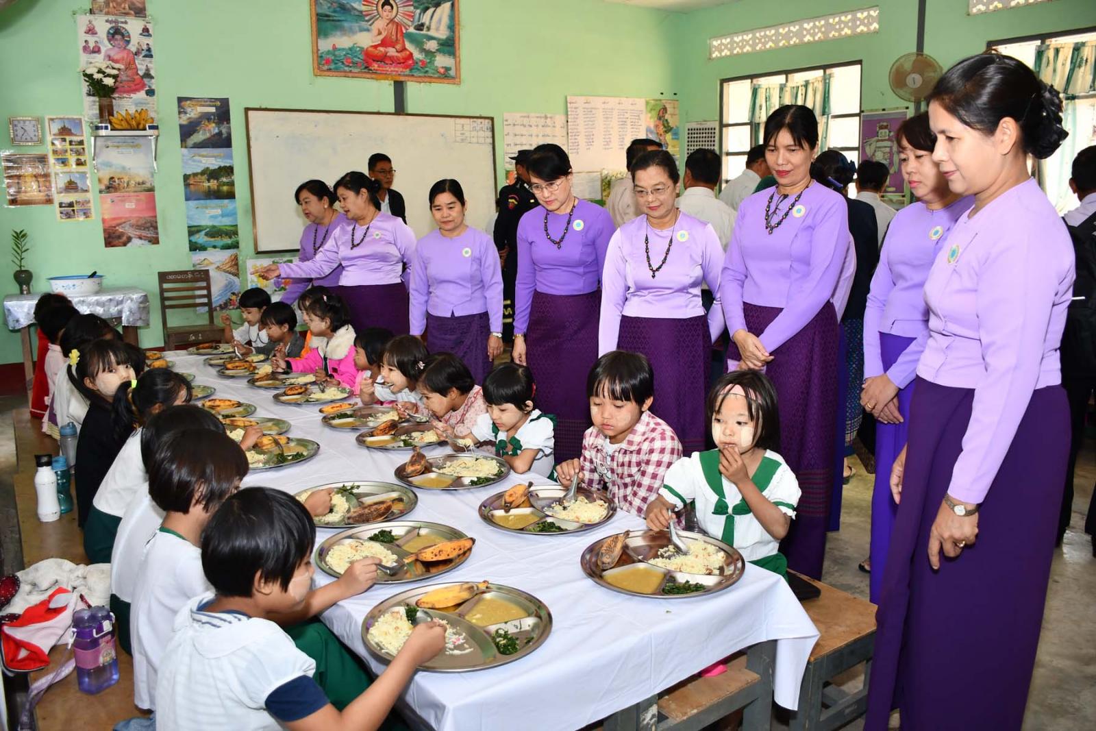 ဦးစွာ မကွေးတိုင်းဒေသကြီးဝန်ကြီးချုပ် ဦးတင့်လွင်နှင့် တာဝန်ရှိသူများသည် မင်းဘူးမြို့ အမှတ်(၂) အခြေခံပညာအထက်တန်းကျောင်းသို့ရောက်ရှိပြီး အဆိုပါကျောင်းဝင်းအတွင်း၌ Clean and Green School အဖြစ် အဆင့်မြှင့်တင်ဆောင်ရွက်ထားရှိမှုများကို ကြည့်ရှုစစ်ဆေးကာ မြို့နယ် ပြည်သူ့ ကျန်းမာရေးဦးစီးဌာနမှ ကျောင်းတွင်းအာဟာရကျွေးမွေးခြင်း အစီအစဉ်ဖြင့် ကျောင်းသား၊ ကျောင်းသူ လေးများအား အာဟာရတိုက်ကျွေးနေမှုများကို လည့်လည်ကြည့်ရှုအားပေးသည်။