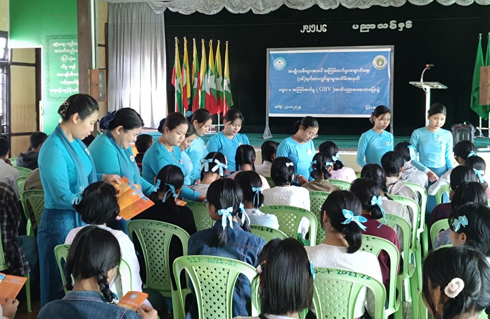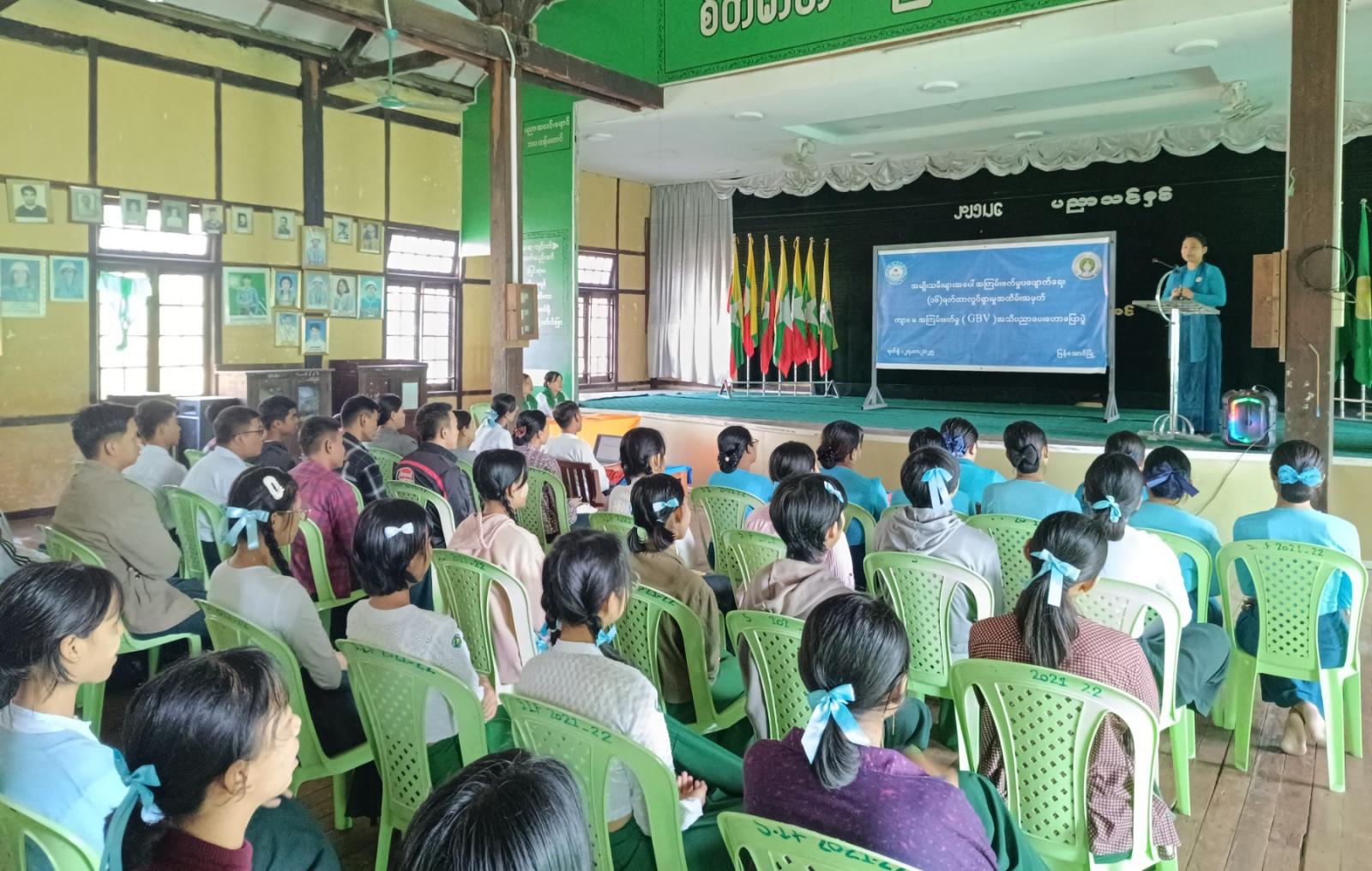 ဧရာဝတီတိုင်းဒေသကြီး၊ မြန်အောင်ခရိုင်၊ မြန်အောင်မြို့နယ်တွင် အမျိုးသမီးများအပေါ် အကြမ်းဖက်မှုပပျောက်ရေး (၁၆) ရက်တာလှုပ်ရှားမှု ကျား/မ ရေးရာအခြေပြုအကြမ်းဖက်မှု GBV အသိပညာပေးအစီအစဥ်များကို ဆောင်ရွက်လျက်ရှိရာ ယနေ့နံနက်က အ.ထ.က (၁) မြန်အောင်၌ ကျောင်းသား၊ ကျောင်းသူများကို အသိပညာပေး ဟောပြောပွဲဆောင်ရွက်ခဲ့သည်။