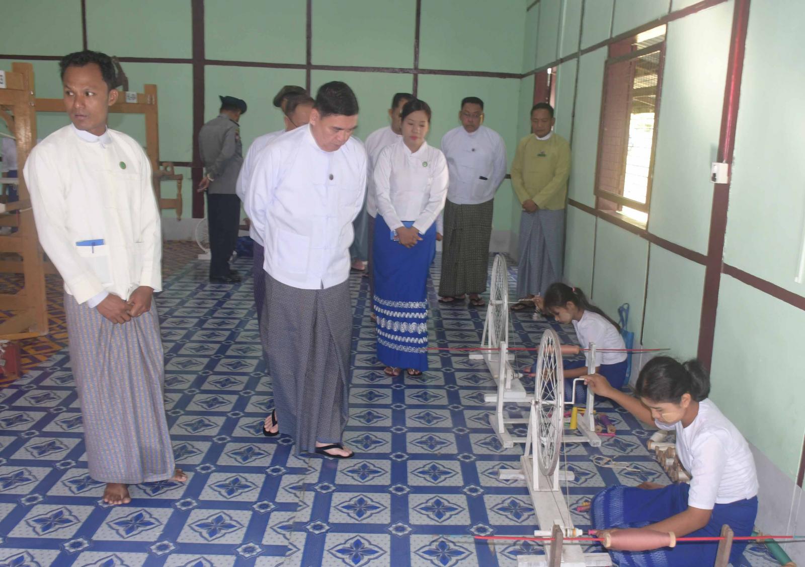 ရခိုင်ပြည်နယ်ဝန်ကြီးချုပ် ဦးထိန်လင်းနှင့် အဖွဲ့ဝင်များ၊ ဌာနဆိုင်ရာ တာဝန်ရှိသူများသည် ယနေ့နံနက်ပိုင်းက ရက်ကန်းနှင့်အသက်မွေးပညာသင်တန်းကျောင်း (စစ်တွေ)၌ သင်တန်းသူများအား ဆရာ၊ ဆရာမများက လက်တွေ့သင်ကြားပြသနေမှုကို လှည့်လည်ကြည့်ရှုအားပေးသည်။