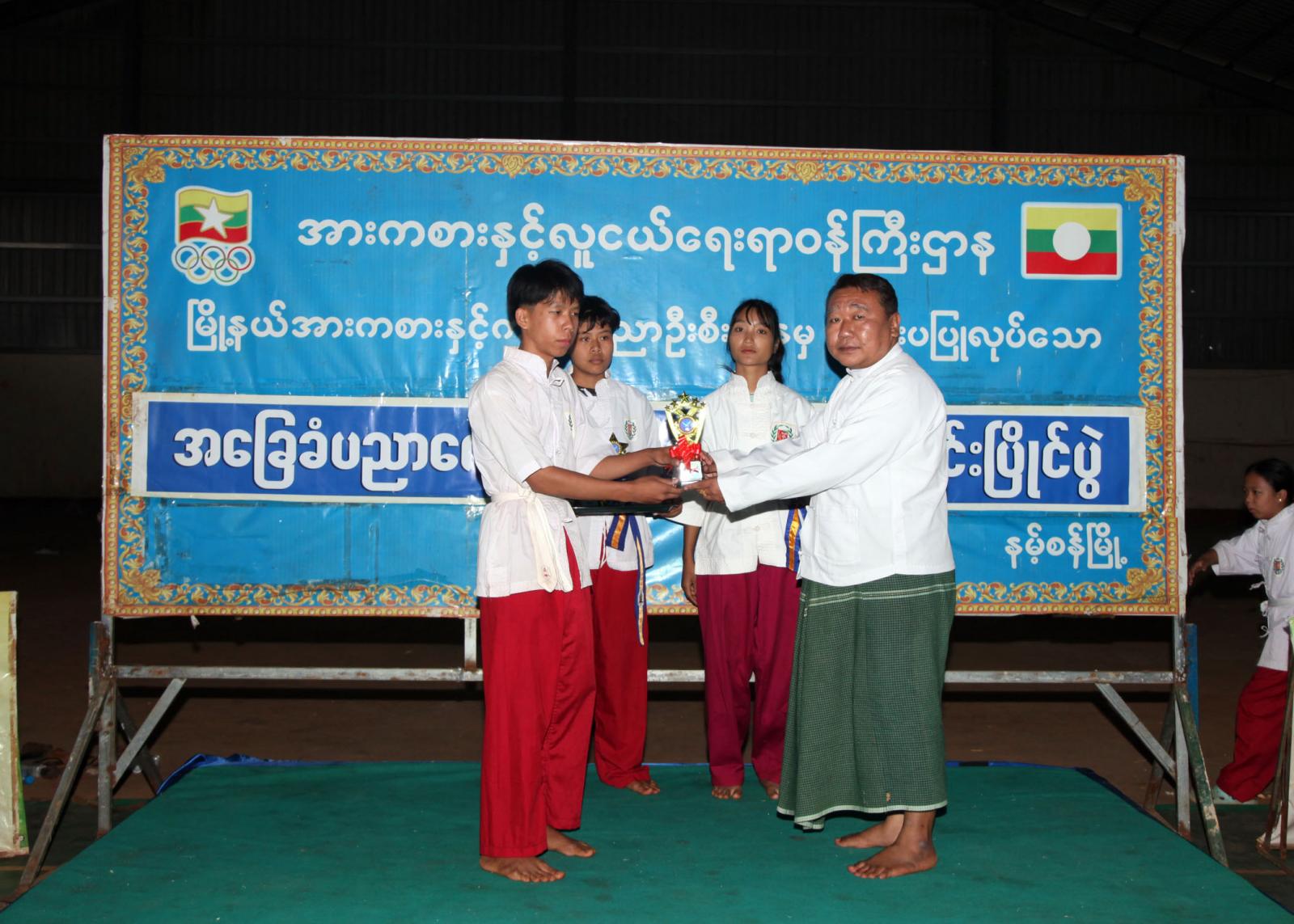 ထို့နောက် မြန်မာ့သိုင်းဗန်တိုအတိုက် ကျား/မ (၂၀-၂၅ ၊၂၅-၃၀ ၊ ၃၀-၃၅ ၊ ၃၅-၄၀ ၊ ၄၀-၄၅ ၊ ၄၅ -၅၀ ၊၅၀-၅၅) ကီလိုတန်း ကျား/မ နှင့် မြန်မာ့သိုင်း (၆၃) မောင်း အလှပြ ပြိုင်ပွဲတို့တွင် ပထမ၊ ဒုတိယနှင့်တတိယဆုရရှိသူများကို ခရိုင်ပညာရေးမှူး ဦးကျော်နိုင်သွင်၊ မြို့နယ်အားကစားမှူး ဦးအောင်ကိုကို၊ မြို့နယ်ပညာရေးမှူး ဦးဇင်မင်းထွန်း၊ မြို့နယ်လက်ဝှေ့ဆပ်ကော်မတီမှ တာဝန်ရှိသူများနှင့် အခြေခံပညာ အထက်တန်းကျောင်းအုပ်ကြီးများက ဆုများ အသီးသီးပေးအပ်ချီးမြှင့်ခဲ့ကြသည်။