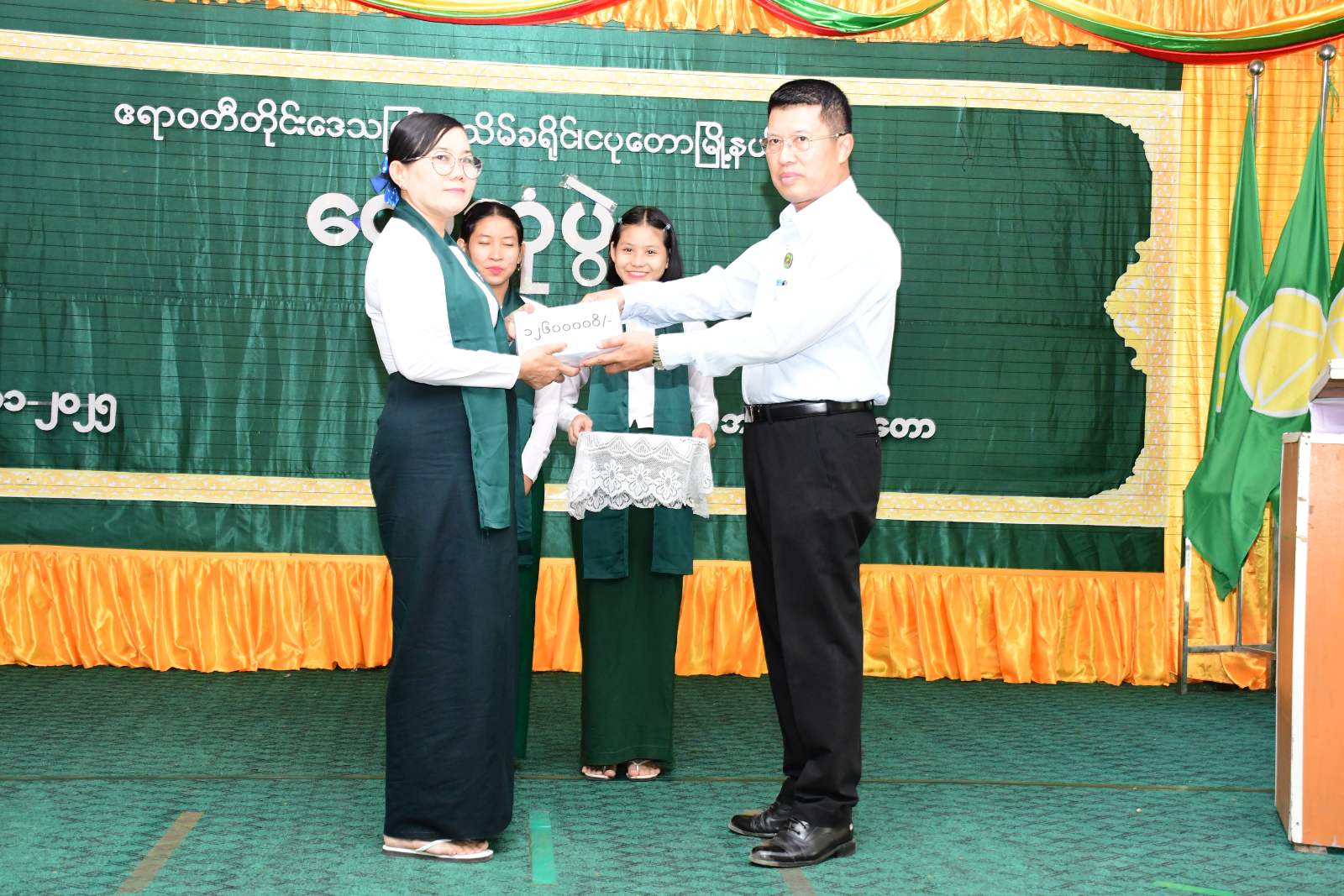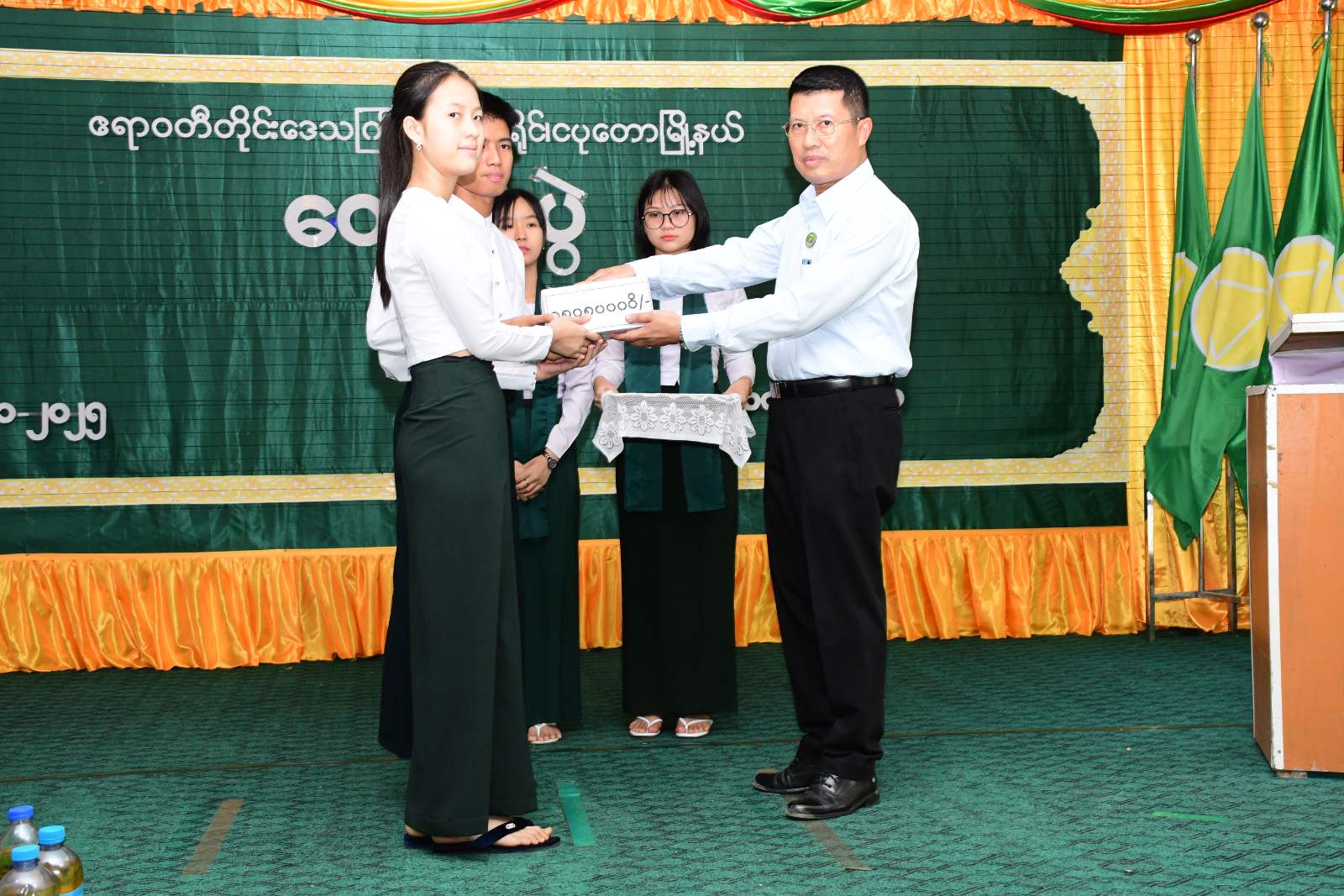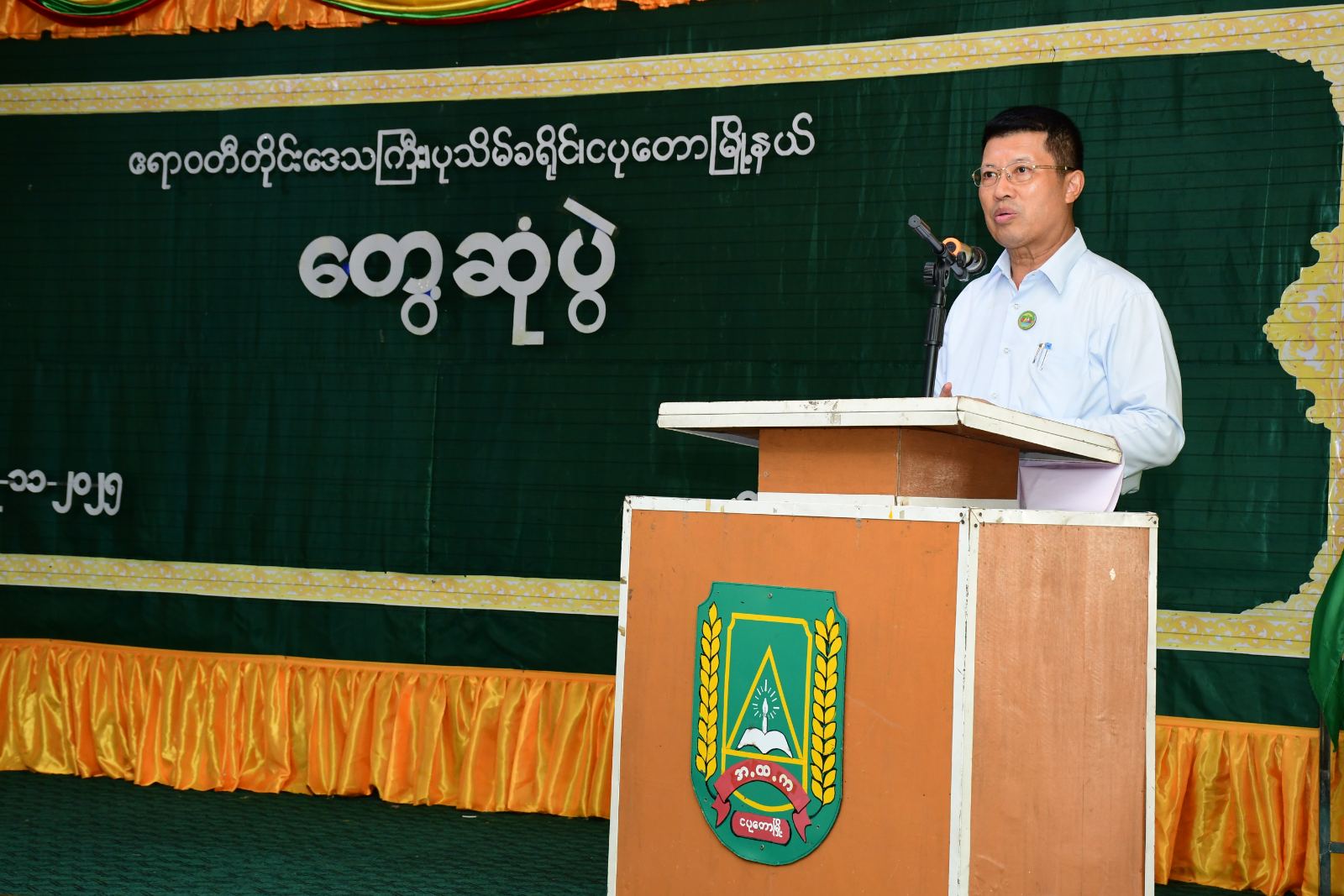 ဦးစွာ တိုင်းဒေသကြီးဝန်ကြီးချုပ်က“ တက္ကသိုလ်ဝင်စာမေးပွဲအောင်ချက်မြင့်မားရေးအတွက် တက္ကသိုလ်ဝင်စာမေးပွဲ အောင်စာရင်းထွက်ပြီးသည့် အခါတိုင်း ပြန်လည်သုံးသပ်ခြင်းများကို ဆောက်ရွက်ခဲ့ပြီး နှစ်စမှ နှစ်ဆုံးအထိ အားနည်းချက်အားသာချက်များအား ပြင်ဆင်ဆောင်ရွက်ခြင်းများအား တွန်းတွန်းတိုက်တိုက်ဖြင့်ကြပ်မတ်ဆောင်ရွက်ခဲ့ပါကြောင်း၊ တက္ကသိုလ်ဝင်စာမေးပွဲတွင် အထောက်အကူပြုနိုင်ရေးအတွက် တက္ကသိုလ်များမှ ဆရာ၊ ဆရာများ၊အခြေခံပညာအထက်တန်းအဆင့် သင်ကြားသည့် ဆရာ၊ ဆရာမများဖြင့်အရည်အသွေး မြှင့်ဆွေးနွေးပွဲများကို ခရိုင်များအလိုက်ပြုလုပ်ခဲ့ပါကြောင်း၊ တိုင်းဒေသကြီးသည် စိုက်ပျိုးရေး၊ မွေးမြူရေးကိုအခြေခံသည့် တိုင်းဒေသကြီးဖြစ်သည်နှင့်အညီ တိုင်းဒေသကြီး၏ စိုက်ပျိုးရေး၊ မွေးမြူရေးလုပ်ငန်းများအတွက် အထောက်အကူဖြစ်စေမည့် စိုက်ပျိုးရေးနှင့်မွေးမြူရေးတက္ကသိုလ်ကို မအူပင်မြို့တွင်ဖွင့်လှစ်ပြီးဖြစ်ပါကြောင်း၊ ယခုနှစ်တက္ကသိုလ်ဝင်တန်းစာမေးပွဲတွင် ထူးချွန်စွာအောင်မြင်သော ထူးချွန်ကျောင်းသား၊ ကျောင်းသူ (၃၀၀)ဦးအား အဆင့်မြင့်ပညာများအား ဘွဲ့ရသည်အထိ ဆက်လက်သင်ကြားနိုင်ရေးအတွက် ဦးဋ္ဌေးမြင့်ပညာသင်ဆုကို ပေးအပ်သွားမည်ဖြစ်ပါကြောင်း၊ Global Earth Agro & Aqua Industry Public Co., Ltd သည် စက်ရုံပထမအဆင့်တည်ဆောက်ပြီးစီးတော့မည်ဖြစ်ရာ လုပ်ငန်းလည်ပတ်ရာတွင် လိုအပ်သည့်ဝန်ထမ်းဦးရေအား တိုင်းဒေသကြီးအတွင်း၌ရှိသည့် တက္ကသိုလ်ကောလိပ်သိပ္ပံများမှဘွဲ့ရရှိသူများအပြင် စက်မှုစိုက်ပျိုးရေးနှင့်မွေးမြူရေးအထက်တန်းကျောင်း အောင်မြင်သူများကိုလည်း အလုပ်ခန့်ထားပေးသွားမည်ဖြစ်၍ ကျောင်းသားကျောင်းသူများအတွက် အလုပ်အကိုင်အခွင့်အလမ်းများ ရရှိရေးအတွက်လည်း အထောက်အကူပြုမည်ဖြစ်ပါကြောင်း၊ လာမည့်နှစ်တက္ကသိုလ်ဝင်စာမေးပွဲတွင် တိုင်းဒေသကြီး၏ အောင်ချက်မြင့်မားရေးအပြင် သိပ္ပံဘာသာတွဲတွင်လည်း ထူးထူးချွန်ချွန်ဖြင့် အောင်မြင်ရေးအတွက်လည်း ဆရာ၊ မိဘ၊ ကျောင်းသားကျောင်းသူများနှင့်တာဝန်ရှိသူ များအားလုံးကြိုးပမ်းဆောင်ရွက်သွားကြရန်လိုပါကြောင်း” အမှာစကားပြောကြားသည်။