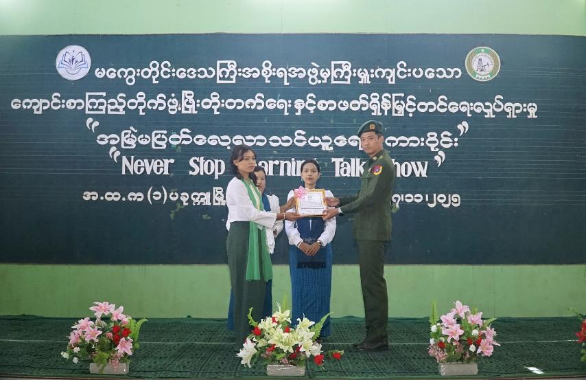 ထို့နောက် ကျောင်းစာကြည့်တိုက်ဖွံ့ဖြိုးတိုးတက်ရေးနှင့် စာဖတ်ရှိန်မြှင့်တင်ရေးလှုပ်ရှားမှုအတွင်း ထည့်သွင်းကျင်းပသော ကျပန်းစကားပြောပြိုင်ပွဲ (အလယ်တန်းအဆင့်) တွင် ပထမ၊ ဒုတိယ၊ တတိယဆုရရှိသူများနှင့် အမြဲမပြတ်လေ့လာသင်ယူရေးစကားဝိုင်း “Never Stop Learning Talk Show” တွင် ပါဝင်ဆွေးနွေးခဲ့ကြသည့် ကျောင်းသား၊ ကျောင်းသူများအား ဂုဏ်ပြုဆုများနှင့် ခရိုင်စီမံခန့်ခွဲရေးနှင့် အုပ်ချုပ်ရေးကော်မတီဥက္ကဋ္ဌ ဦးမြင့်နိုင်၊ ဒုတိယဗိုလ်မှူးကြီး ကျော်ဇေလတ်၊ ခရိုင်ရဲတပ်ဖွဲ့မှူး ဒုတိယရဲမှူးကြီးသန်းဝင်းနှင့် အဖွဲ့ဝင်များကလည်းကောင်း၊ စေတနာရှင်ပြည်သူများ လှူဒါန်းထားသော သုတရသစာအုပ်စာစောင်များကို ကျောင်းစာကြည့်တိုက်တစ်တိုက်လျှင် ၂၅ အုပ်နှုန်းစီဖြင့် အခြေခံပညာကျောင်း (၈) ကျောင်းရှိ တာဝန်ခံကျောင်းအုပ်ကြီးများအား မြို့နယ်စီမံခန့်ခွဲရေးနှင့် အုပ်ချုပ်ရေးကော်မတီဥက္ကဋ္ဌ ဦးအောင်စိုးမိုး၊ ဗိုလ်မှူးသက်ထွန်းနိုင်နှင့် အဖွဲ့ဝင်များကလည်းကောင်း အသီးသီးပေးအပ်ချီးမြှင့်ကြပြီး ဌာနဆိုင်ရာတာဝန်ရှိသူများ၊ ဆရာ၊ ဆရာမများ၊ ကျောင်းသား၊ ကျောင်းသူများနှင့်အတူ ခရိုင်ပြန်ကြားရေးနှင့်ပြည်သူ့ဆက်ဆံရေးဦးစီးဌာနက ခင်းကျင်းပြသထားသည့် စာအုပ်စာစောင်များ၊ လှပသာယာပြည်မြန်မာရောင်စုံဓာတ်ပုံပြဘုတ်နှင့် အမှတ်(၁)အခြေခံပညာအထက်တန်းကျောင်းမှ ကျောင်းသား၊ ကျောင်းသူများ၏ လက်မှုအနုပညာပြပွဲအပါအဝင် အသိပညာပေးနံရံကပ်စာစောင်များကို လှည့်လည်ကြည့်ရှုအားပေးကြသည်။