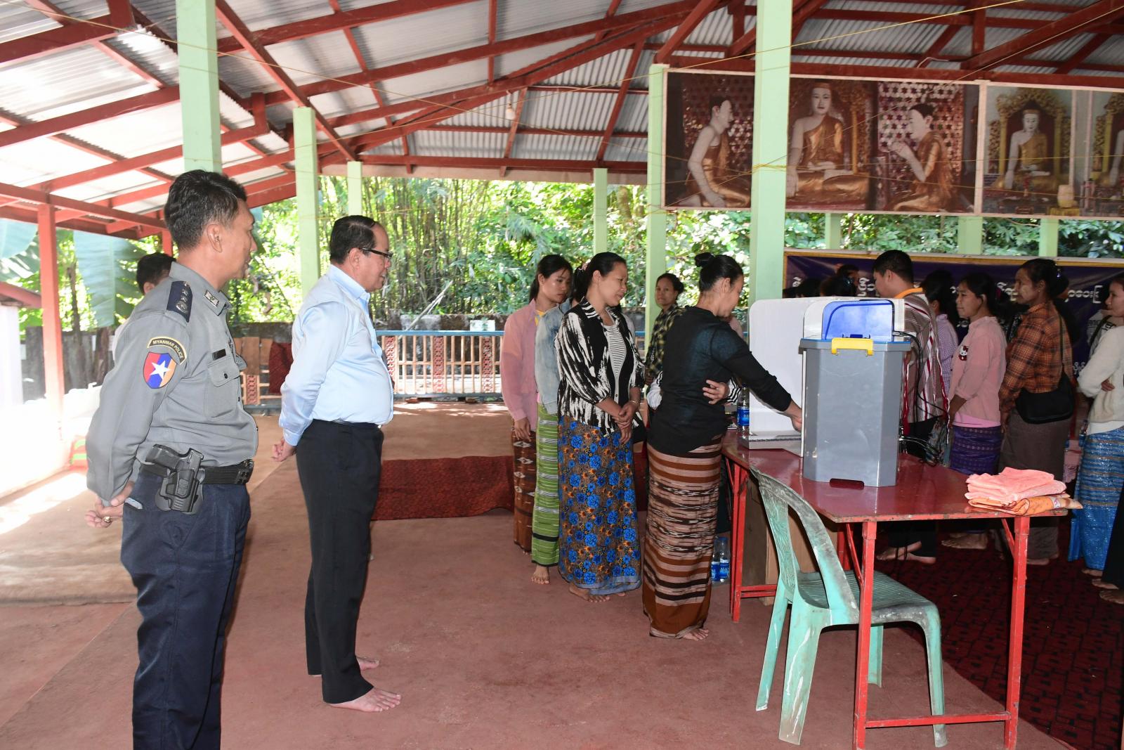ဆက်လက်၍ ပြည်နယ်ဝန်ကြီးချုပ်နှင့်အဖွဲ့သည် ပိုင်ကျုံမြို့ နောင်ဘိုကျေးရွာတွင် ၂၀၂၅ ခုနှစ် ပါတီစုံဒီမိုကရေစီအထွေထွေရွေးကောက်ပွဲ ဆန္ဒမဲပေးခွင့်ရှိသူများမဲပေးခွင့်မဆုံးရှုံးစေရေး သက်ဆိုင်ရာမြေပြင်ကွင်းဆင်းစာရင်း ကောက်ယူရေးအဖွဲ့များက မဲစာရင်းမှန်ကန်ရေး တစ်အိမ်တက်ဆင်းတိုက်ဆိုင်စစ်ဆေးခဲ့ပြီး ပုံစံ၃၊ ပုံစံ ၄၊ ပုံစံ၄(ဂ)များ ဖြင့်တောင်းဆိုကန့်ကွက်ပြင်ဆင်မှုများဆောင်ရွက်နေမှုကို ကြည့်ရှုအားပေးခဲ့ကြကာ အဆိုပါ တိုက်ကျောင်းဓမ္မာရုံတွင် ပိုင်ကျုံမြို့ရွေးကောက်ပွဲကော်မရှင်အဖွဲ့ခွဲမှမဲဆန္ဒရှင်ပြည်သူများအား မဲပေးစက်ဆိုင်ရာအသိပညာပေးဆွေးနွေးဟောပြောနေမှုနှင့် လက်တွေ့စမ်းသပ်မဲပေးနေမှုများကို ကြည့်ရှုအားပေး တာဝန်ရှိသူများအား လိုအပ်သည်များမှာကြားခဲ့ကြောင်း သိရသည်။