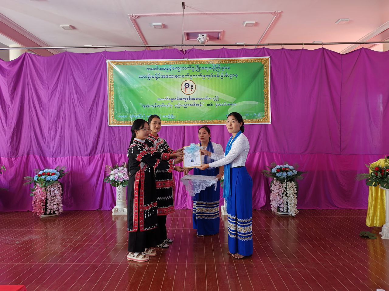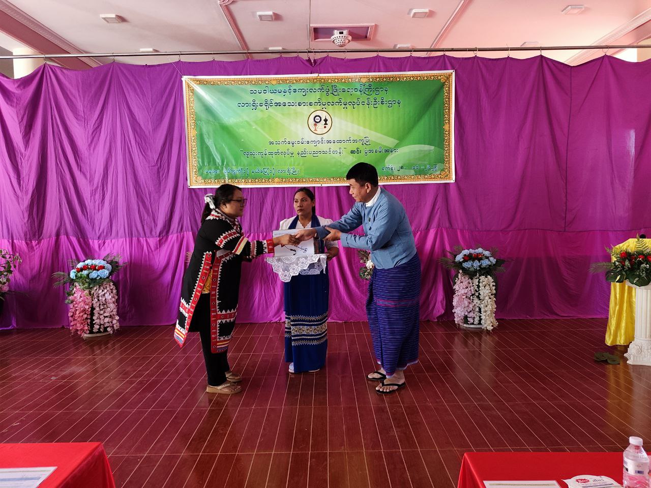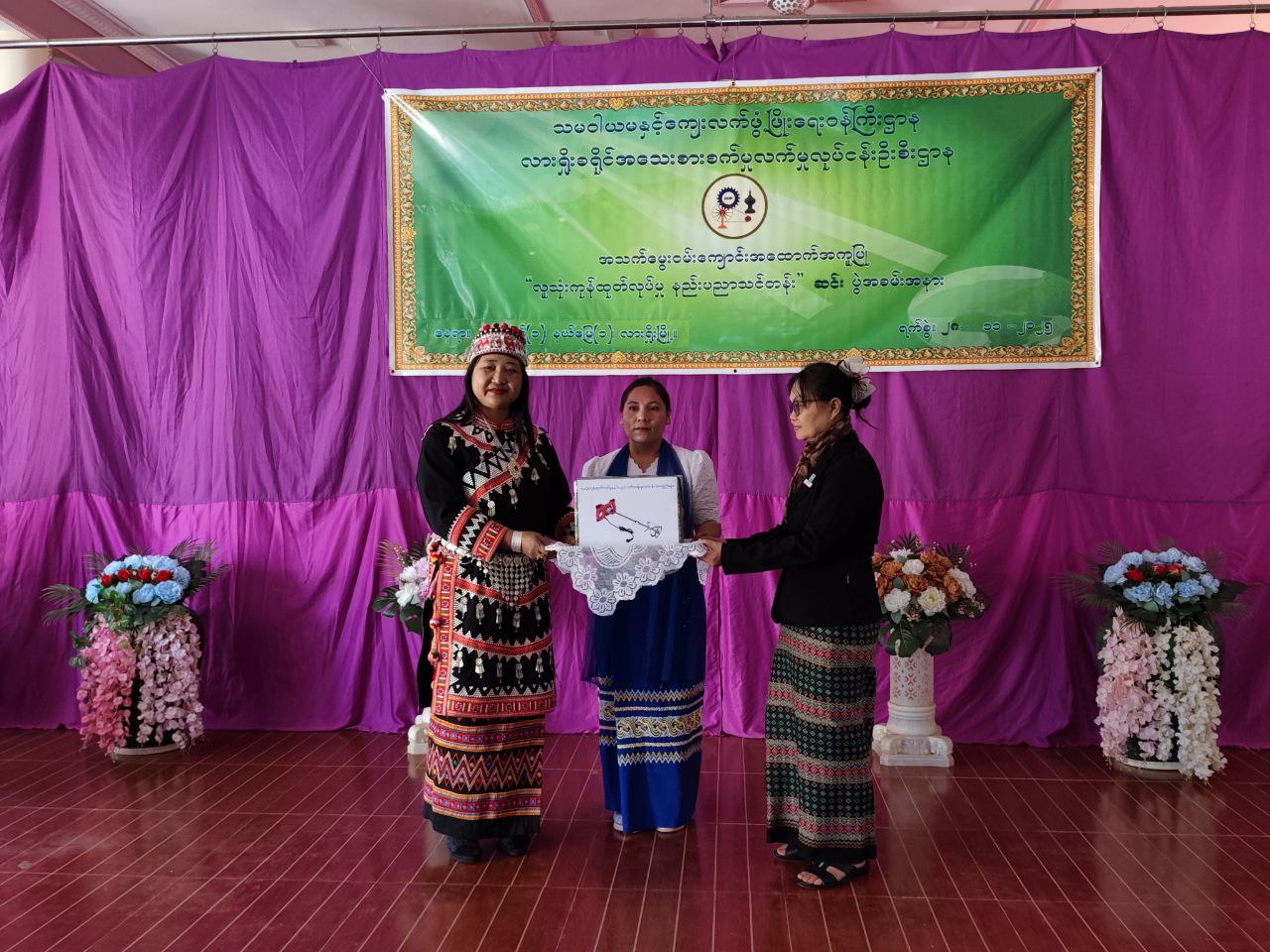 ထို့နောက် ပြည်နယ်ကျေးလက်ဒေသဖွံ့ဖြိုးတိုးတက်ရေးဦးစီးဌာနမှ ဒုတိယညွှန်ကြားရေးမှူးနှင့် ဌာနဆိုင်ရာတာဝန်ရှိသူများက လူသုံးကုန်ထုတ်လုပ်မှုနည်းပညာသင်တန်းအတွက် သင်သန်းသား၊ သင်တန်းသူများလက်ဝယ်သို့ ကုန်ချောပစ္စည်းများ၊ သင်တန်းဆင်းလက်မှတ်နှင့် သင်တန်းတွင်ထူးချွန်စွာ အောင်မြင်သည့် သင်တန်းသားသင်တန်းသူ ၃ ဦးကို လုပ်ငန်းစတင်လည်ပတ်ရန်အတွက် လုပ်ငန်းသုံးပစ္စည်းများ ချီးမြှင့်ပေးအပ်သည်။