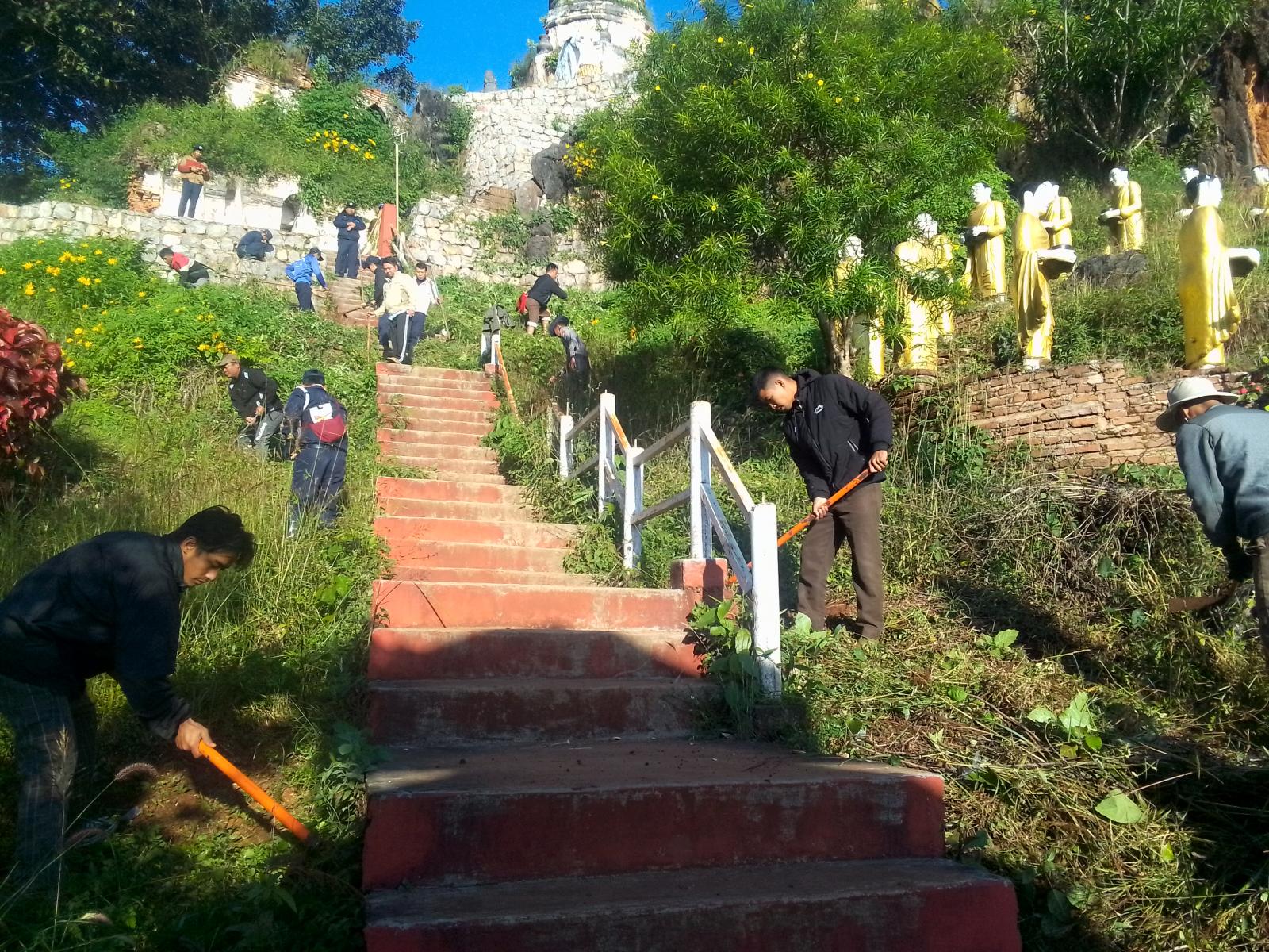 ရှမ်းပြည်နယ်(တောင်ပိုင်း)၊ နမ့်စန်ခရိုင်၊ မိုးနဲမြို့နယ်အား ဒုတိယပုဂံဟု တင်စားခေါ်ဝေါ်ရသည်အထိ ဘုရားစေတီပုထိုးများ များပြားလျက်ရှိရာ ခရီးသွားဧည့်သည်များအား ဆွဲဆောင်နိုင်ရေးနှင့် မြို့သန့်ရှင်းသာယာလှပစေရေး ဌာနဆိုင်ရာများ ပြည်သူများပူးပေါင်းကာ အပတ်စဉ် ဝိုင်းဝန်းဆောင်ရွက်လျက်ရှိရာ ယနေ့နံနက် ၇ နာရီခွဲအချိန်တွင် ဆင်တောင်(လွိုင်စန့်)စေတီဘုရား၌ ဆောင်ရွက်ခဲ့ကြောင်း သိရသည်။