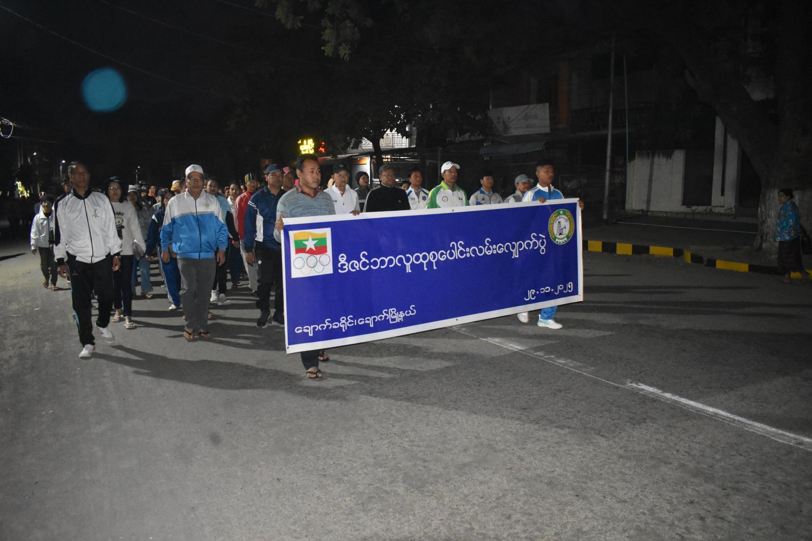 စုပေါင်းလမ်းလျှောက်ပွဲတွင် ခရိုင်စီမံခန့်ခွဲရေးနှင့်အုပ်ချုပ်ရေးကော်မတီဥက္ကဋ္ဌ ဦးမိုးဇော်နိုင်နှင့် အဖွဲ့ဝင်များ၊ မြို့နယ်စီမံခန့်ခွဲရေးနှင့်အုပ်ချုပ်ရေးကော်မတီဥက္ကဋ္ဌ ဦးစိုးလွင်နှင့် အဖွဲ့ဝင်များ၊ ခရိုင်/မြို့နယ်အဆင့်ဌာနဆိုင်ရာတာဝန်ရှိသူများနှင့် ဝန်ထမ်းများ၊ ဆရာ၊ ဆရာမများ၊ ရပ်ကွက်အုပ်ချုပ်ရေးမှူးများ၊ ဘင်ခရာအဖွဲ့နှင့် အားကစားစိတ်ဝင်စားသည့် ပြည်သူများ စုစုပေါင်း ၅၄၀ ဦးက စုရပ်မှ စတင်လမ်းလျှောက်ခဲ့ကြရာ အမှတ်(၁၀)ရပ်ကွက် အေးစေတီကွင်းအထိ စုပေါင်းလမ်းလျှောက်ခဲ့ကြပြီး အေးစေတီကွင်းအတွင်း၌ စုပေါင်းကိုယ်လက်ကြံ့ခိုင်ရေးလေ့ကျင့်ခန်းအတွဲ(၁)၊ (၂)ဖြင့် ကိုယ်လက်လှုပ်ရှား ဆောင်ရွက်ခဲ့ကြကြောင်း သိရသည်။