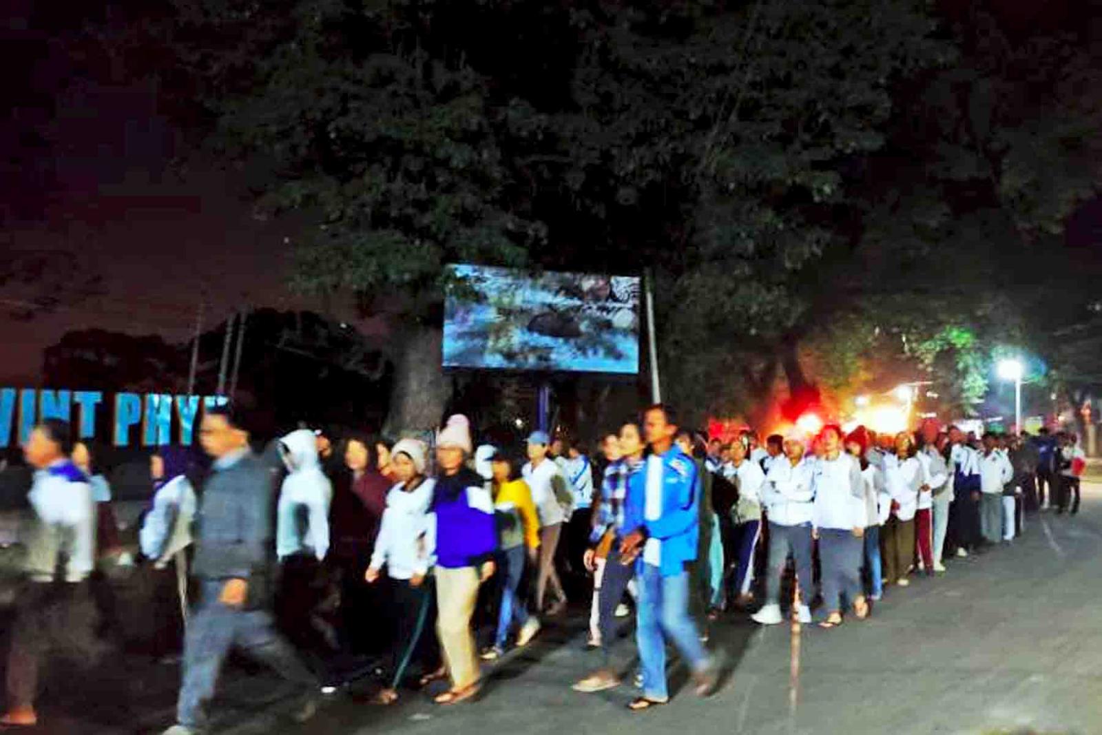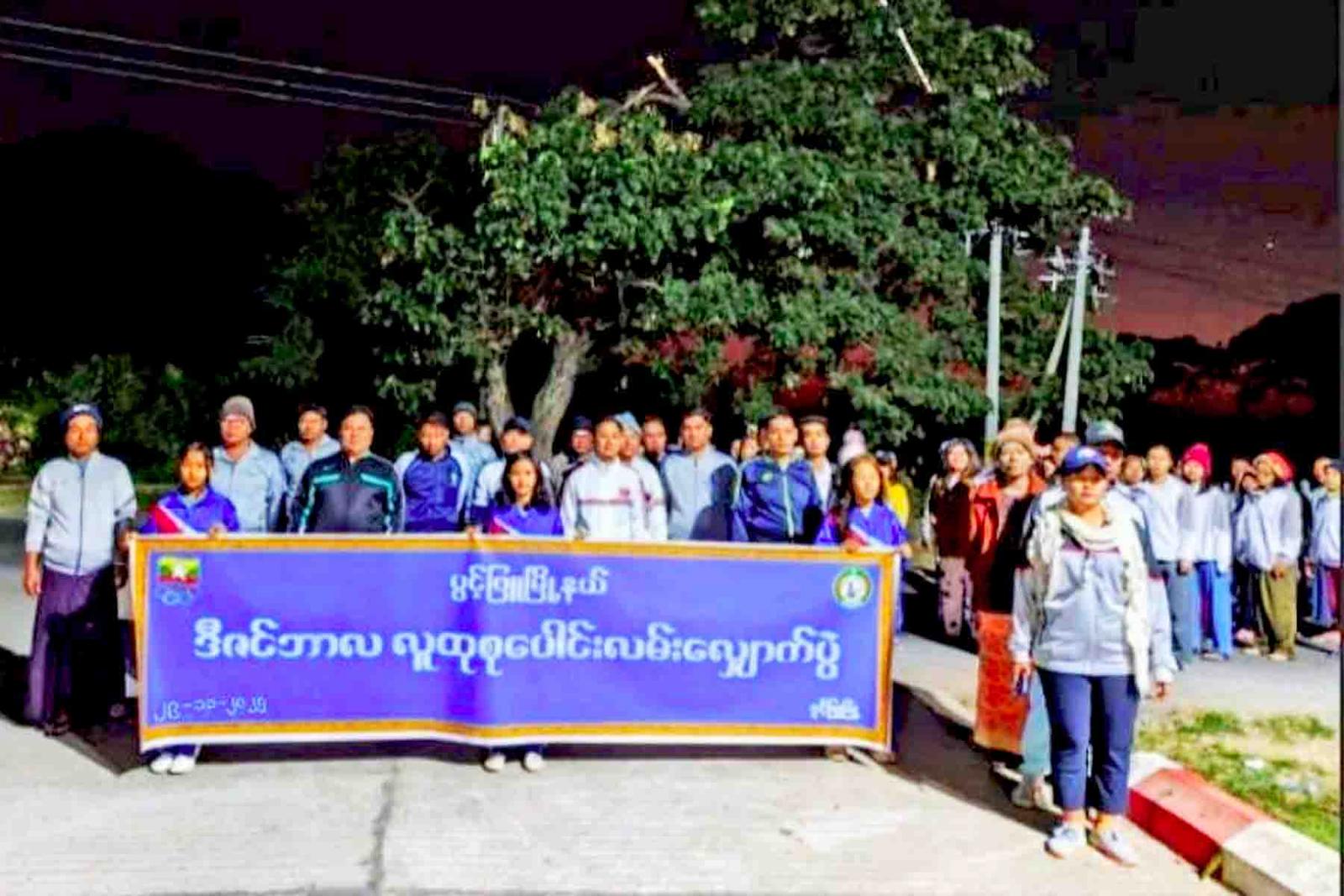ရှေးဦးစွာ မြို့နယ်စီမံခန့်ခွဲရေးနှင့် အုပ်ချုပ်ရေးကော်မတီဥက္ကဋ္ဌနှင့် စုပေါင်းလမ်းလျှောက်ပွဲ ပါဝင်ဆင်နွှဲကြသူများက စုရပ်ဖြစ်သည့် မြို့နယ်အထွေထွေအုပ်ချုပ်ရေးဦးစီးဌာနရုံးရှေ့မှ မြို့ပတ်လမ်း လေးတိုင်စင်လမ်းဆုံအထိ စုပေါင်းလမ်းလျှောက်ခဲ့ကြပြီး ထို့မှတစ်ဆင့် မြို့နယ်ပြည်သူ့အားကစားကွင်းသို့ ပြန်လည်ဝင်ရောက်ခဲ့ကာ မြို့နယ်အားကစားနှင့် ကာယပညာဦးစီးဌာန၏ ဦးဆောင်မှုဖြင့် အကြော့လျှော့လေ့ကျင့်ခန်းများနှင့် ကိုယ်လက်ကြံ့ခိုင်ရေး လေ့ကျင့်ခန်းများကို တစ်ပျော်တစ်ပါး စုပေါင်းဆောင်ရွက်ခဲ့ကြသည်။
