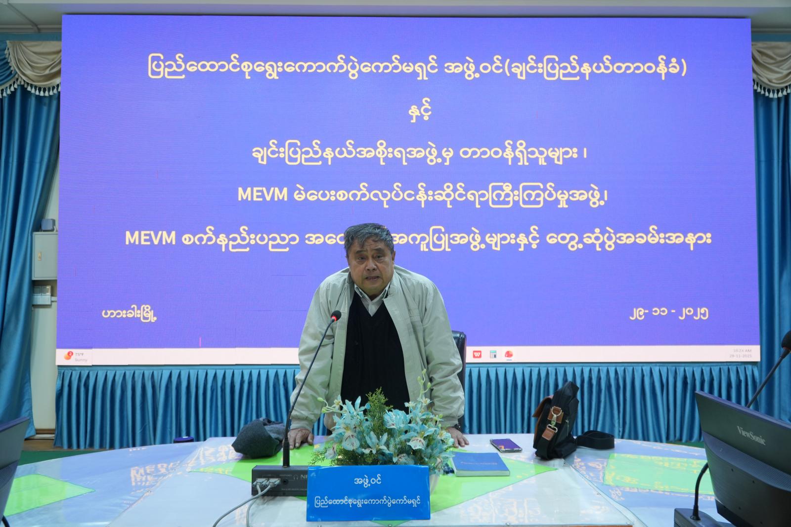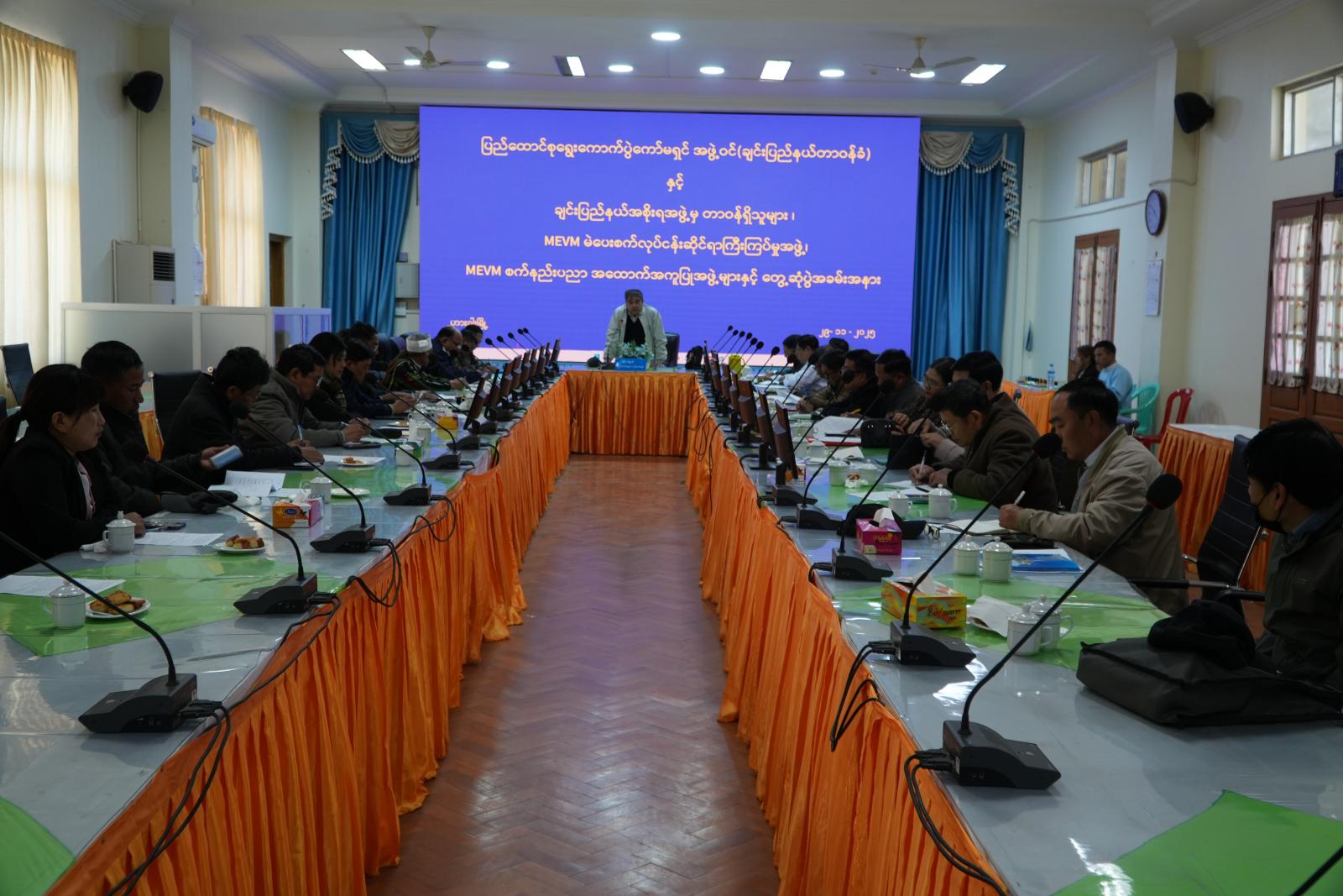 ဦးစွာ ပြည်ထောင်စုရွေးကောက်ပွဲကော်မရှင်အဖွဲ့ဝင် ချင်းပြည်နယ်တာဝန်ခံ ဦးအောင်မိုးမြင့်က MEVM မဲပေးစက်လုပ်ငန်းဆိုင်ရာကြီးကြပ်မှုအဖွဲ့နှင့် နည်းပညာအထောက်အကူပြုအဖွဲ့များ ဖွဲ့စည်းပြီး လုပ်ငန်းများ လည်ပတ်ဆောင်ရွက်လျှက်ရှိသည်ကို တွေ့ရှိရပါကြောင်း၊ MEVM မဲပေးစက် လုပ်ငန်းဆိုင်ရာကြီးကြပ်မှုအဖွဲ့သည် မဲပေးစက်များ သယ်ယူပို့ဆောင်ရေးလုပ်ငန်းများကို ကြီးကြပ်ကန့်သတ်ပစ္စည်းတစ်ခုအနေနှင့် ကြီးကြပ်ဆောင်ရွက်ရမှာဖြစ်ပြီး နည်းပညာ အထောက်အကူပြုအဖွဲ့ များအနေဖြင့် MEVM မဲပေးစက်နှင့် စက်စပ်ပစ္စည်းများနှင့်ပတ်သက်၍ လိုအပ်သည့် အကူအညီများ ပေးနိုင်အောင် တာဝန်ယူဆောင်ရွက်ပေးသွားမည်ဖြစ်ကြောင်း ၊ MEVM မဲပေးစက်သည် မဲမသမာမှု မဖြစ်အောင် ရည်ရွယ်ပြုလုပ်ခဲ့ခြင်းဖြစ်ကြောင်း၊ ကြီးကြပ်မှုအဖွဲ့နှင့် အထောက်အကူပြုအဖွဲ့များ အနေဖြင့် ချို့ယွင်းချက်၊ အားနည်းချက်မရှိအောင် အားလုံးဝိုင်းဝန်းပူးပေါင်းဆောင်ရွက်ပေးကြရန် လိုအပ်ကြောင်းဖြင့် အမှာစကားပြောကြားသည်။