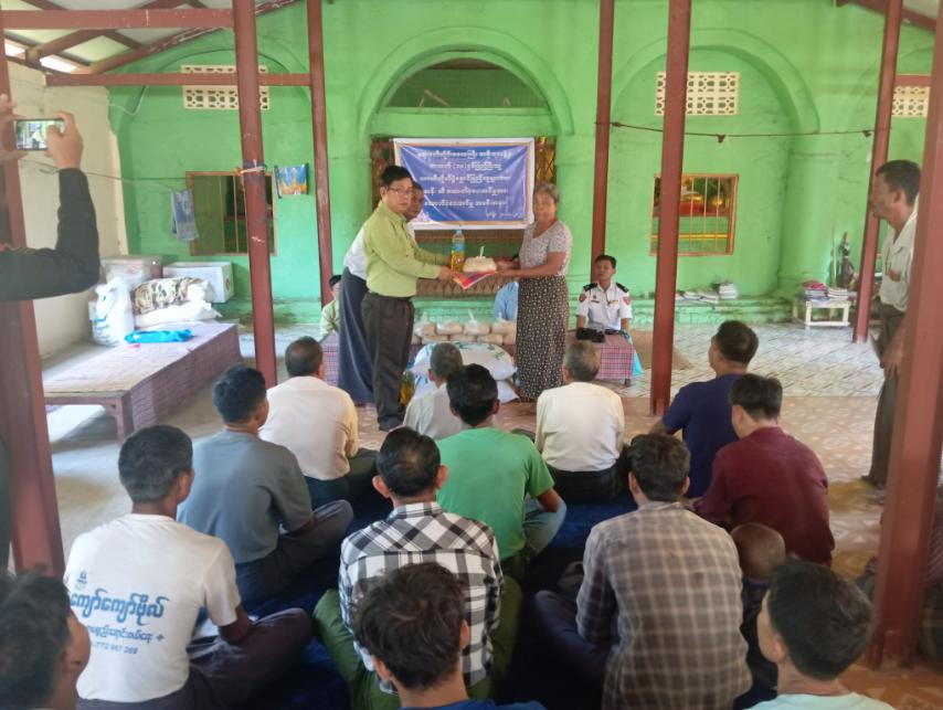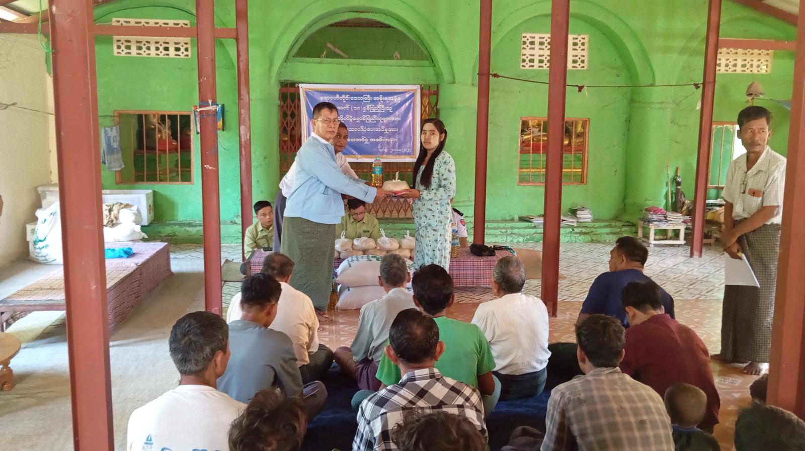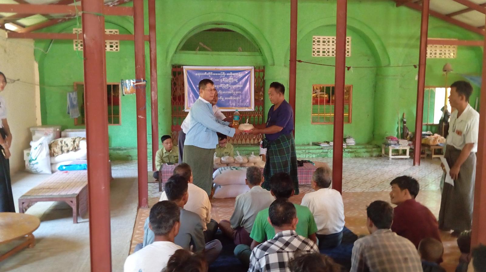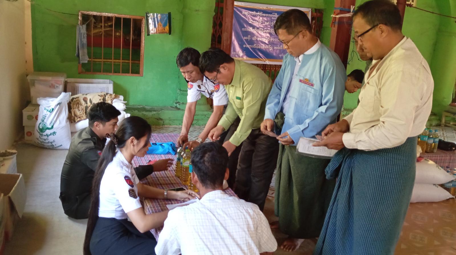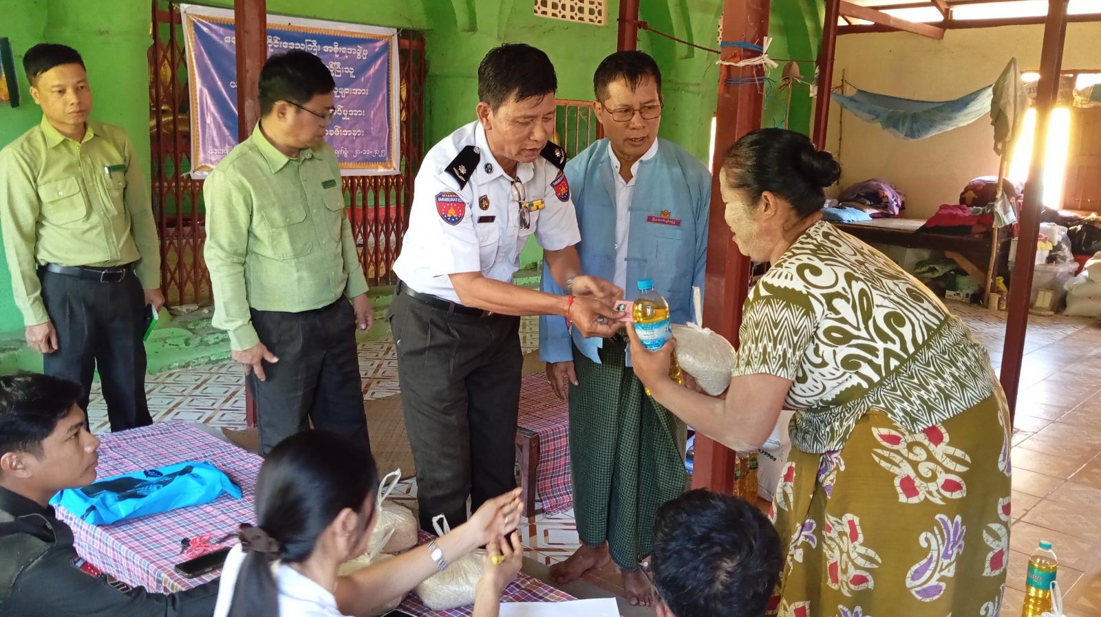 ရှေးဦးစွာ မြို့နယ်စီမံခန့်ခွဲရေးနှင့် အုပ်ချုပ်ရေးကော်မတီဥက္ကဋ္ဌ မြို့နယ်အုပ်ချုပ်ရေးမှူး ဦးမြသိန်းမောင်က ယာယီနေရပ်စွန့်ခွာပြည်သူများအား ဆန်နှင့်ဆီများ ပေးအပ်ရခြင်းနှင့်ပတ်သက်၍ ရှင်းလင်းပြောကြားခဲ့သည်။ ဆက်လက်၍ မြို့နယ်အုပ်ချုပ်ရေးမှူး ဦးမြသိန်းမောင်နှင့် တာဝန်ရှိသူများက ယာယီနေရပ်စွန့်ခွာပြည်သူ (၆၆)ဦးအား တစ်ဦးလျင် ဆန် (၁)ပြည်နှင့် ဆီ (၅၀)သား လက်ဝယ်အရောက် ပေးအပ်ခဲ့ပြီး အသက် (၁၈)နှစ်နှင့် အထက်ရှိ ပြည်သူများ ဆန္ဒမဲပေးနိုင်ရေး နိုင်ငံသားစိစစ်ရေးကတ်နှင့် အိမ်ထောင်စုစာရင်းများ တိုက်ဆိုင်စစ်ဆေးပေးခဲ့ပြီး ယာယီနေရပ်စွန့်ခွာပြည်သူများအား ရင်းရင်းနှီးနှီးတွေ့ဆုံခဲ့၍ လိုအပ်ချက်များအား သက်ဆိုင်ရာဌာနများနှင့် ပူးပေါင်ညှိနှိုင်းဆောင်ရွက်ပေးခဲ့ကြောင်း သိရသည်။